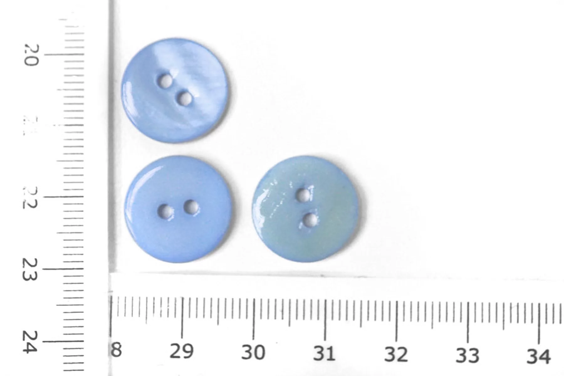 Пуговица из перламутра, небесно-голубого цвета с зеленоватыми переливами с обратной стороны, размер 15 мм. Пуговицы из натурального перламутра, хрупкие, скалываются при падении с высоты или при сильном сжатии.