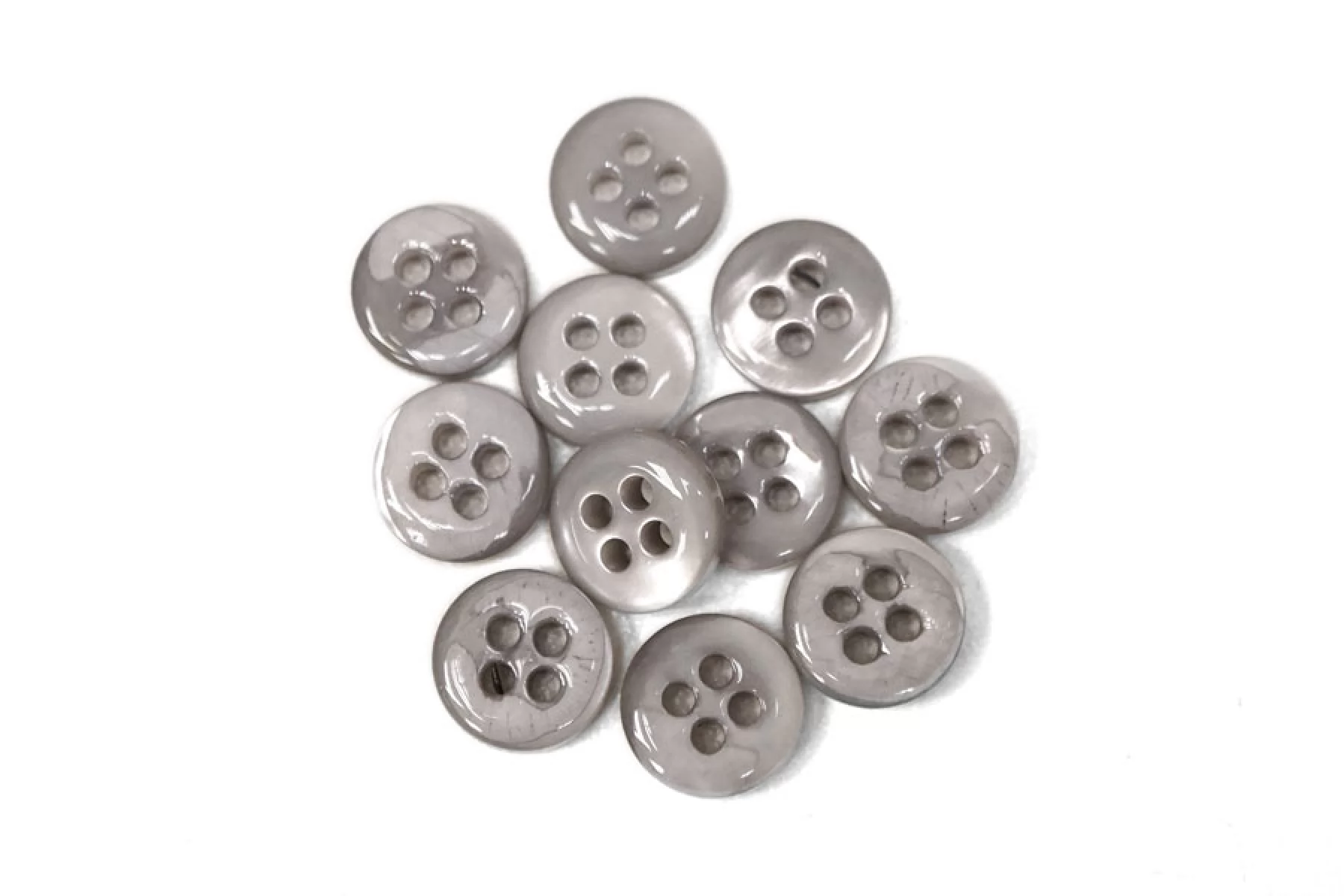 Пуговица серая из перламутра, размер 10 мм. Пуговицы из натурального перламутра, хрупкие, скалываются при падении с высоты или при сильном сжатии.