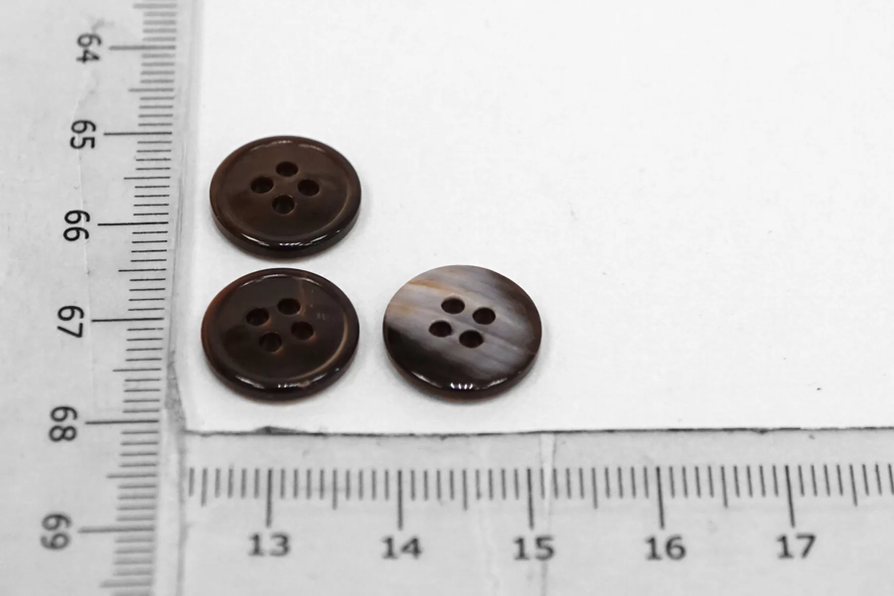 Пуговица коричневая из перламутра, размер 13 мм. Пуговицы из натурального перламутра, хрупкие, скалываются при падении с высоты или при сильном сжатии.