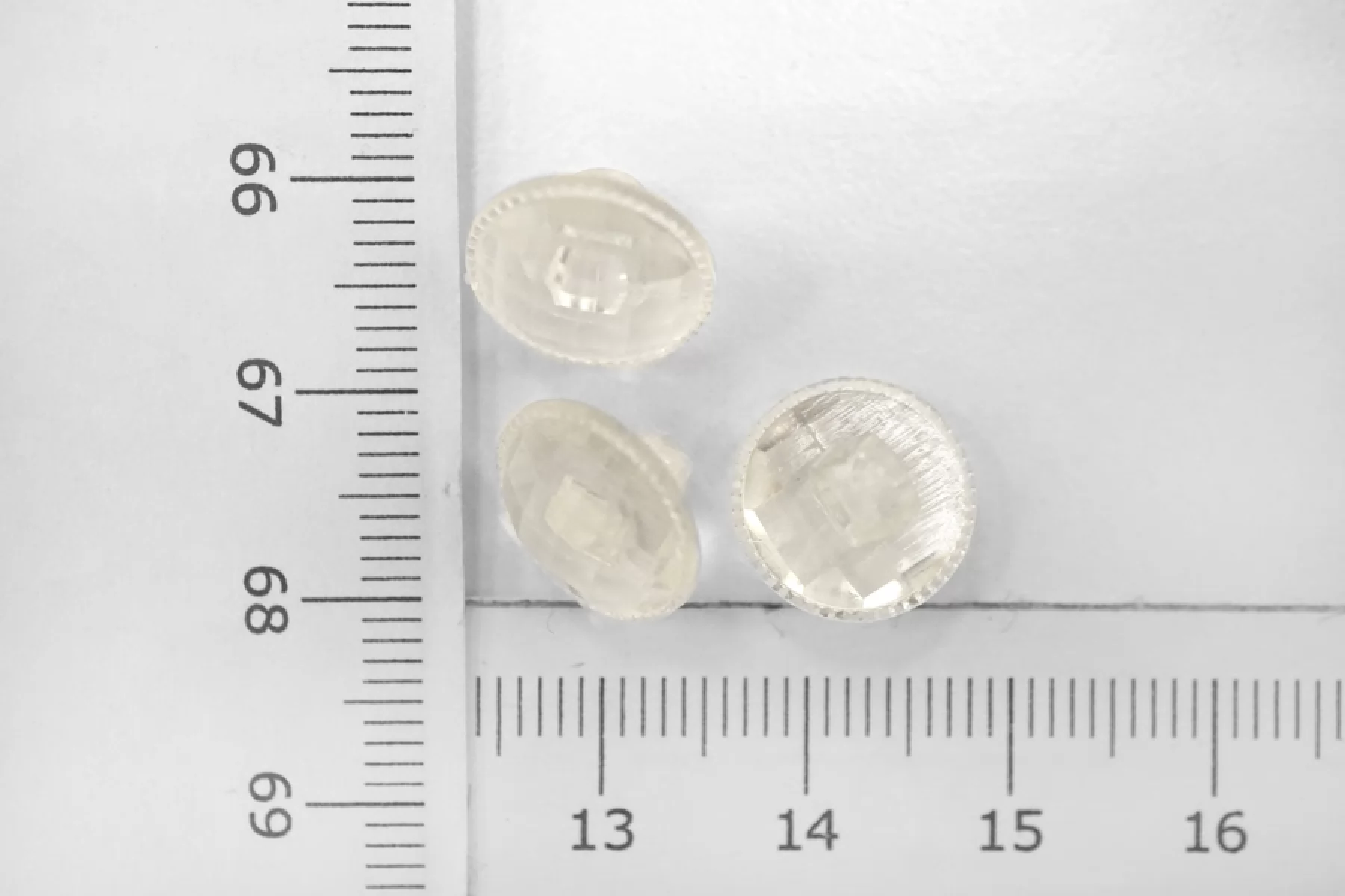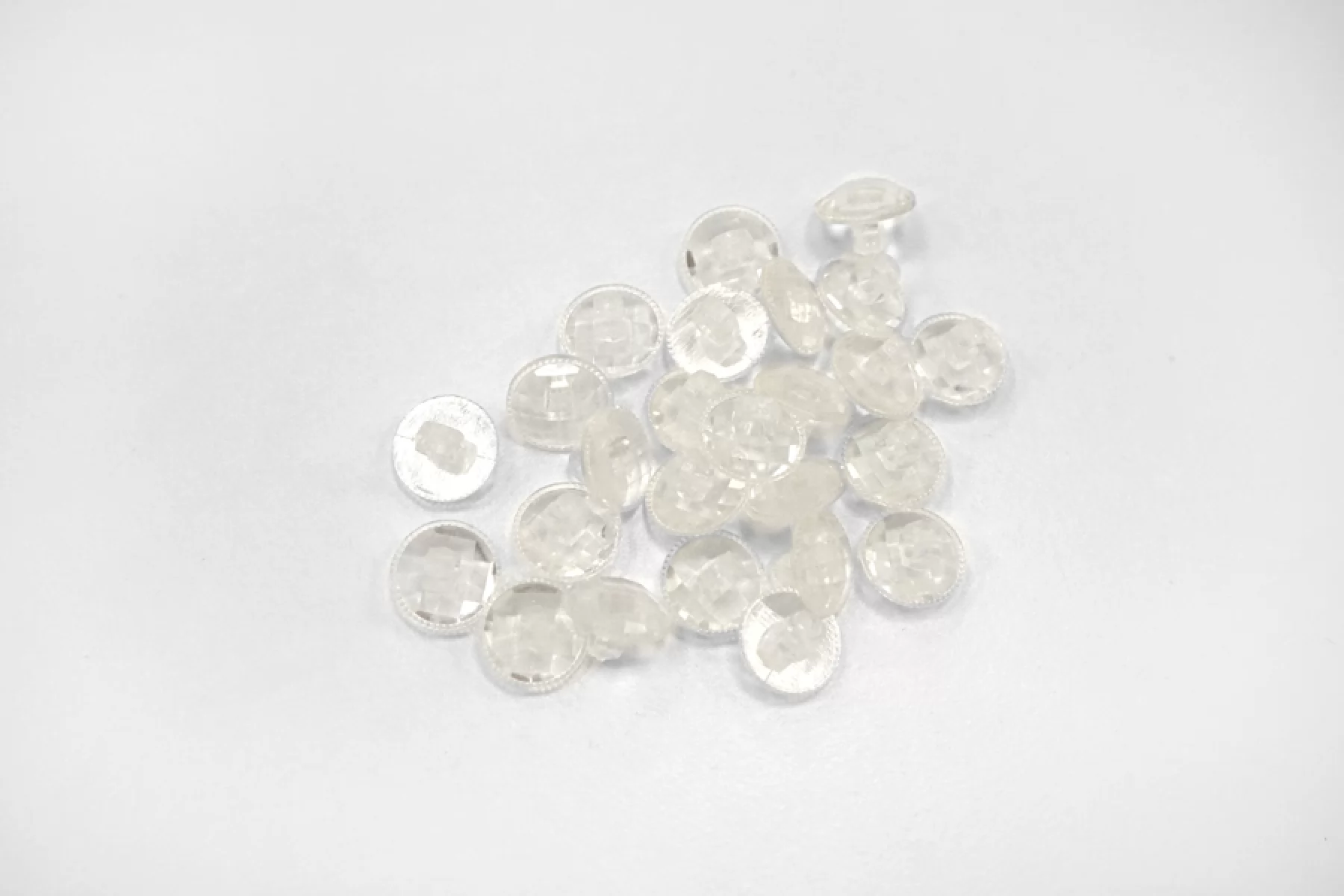 Пуговица рубашечно-плательная из пластика, прозрачная, переливается благодаря множеству граней. Диаметр - 10 мм.