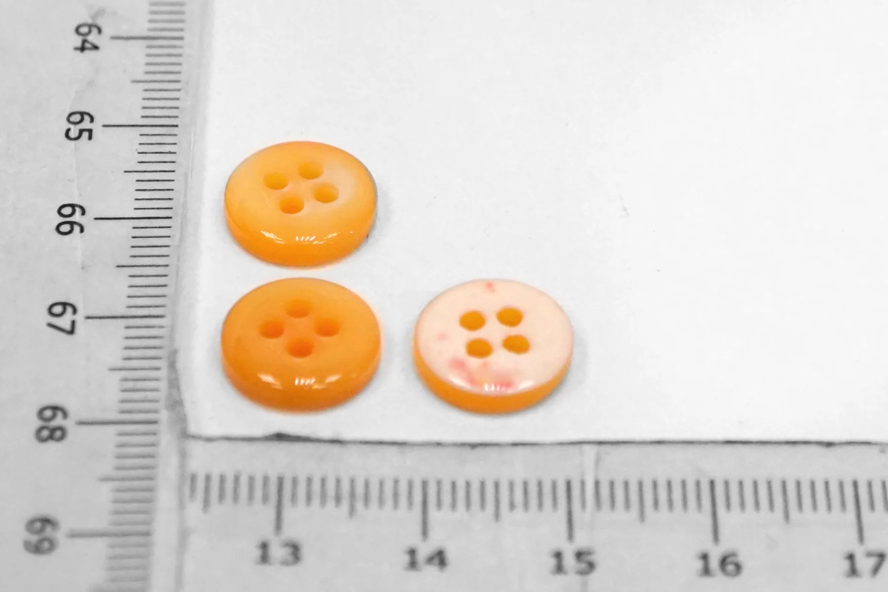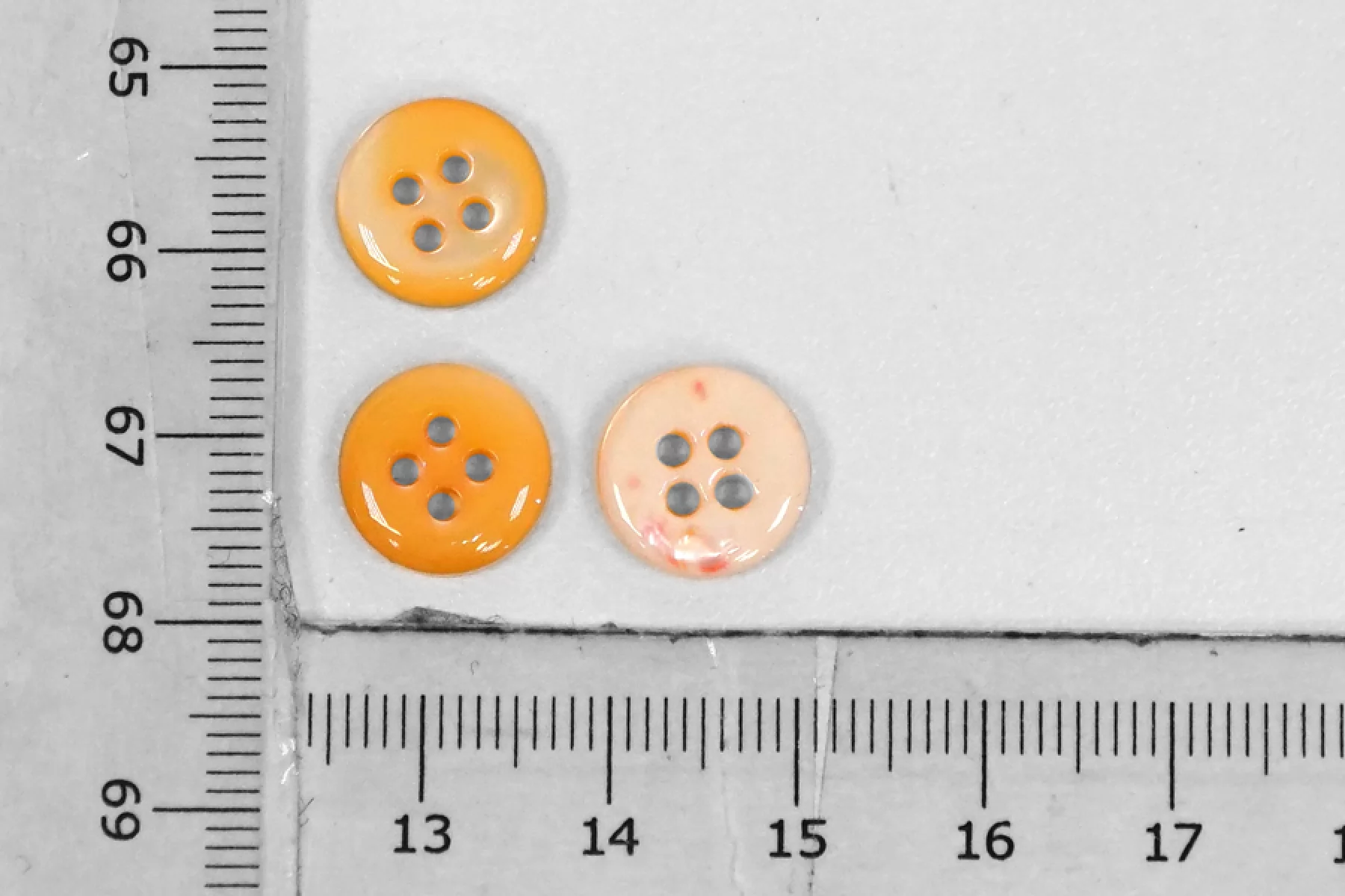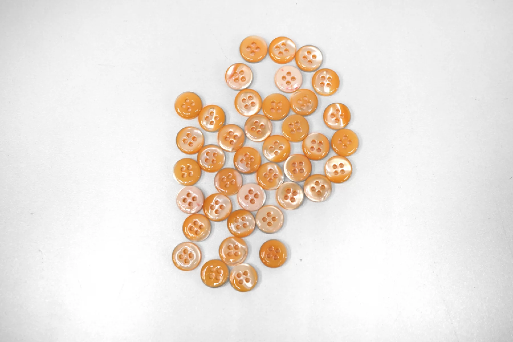Пуговица рубашечно-плательная из перламутра, размер 11мм, бело-оранжевого цвета. Пуговицы из натурального перламутра хрупкие, могут сломаться при падении с высоты или при сильном сжатии.
