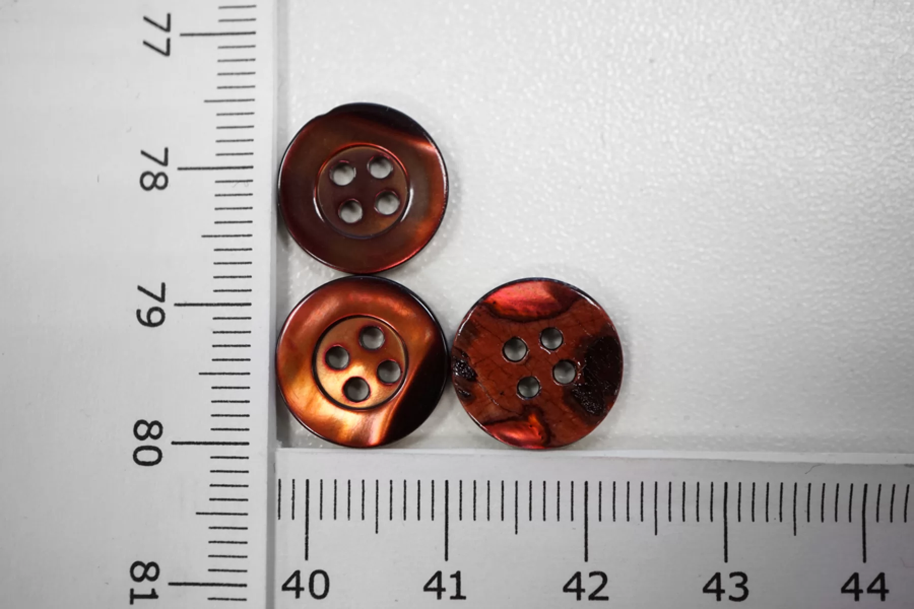 Пуговица рубашечно-плательная из перламутра, размер 11 мм, темного красно-коричнево-черного цвета. Пуговицы из натурального перламутра хрупкие, могут сломаться при падении с высоты или при сильном сжатии.