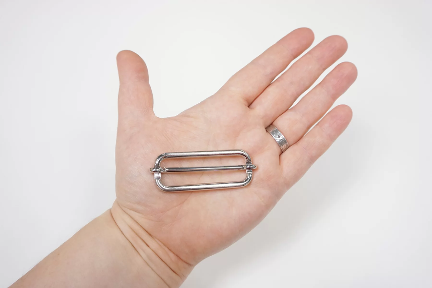 Прямоугольный регулятор для ремня из серебристого металла, можно использовать в качестве пряжки. Размер отверстия 50х15 мм.