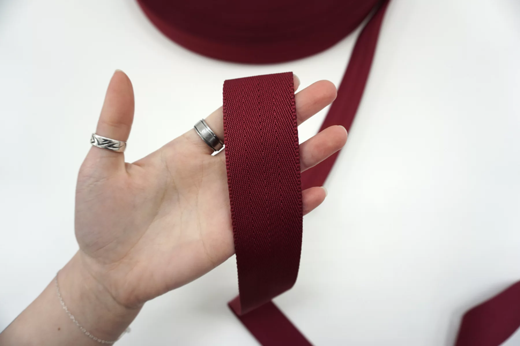 Ременная лента темно-красного цвета, шириной 4 см, плотная, не тянется. Подойдет для отделки ремешков, сумок и аксессуаров.