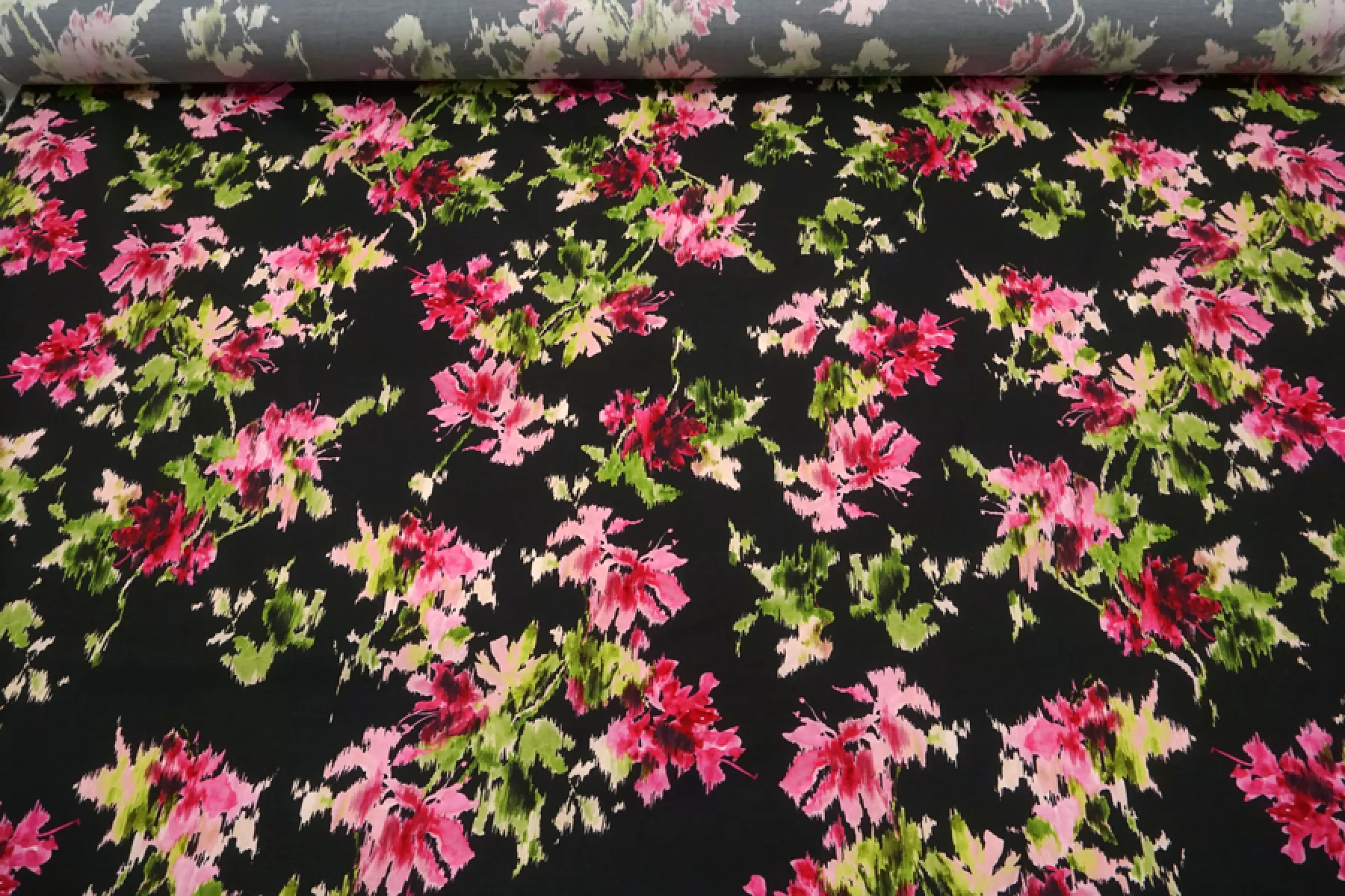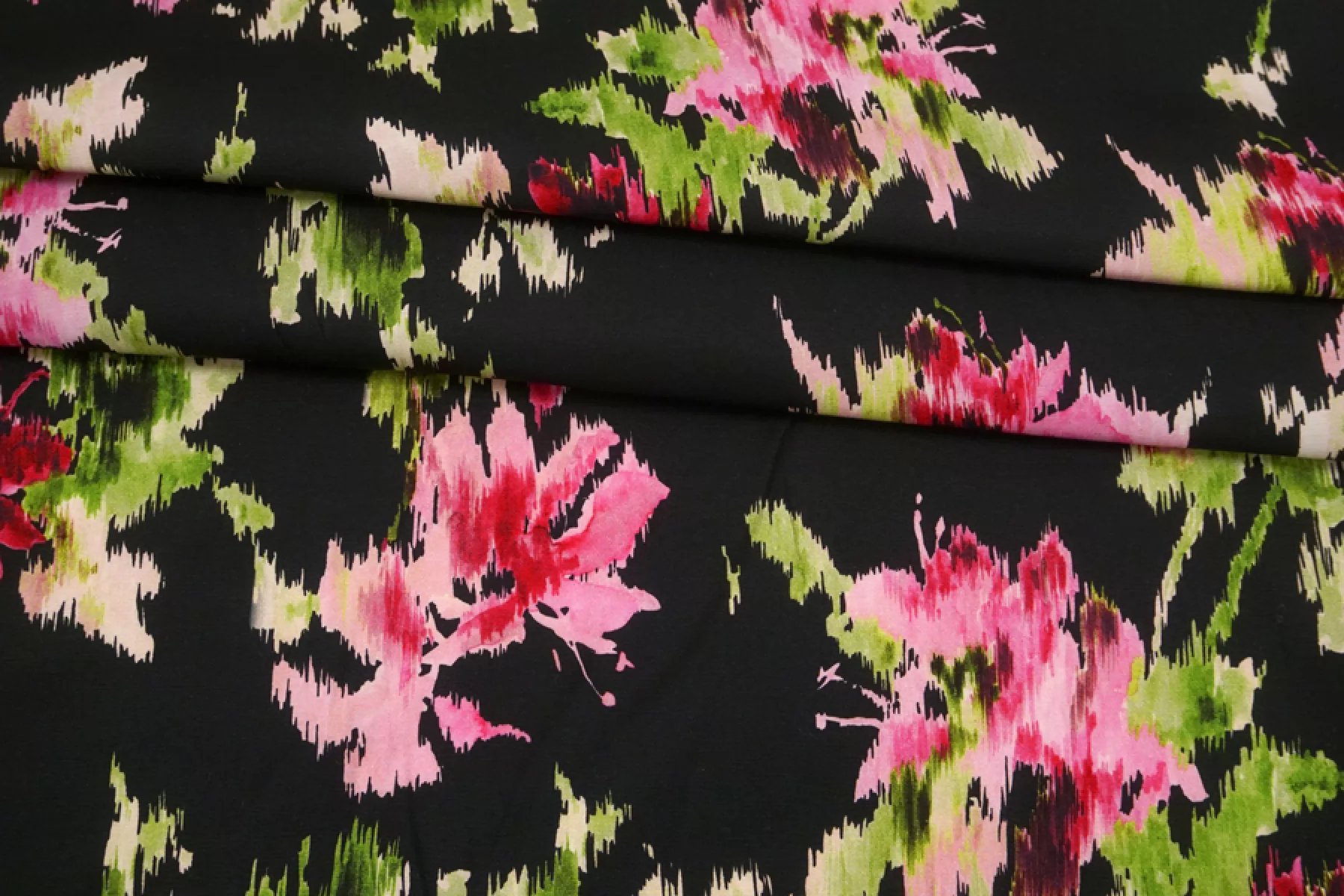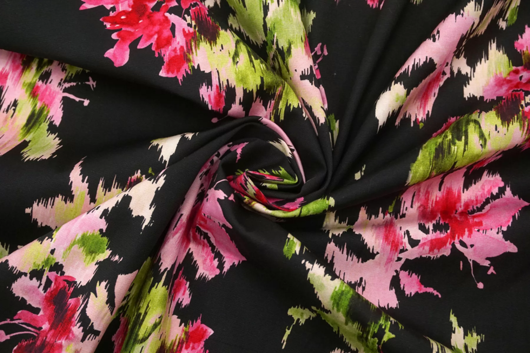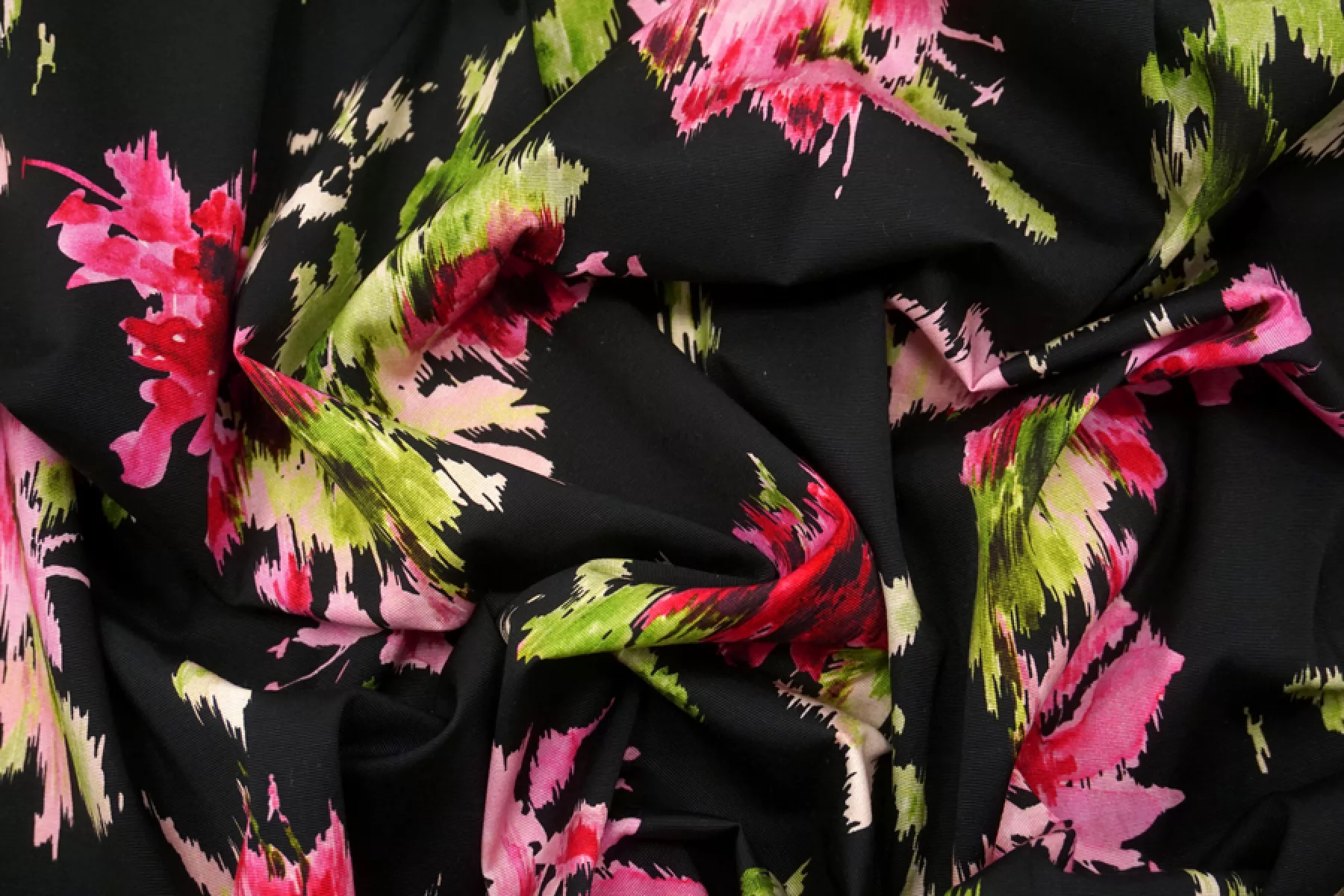 Итальянский хлопок с добавлением вискозы, плетение репсовое, принт цветочный, выполнен в черно-розовых тонах. Тянется, не просвечивает, пластичная, но при этом держит форму. Подойдет для пошива джинсовки, жакета.
