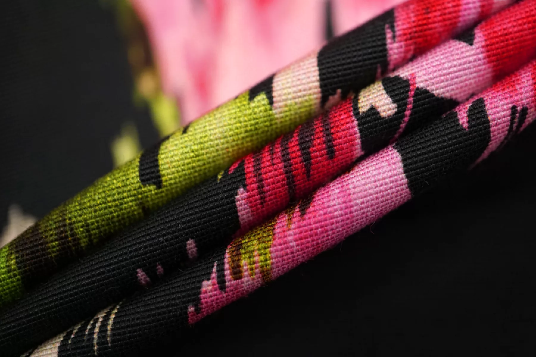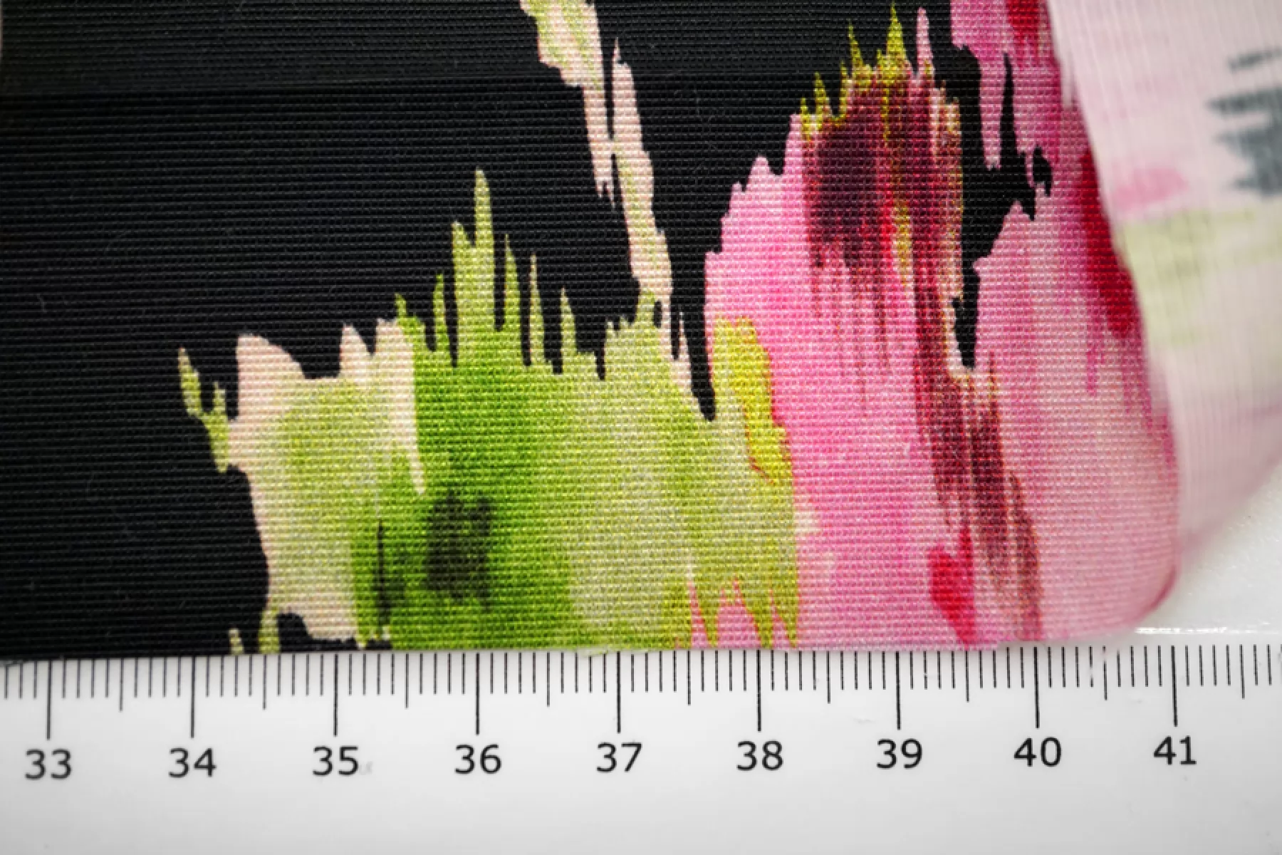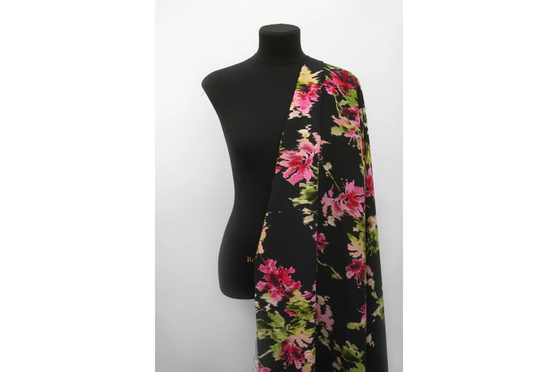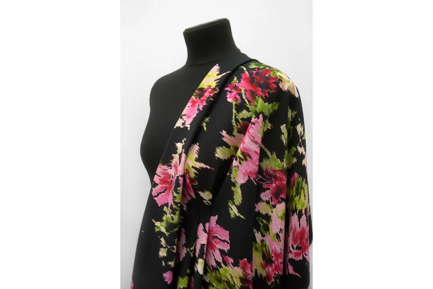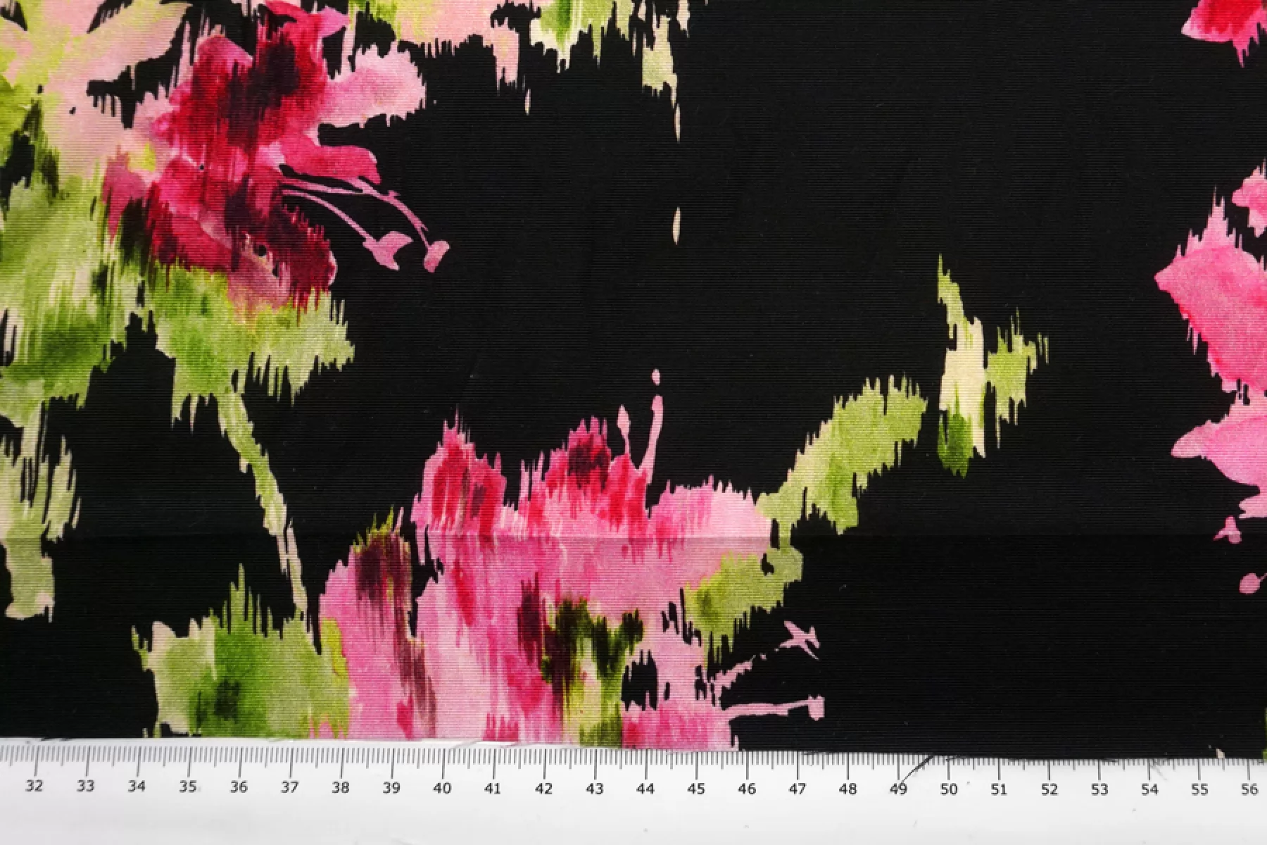 Итальянский хлопок с добавлением вискозы, плетение репсовое, принт цветочный, выполнен в черно-розовых тонах. Тянется, не просвечивает, пластичная, но при этом держит форму. Подойдет для пошива джинсовки, жакета.