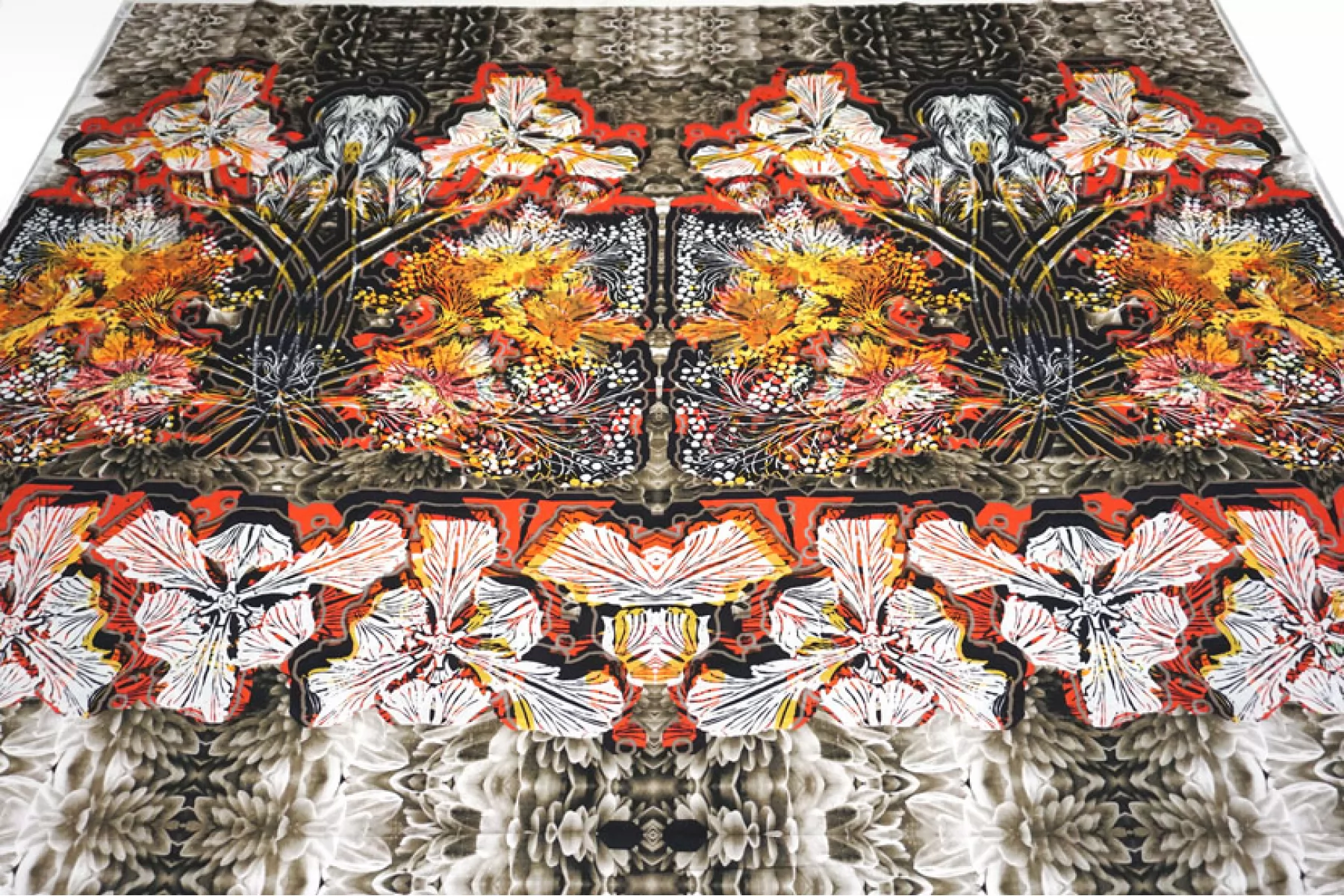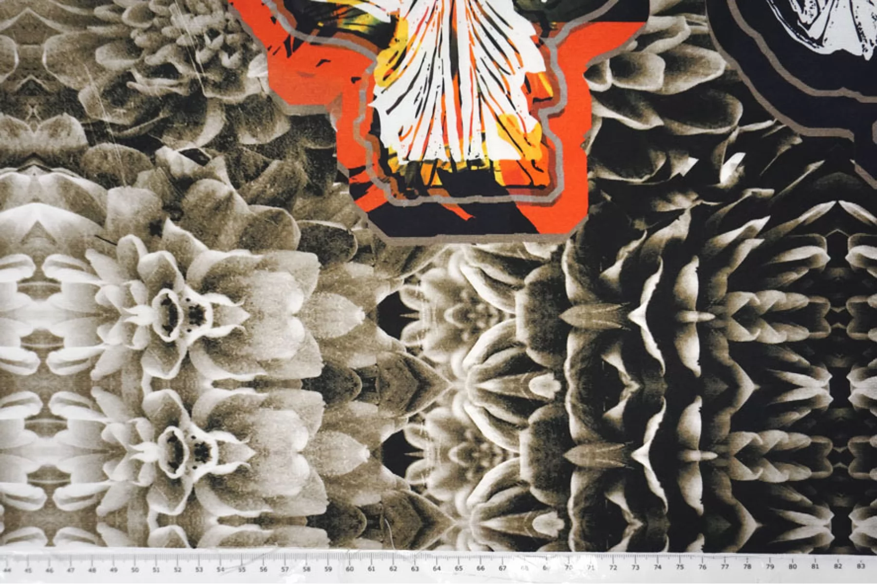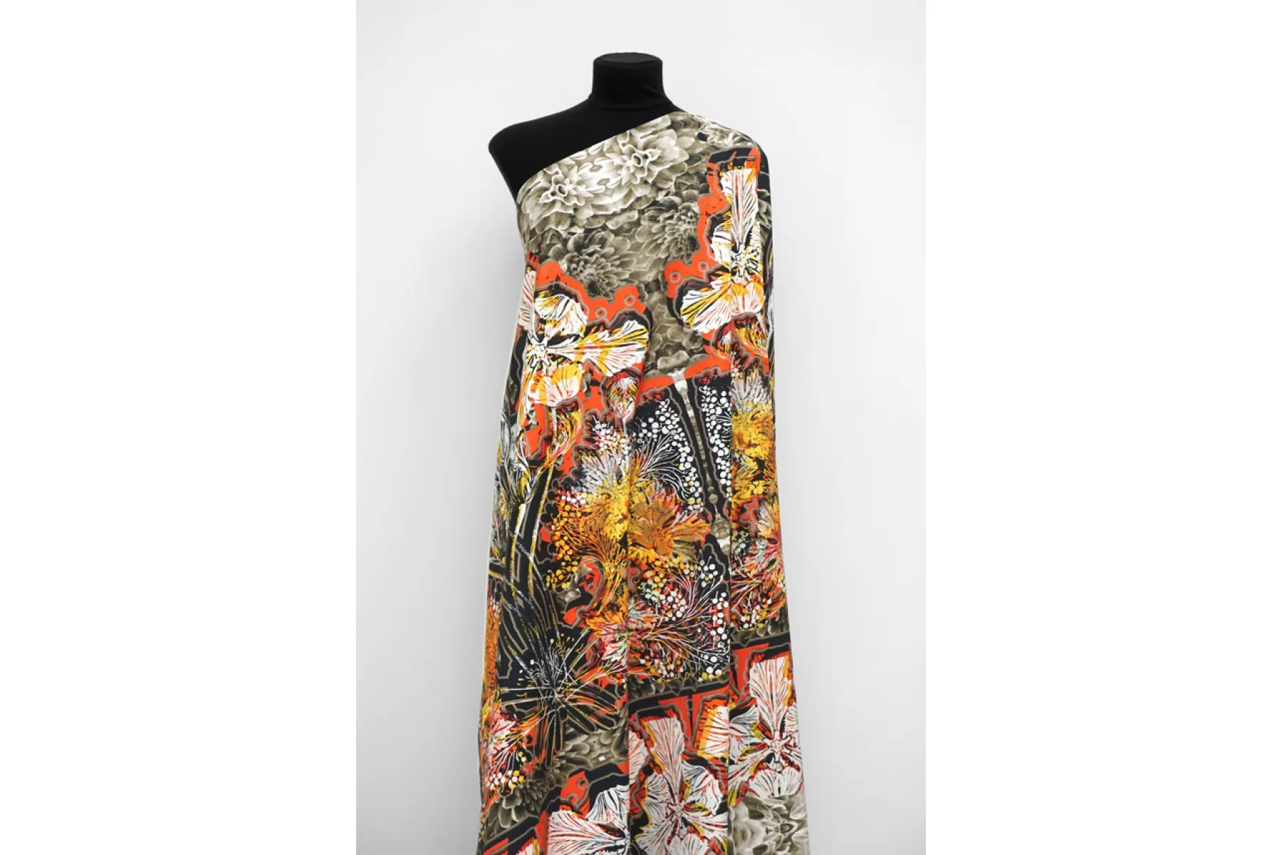 ВНИМАНИЕ! Ткань купонная, длина купона 127 см, цена за купон - 2667 руб. Очень необычная позиция - костюмно-плательный репс DIOR хлопковый с добавлением вискозы, абстрактный цветочный принт на черном фоне с добавлением желтых и оранжевых тонов. Тактильно приятный, плотный, слегка ощущается плетение. Драпируется и держит форму. Неплохо и упруго тянется за счет эластана. Не мнется. Не просвечивает. Прекрасный вариант на рубашки, костюмы, платья и юбки. Учитывайте усадку материала.