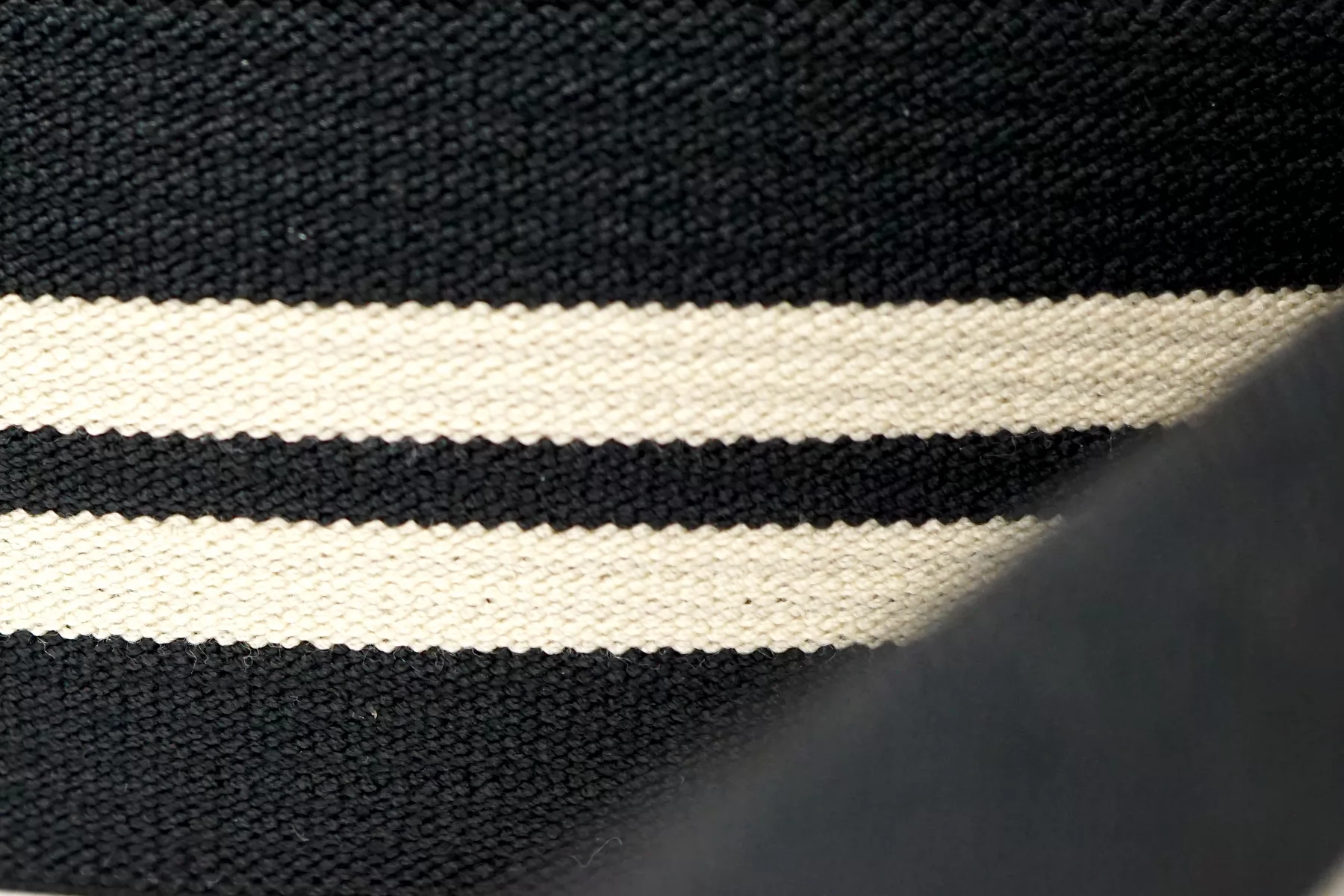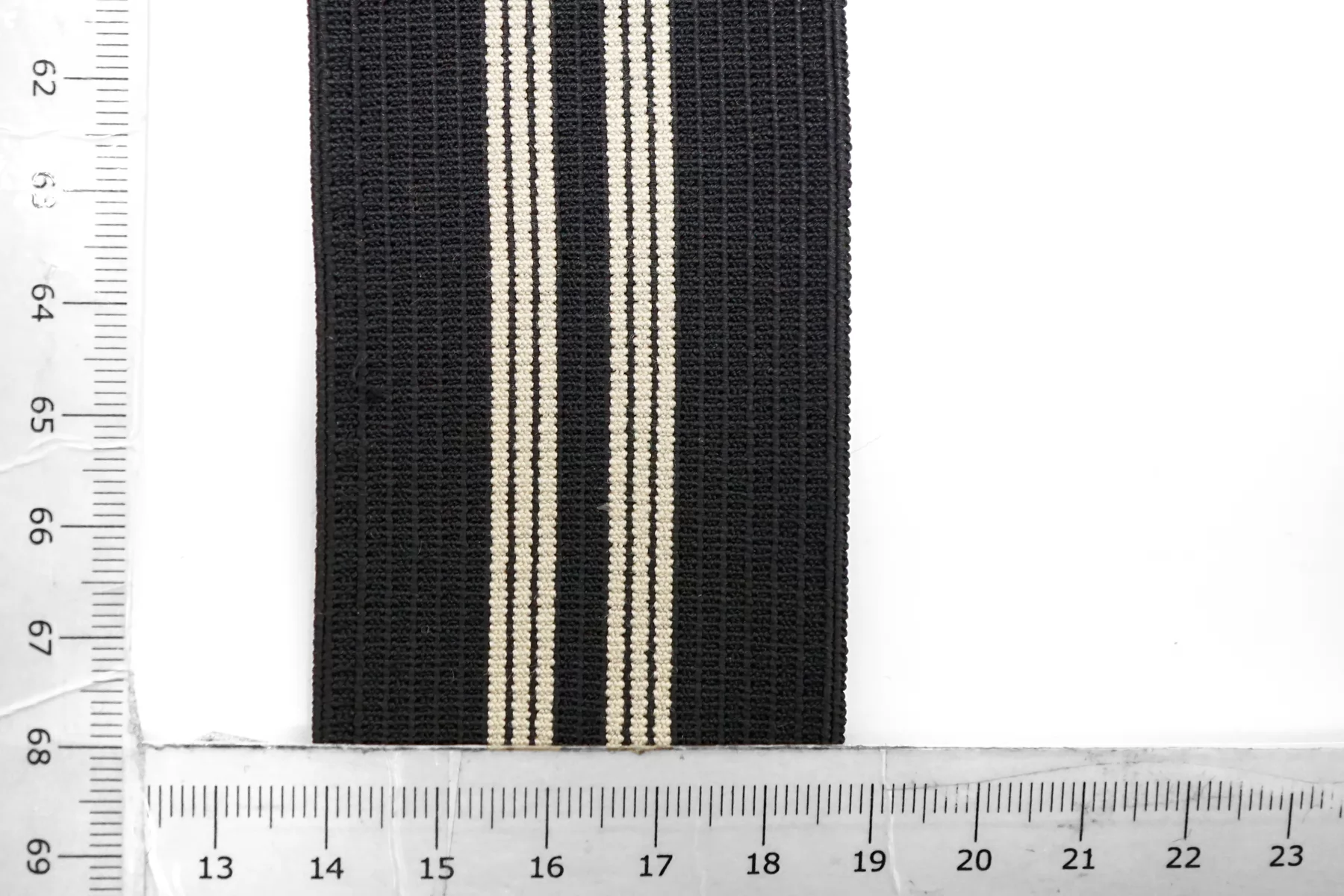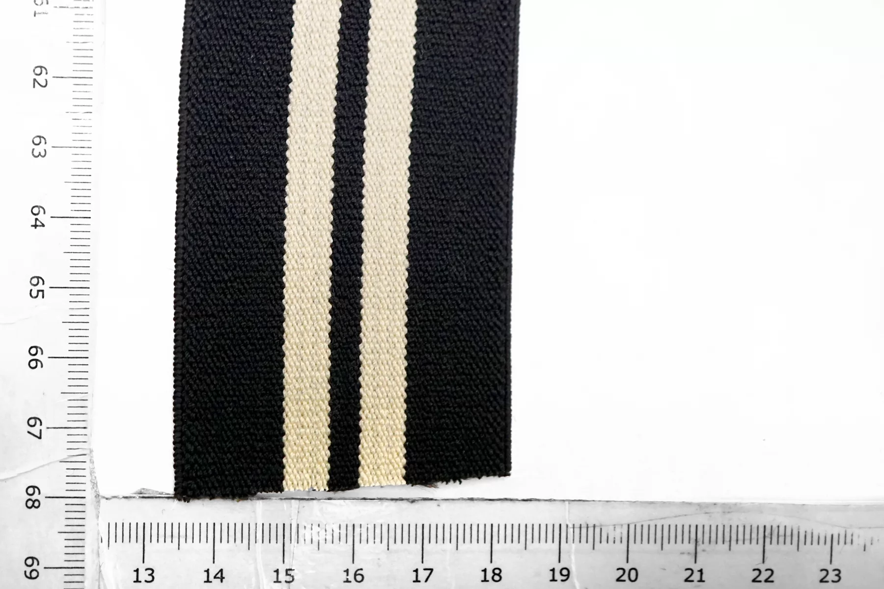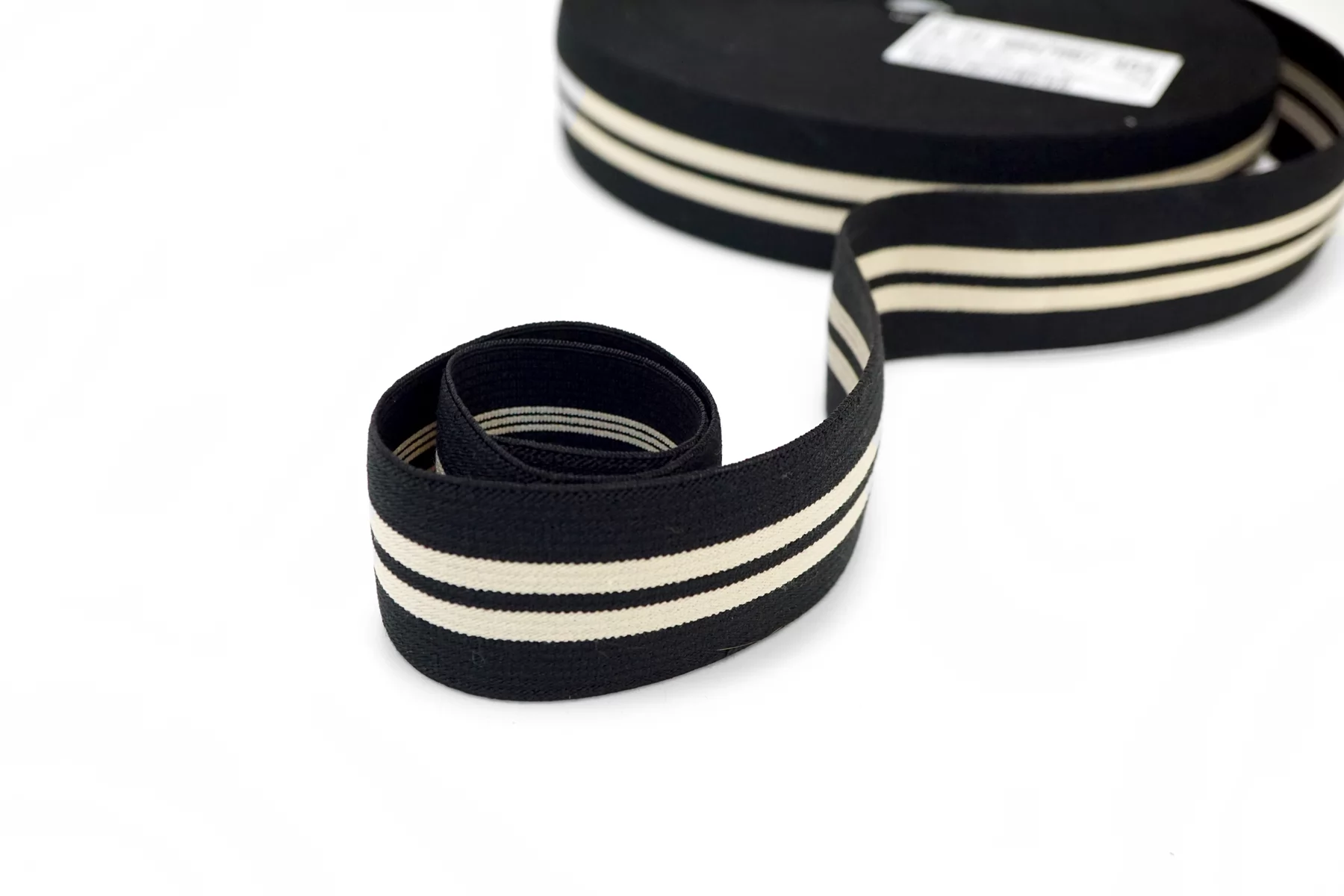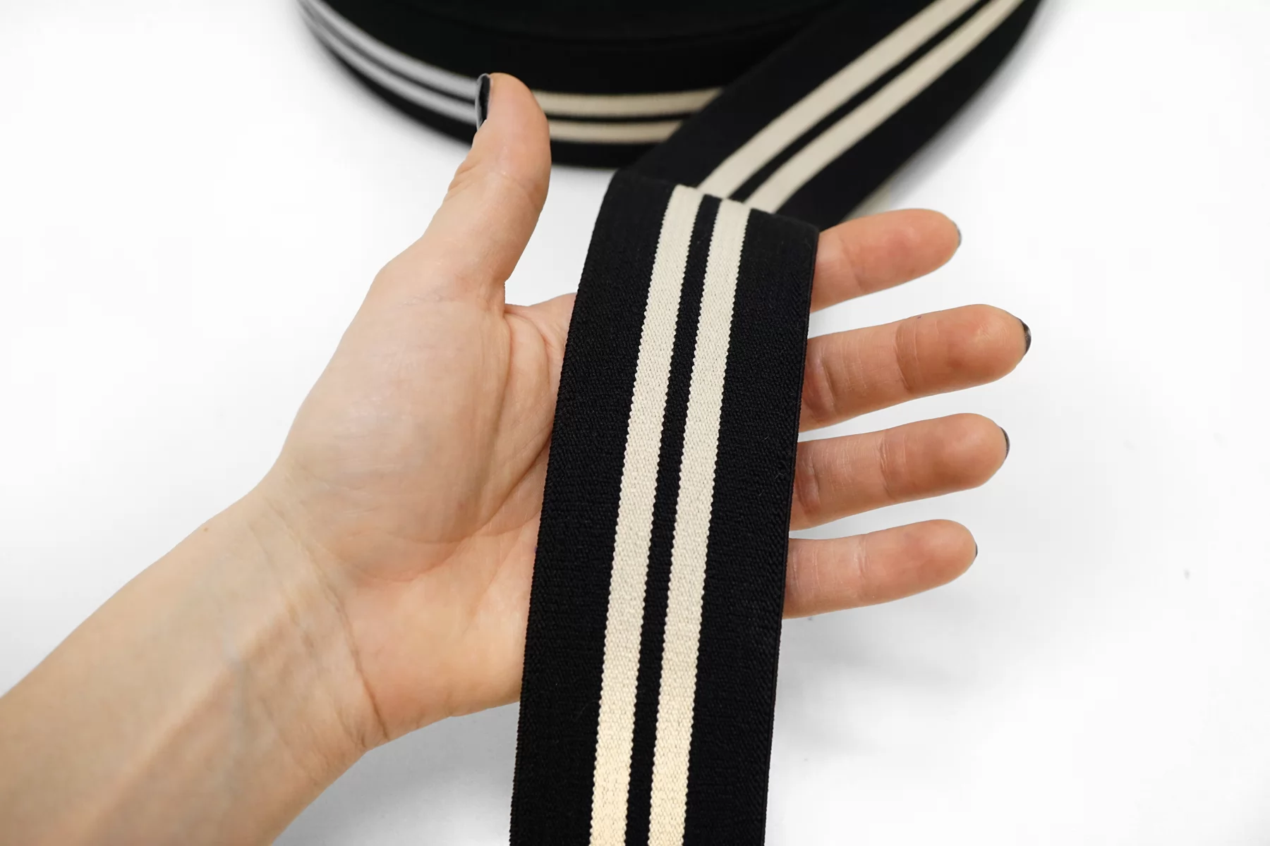Упругая эластичная резинка с бежевыми полосами на черном, ширина 5 см, плотная. Подойдет для отделки юбок, брюк, аксессуаров.