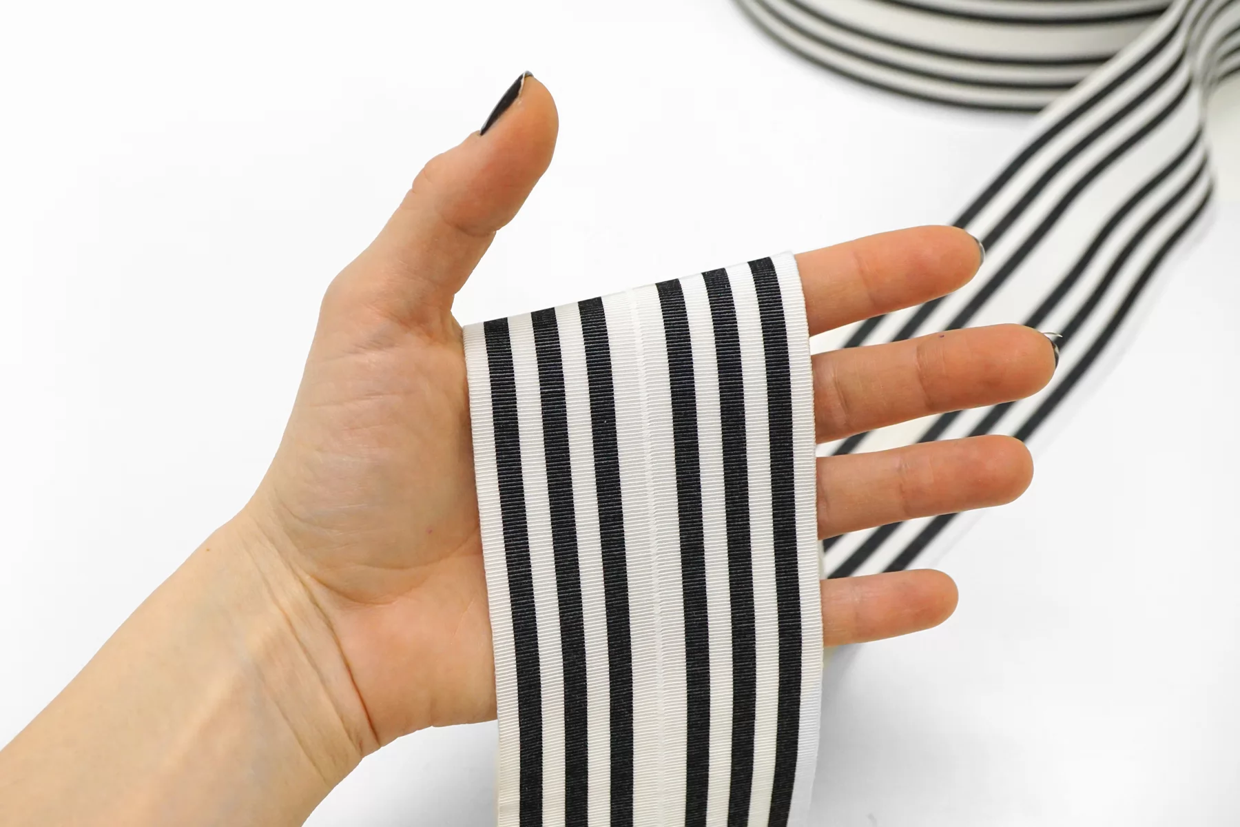 Упругая эластичная резинка белая с черными полосками , по середине резинки имеется линия сгиба , общая ширина 7 см ( со сгибом 3,5 см.) плотная, хорошо тянется.