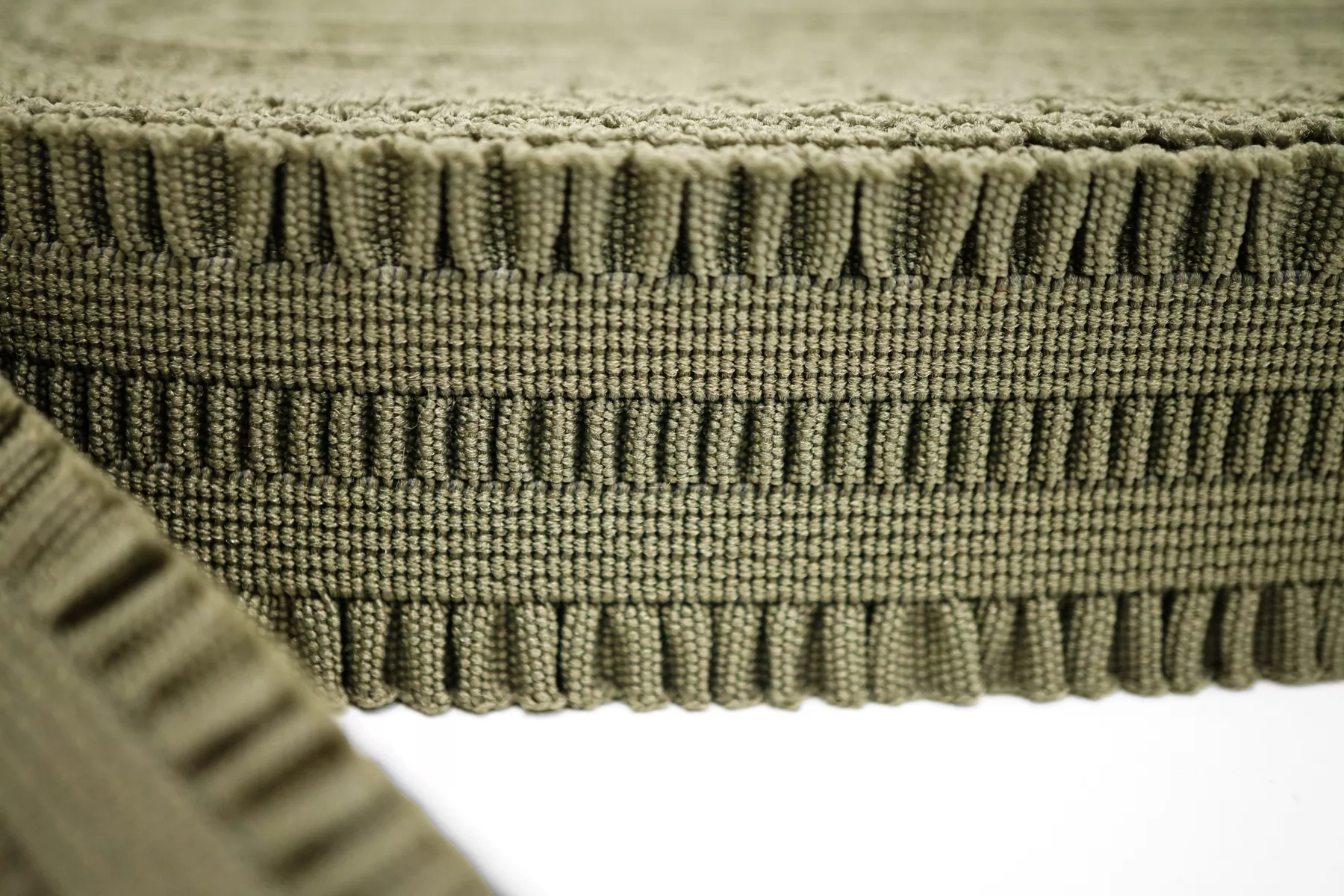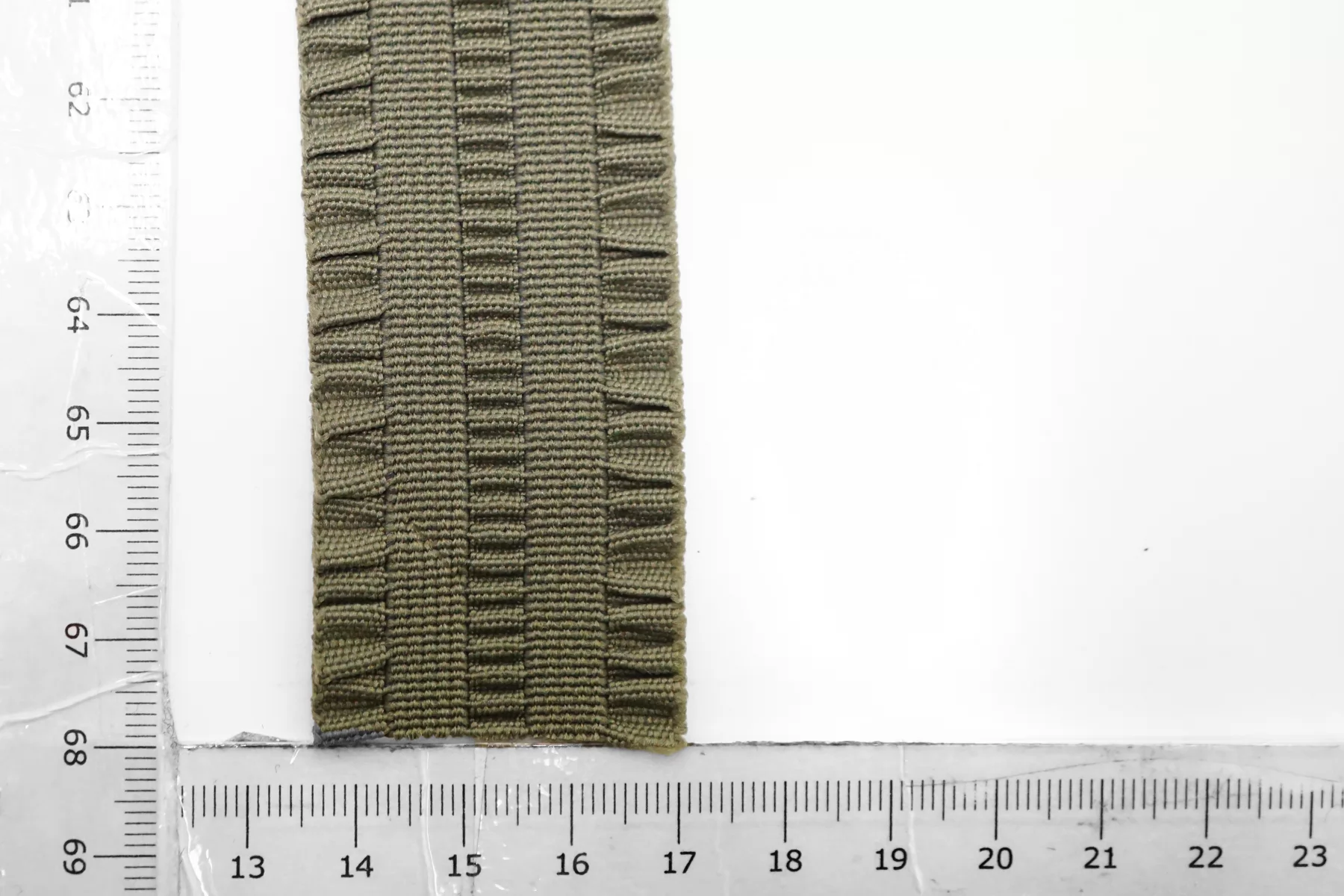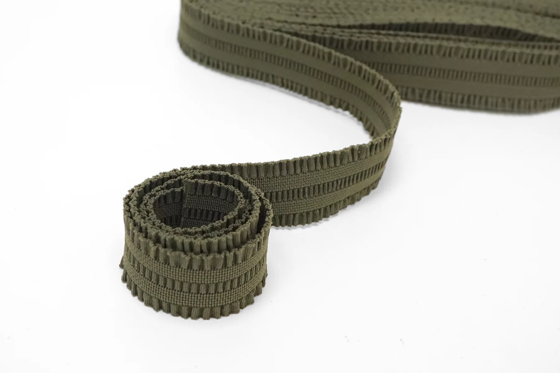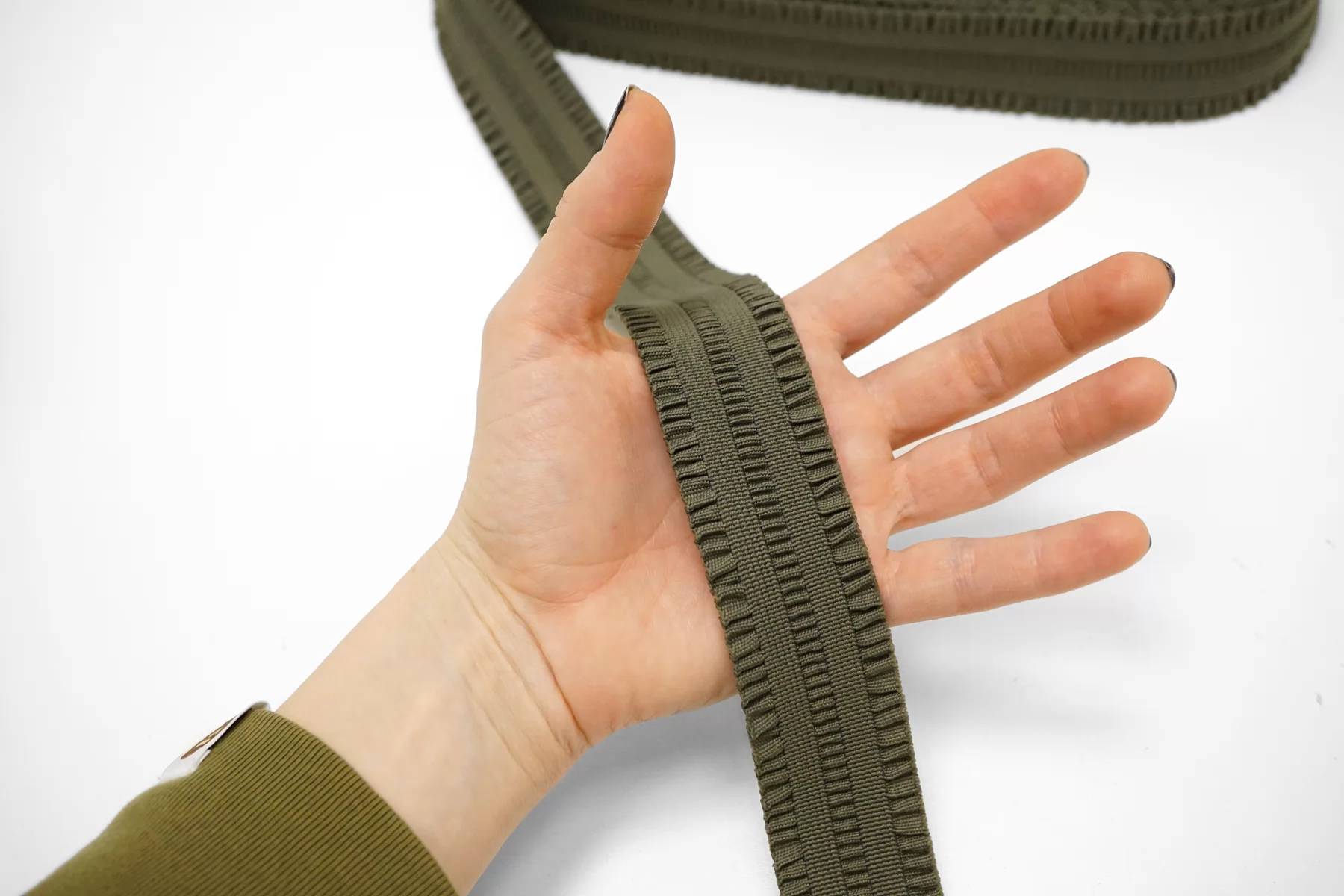 Эластичная фактурная поясная резинка цвета хаки , ширина 3,5 см, плотная, сухая, слабо растяжимая.