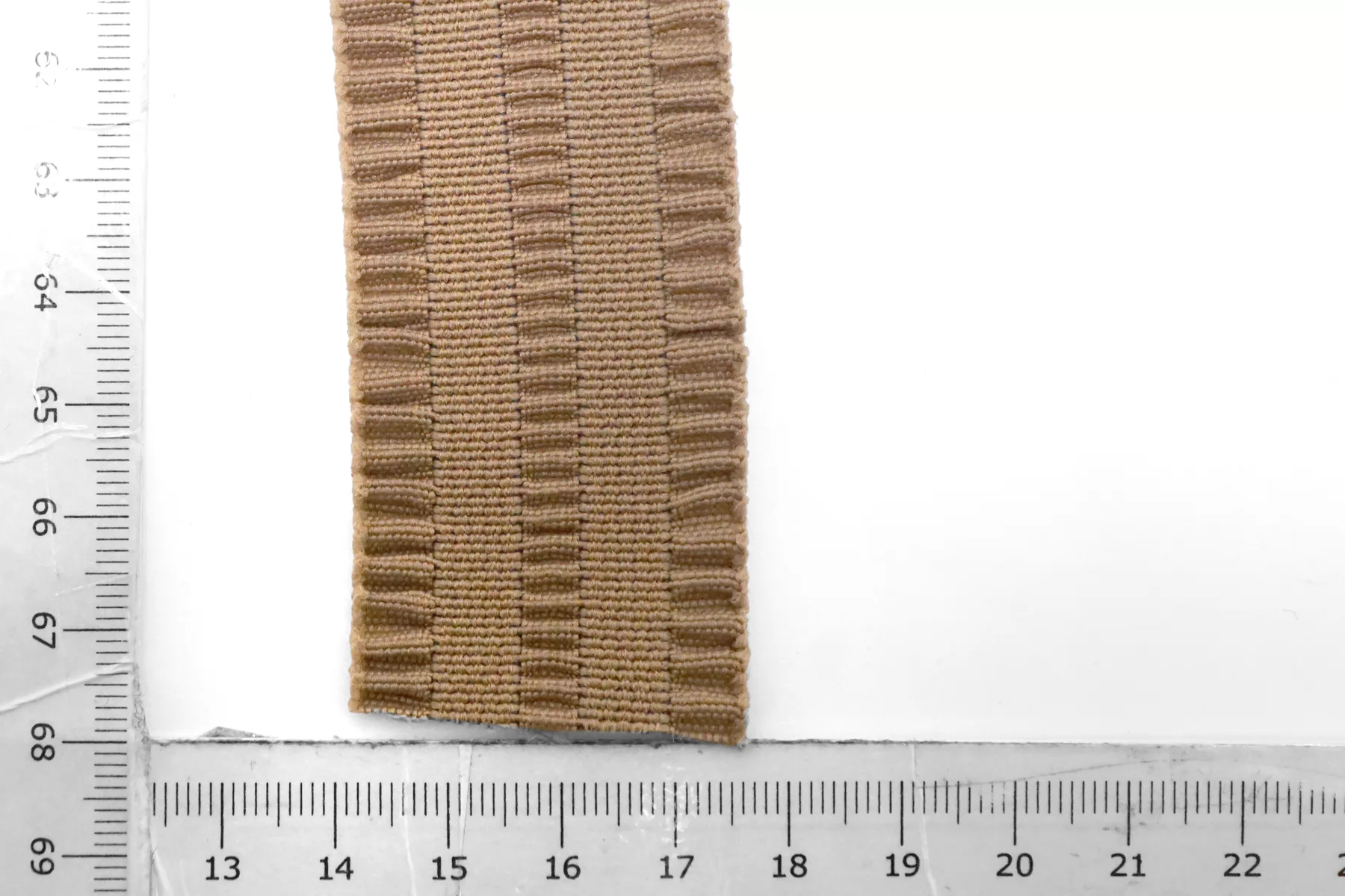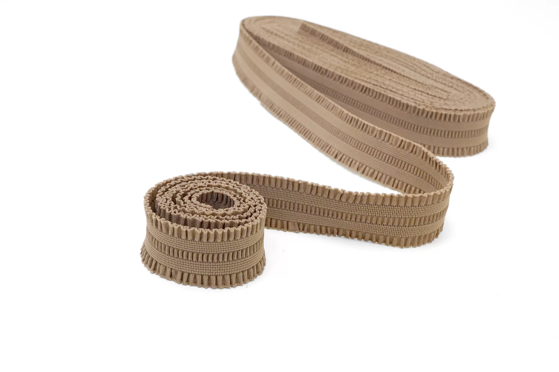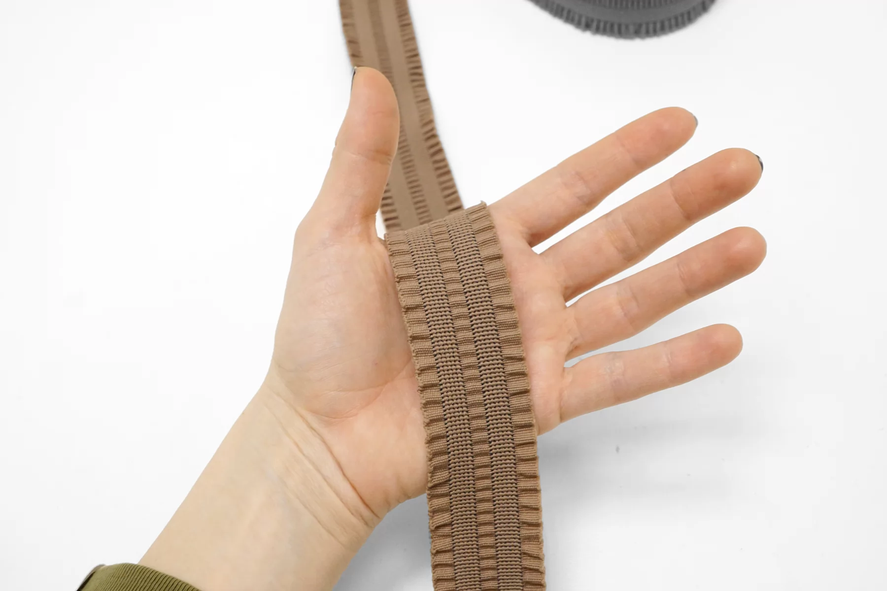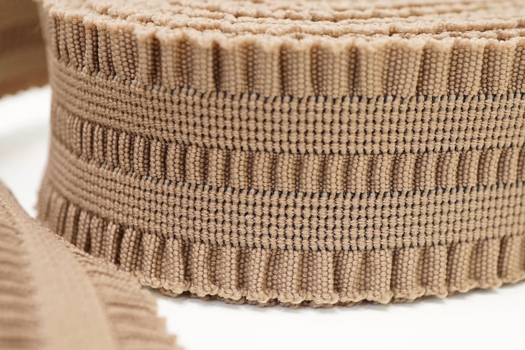 Эластичная фактурная поясная резинка цвета какао , ширина 3,5 см, плотная, сухая, слабо растяжимая.