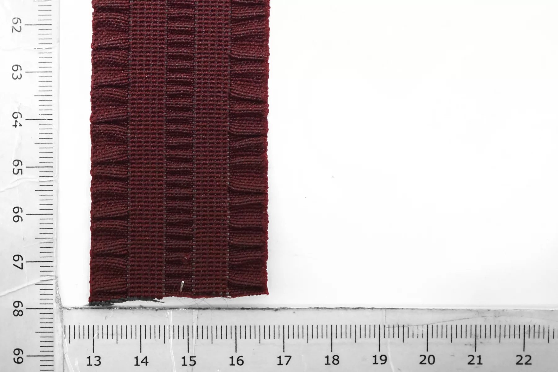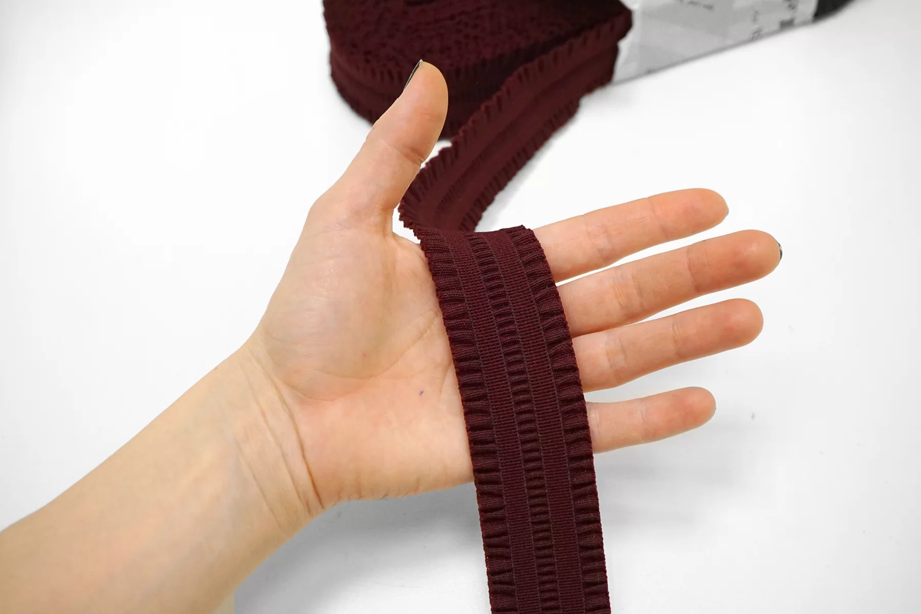 Эластичная фактурная поясная резинка винного цвета , ширина 3,5 см, плотная, сухая, слабо растяжимая.