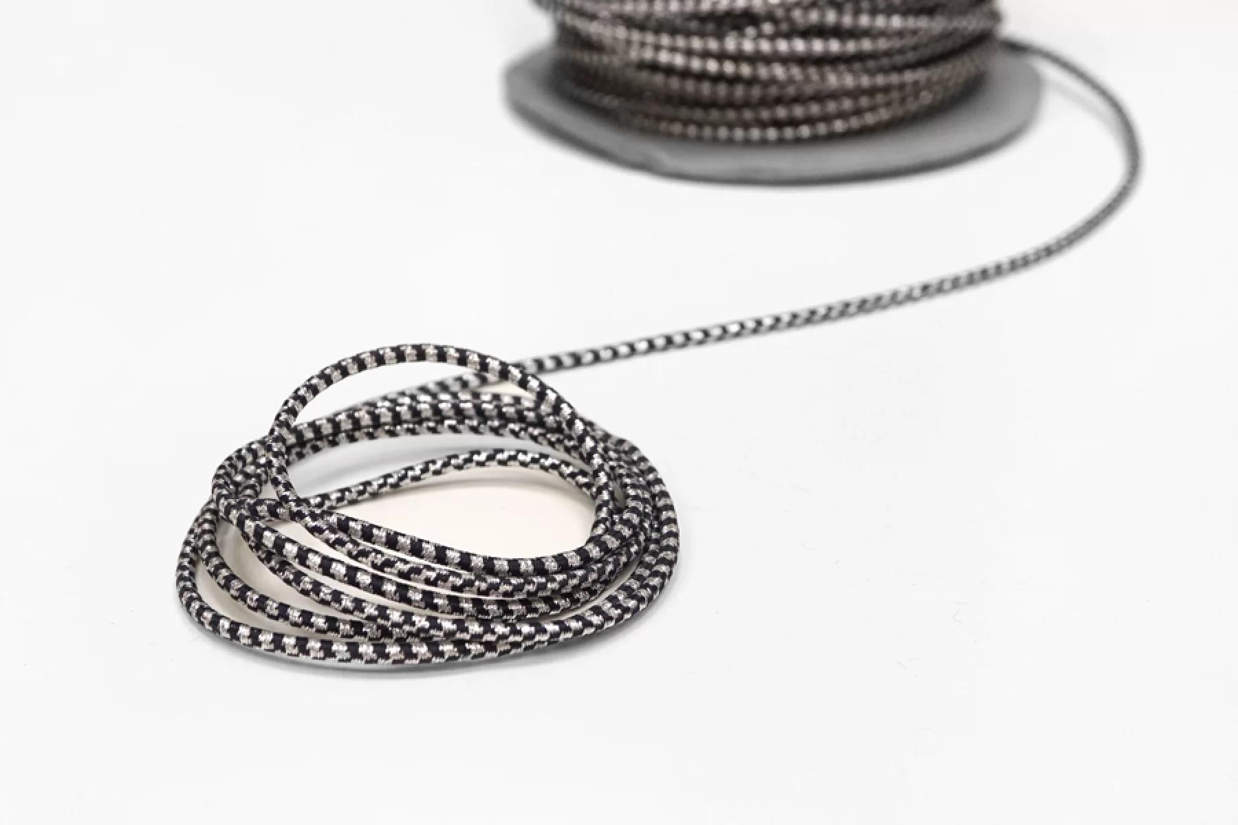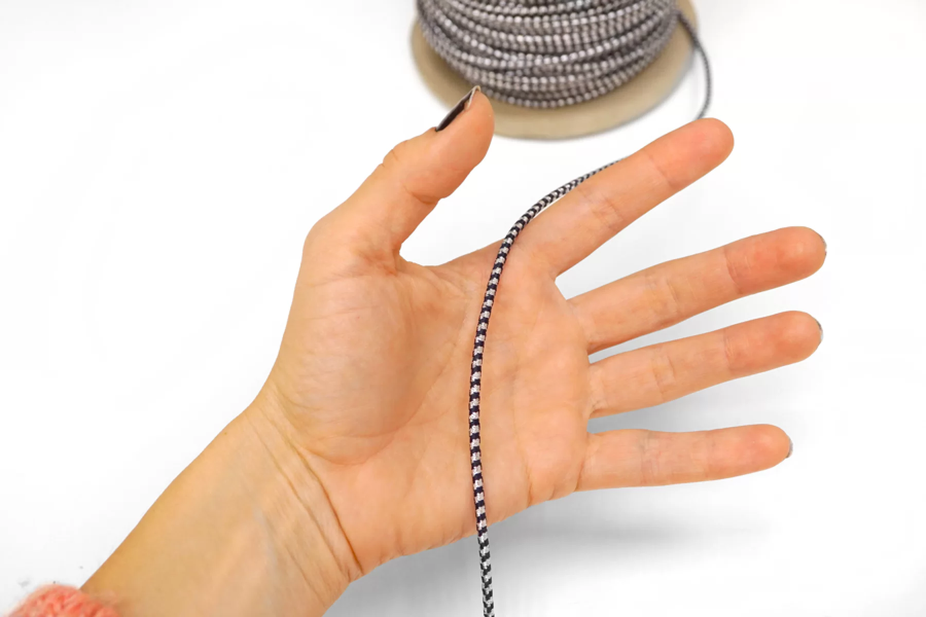 Шляпная резинка черно-серебрянная . Размер - 3 мм. Используется при пошиве масок, головных уборов, одежды, сумок и т.д.