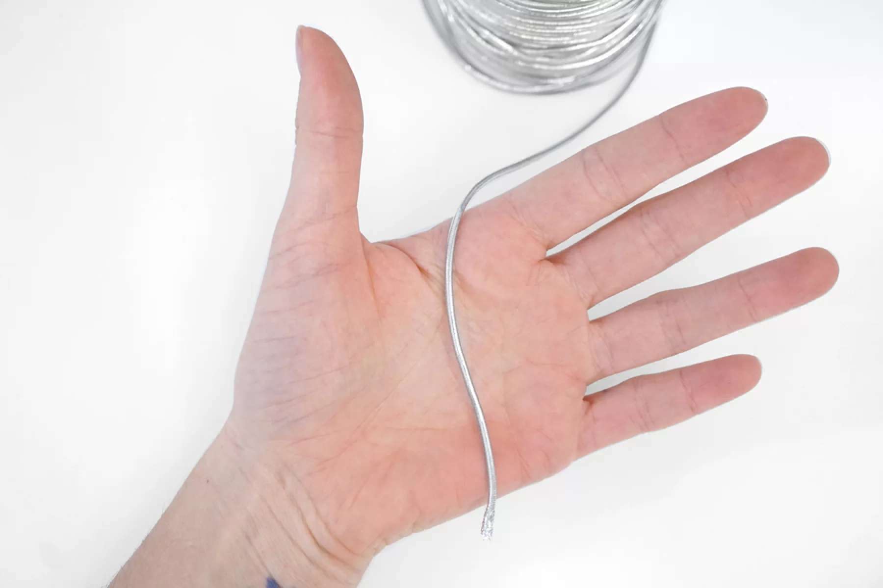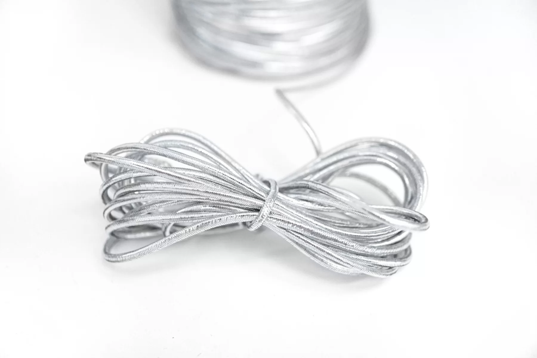 Российская классическая шляпная резинка, обвязанная серебряной люрексной нитью. Размер - 2 мм. Используется при пошиве масок, головных уборов, одежды, сумок и т.д.