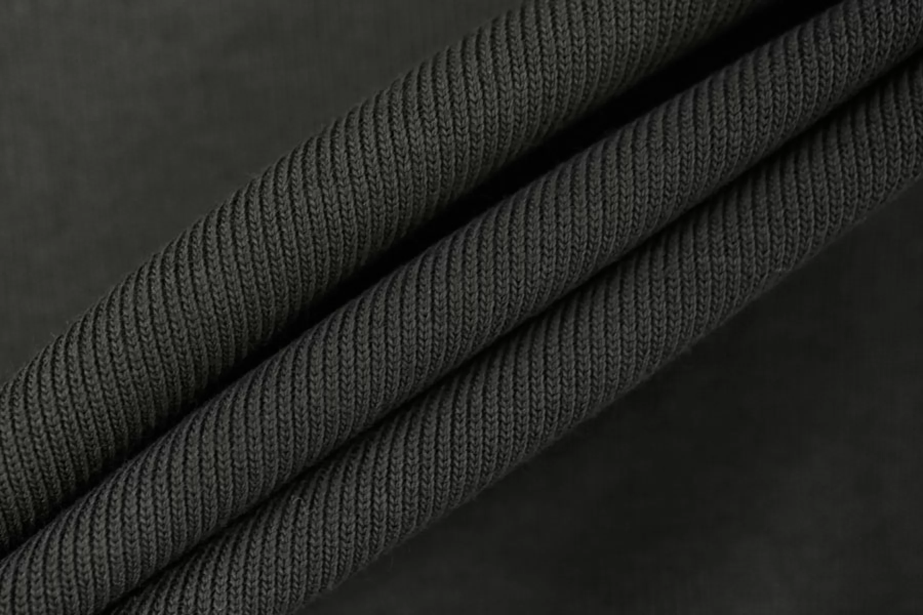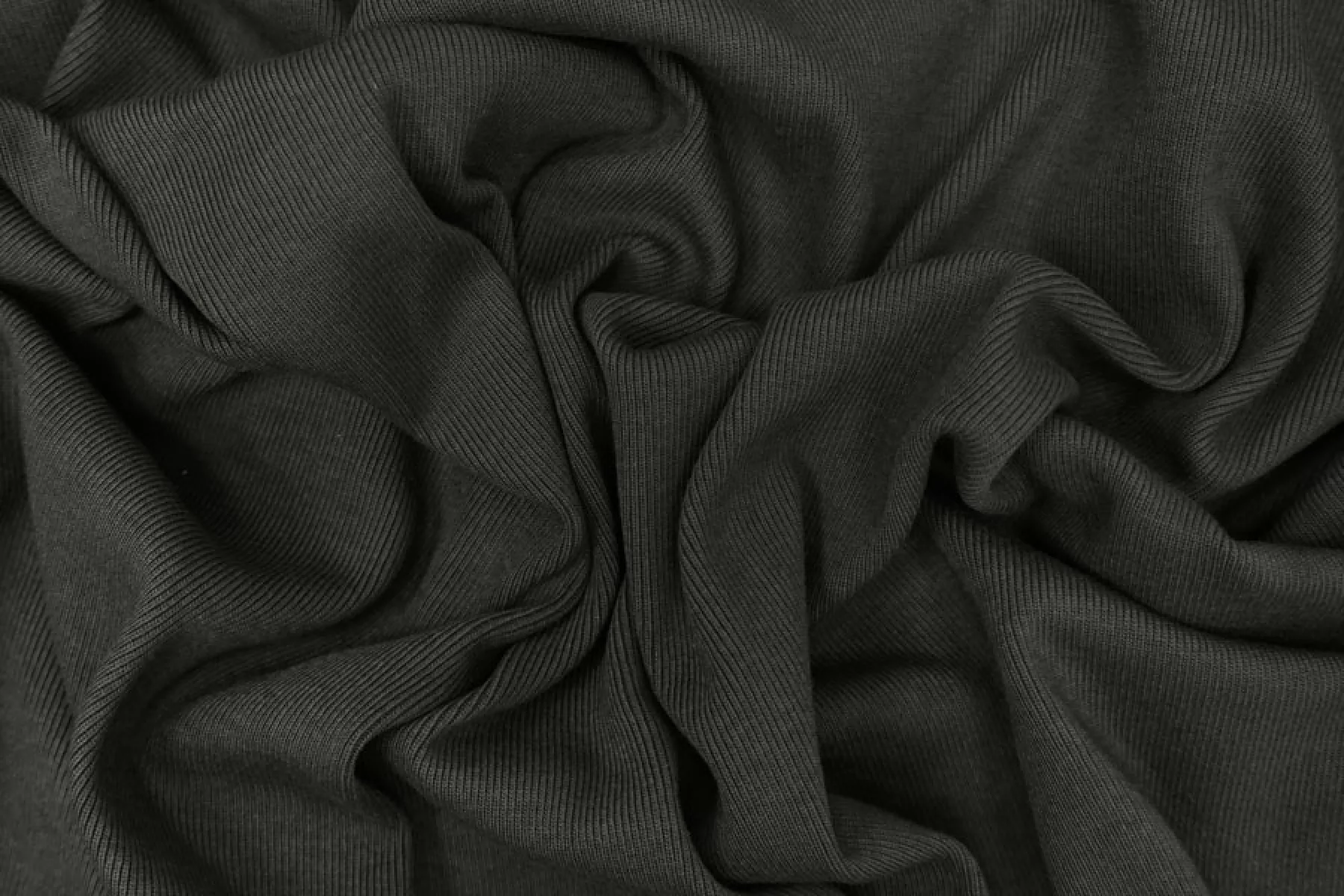 Трикотаж, вязка рибана, темно-серого цвета от бренда BOTTEGA VENETA. Эластичный, пластичный, немного просвечивает, с приятным лоском. Плотный. Хорошо тянется. Подойдет для пошива самостоятельных изделий, манжет, подвязов.