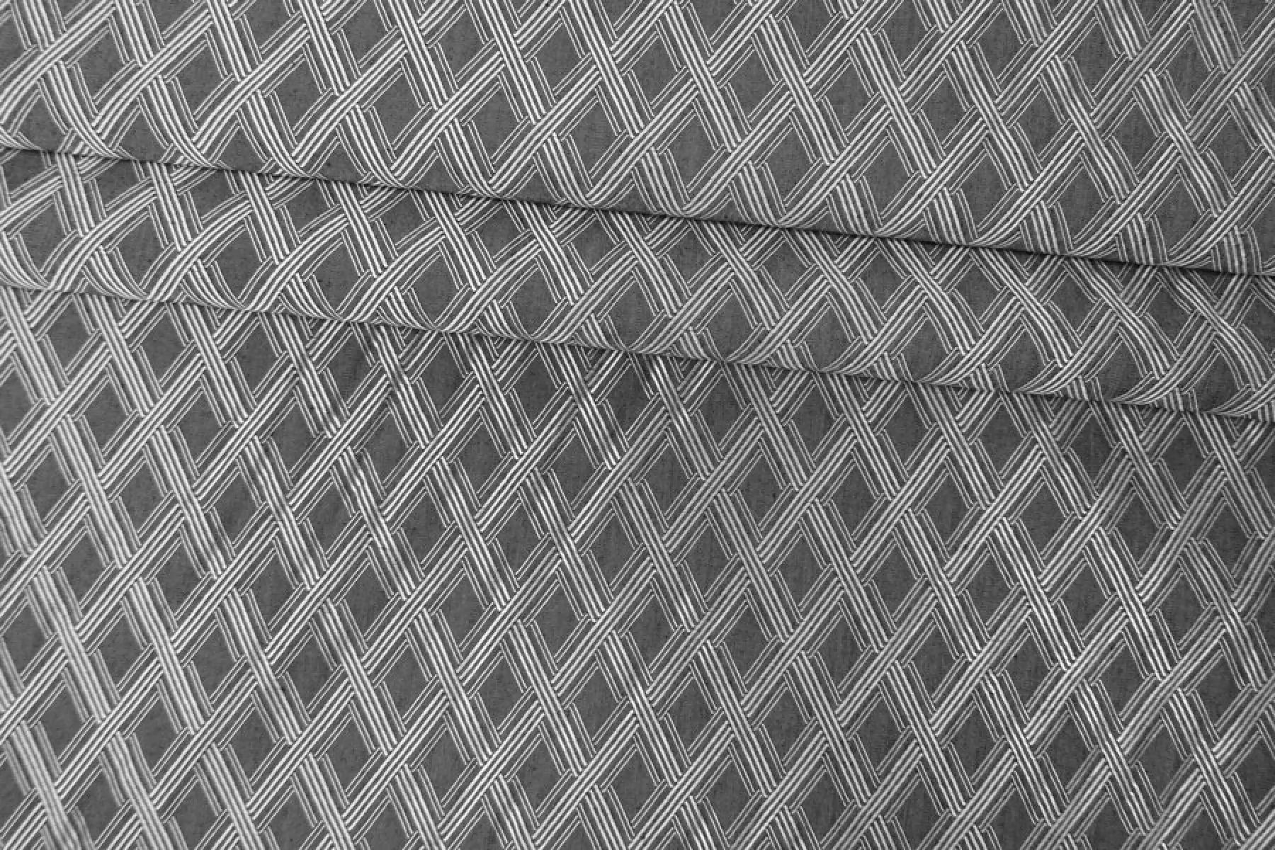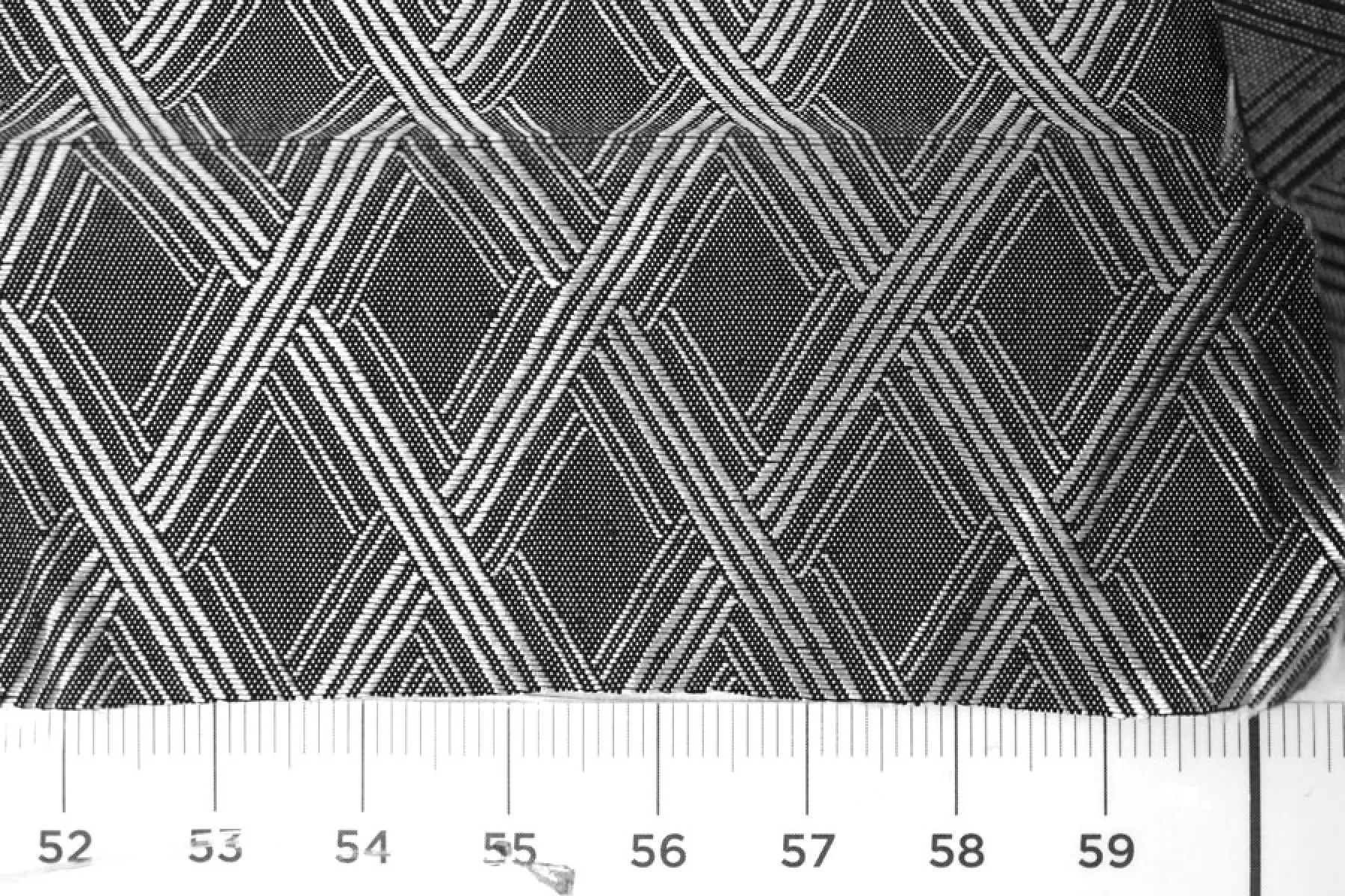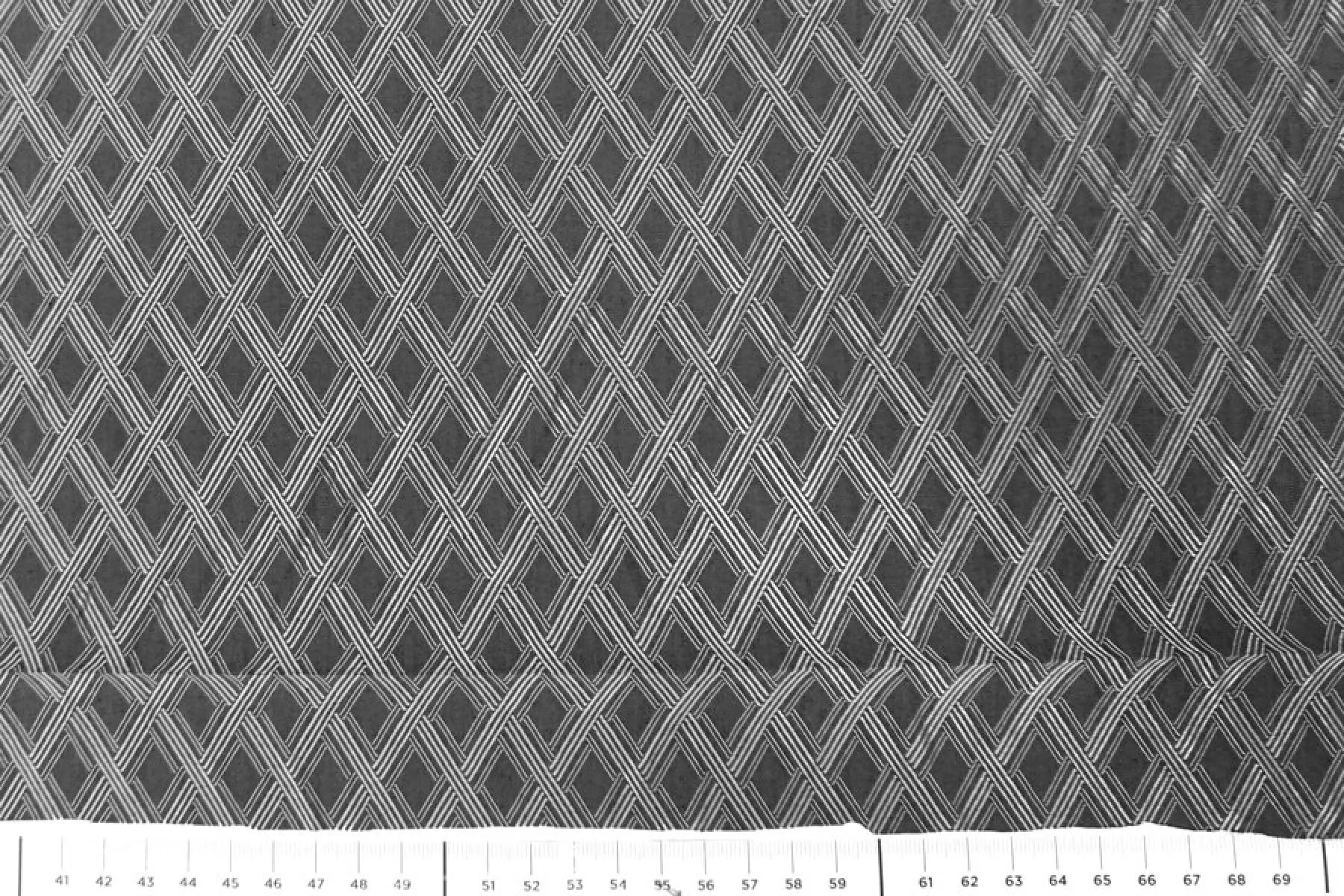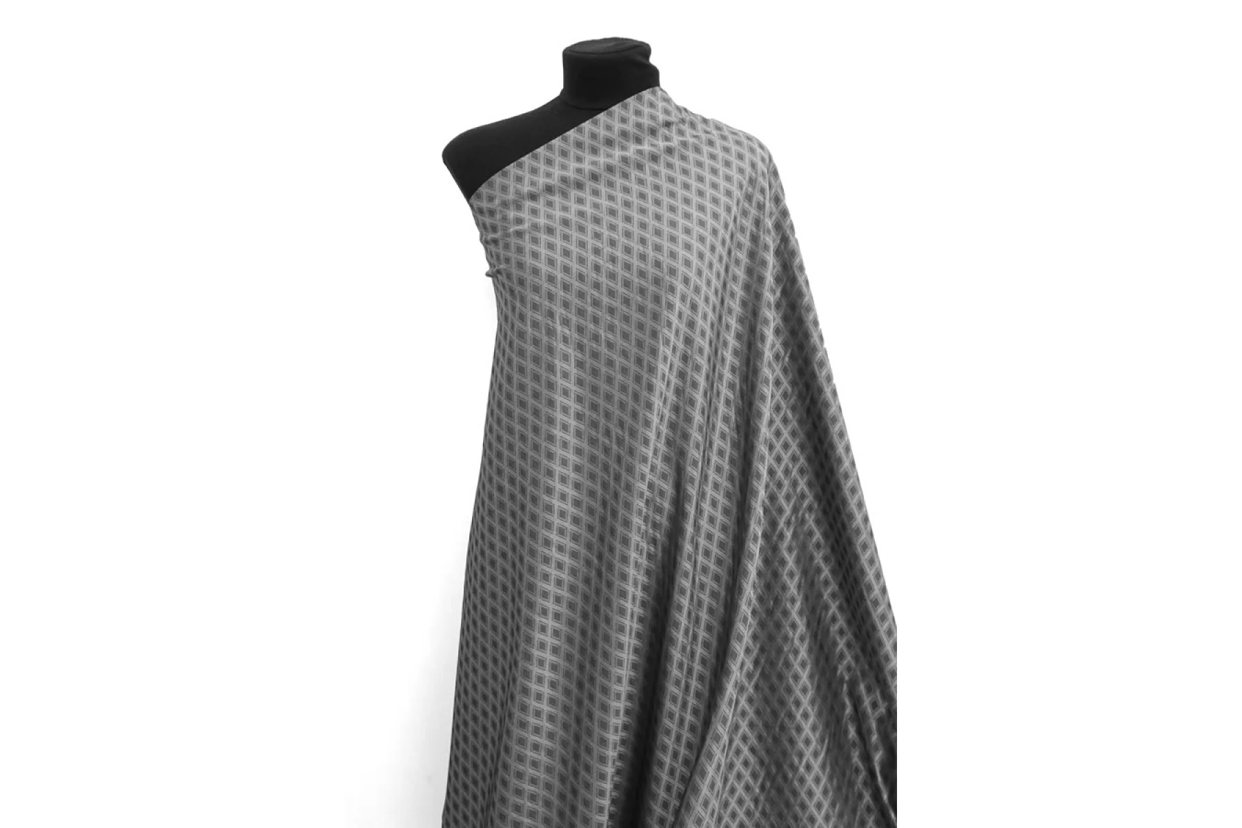 Итальянский рубашечный хлопок от Dolce & Gabbana, с жаккардовой выработкой - орнаментальным узором в виде ромбов, нити черного и белого цвета (белые нити с лоском-вискоза). Материал гладкий, мягкий, тонкий, легкий. Немного мнется и совсем немного просвечивает. Немного тянется, очень пластичный и форму практически не держит. Прекрасный вариант на рубашки, юбки, платья. Материал дает усадку.
