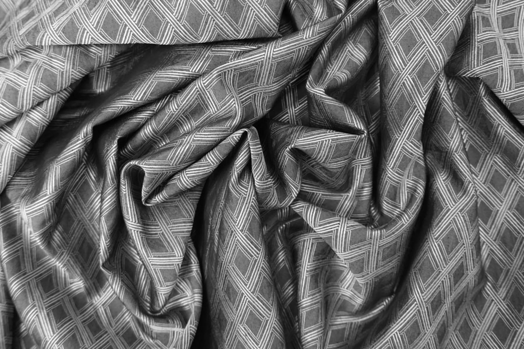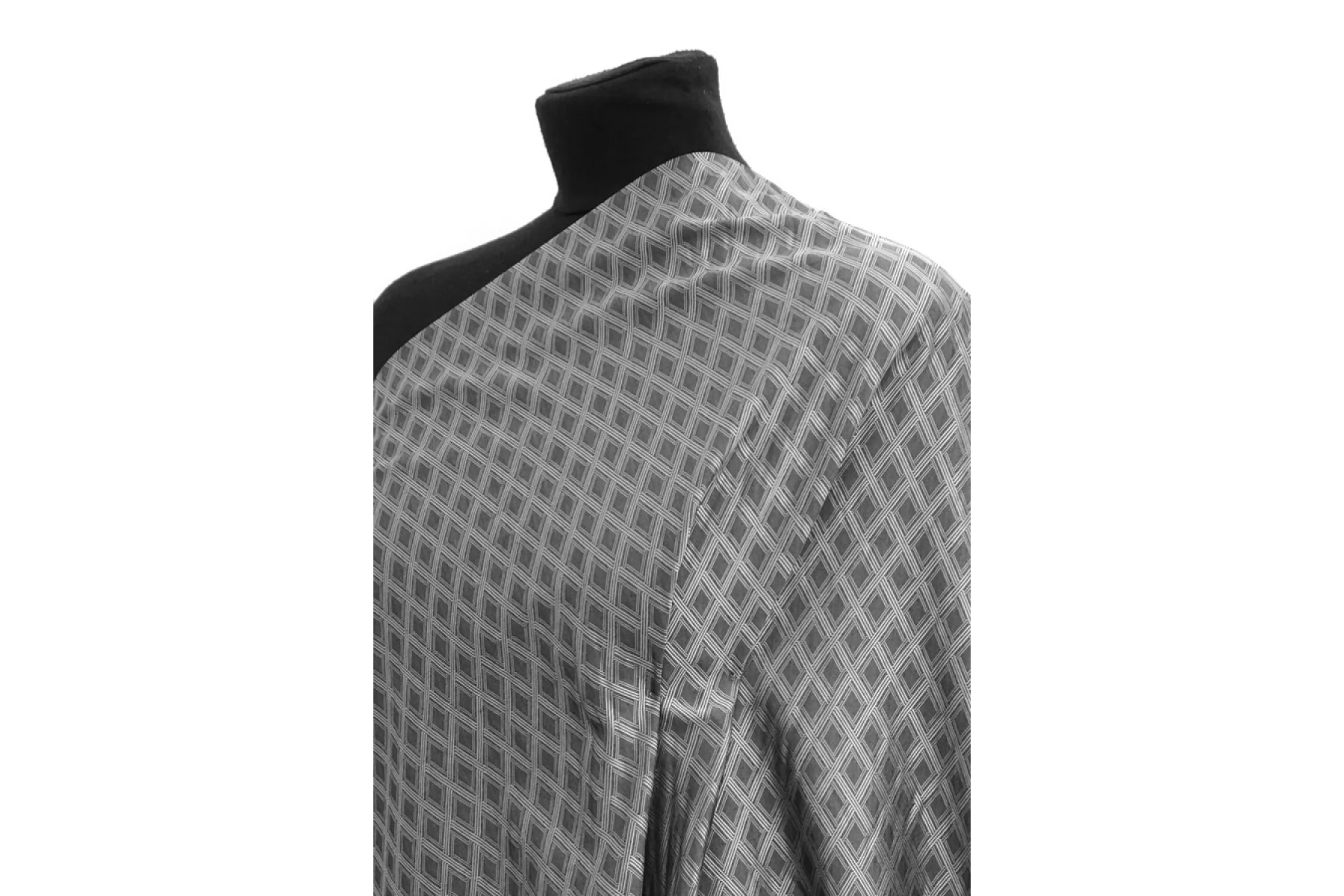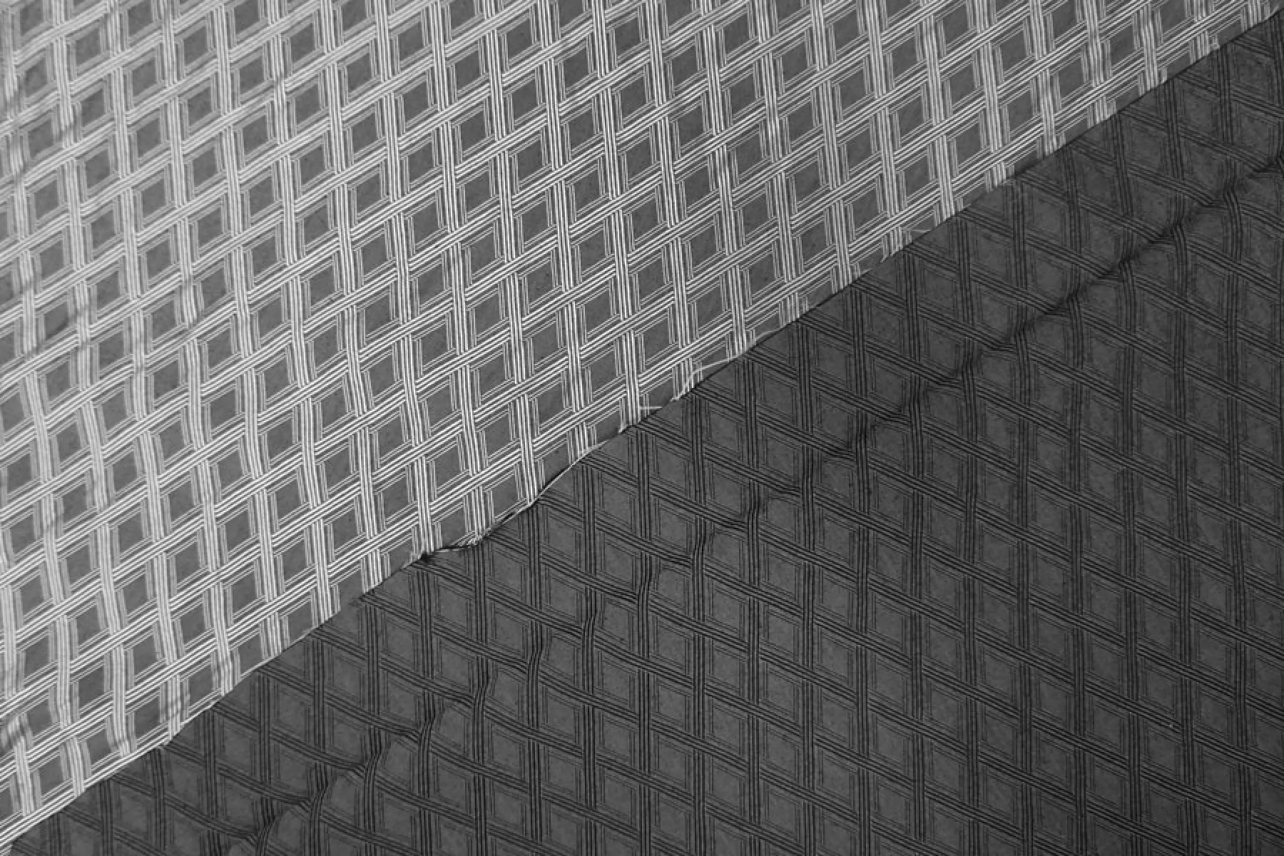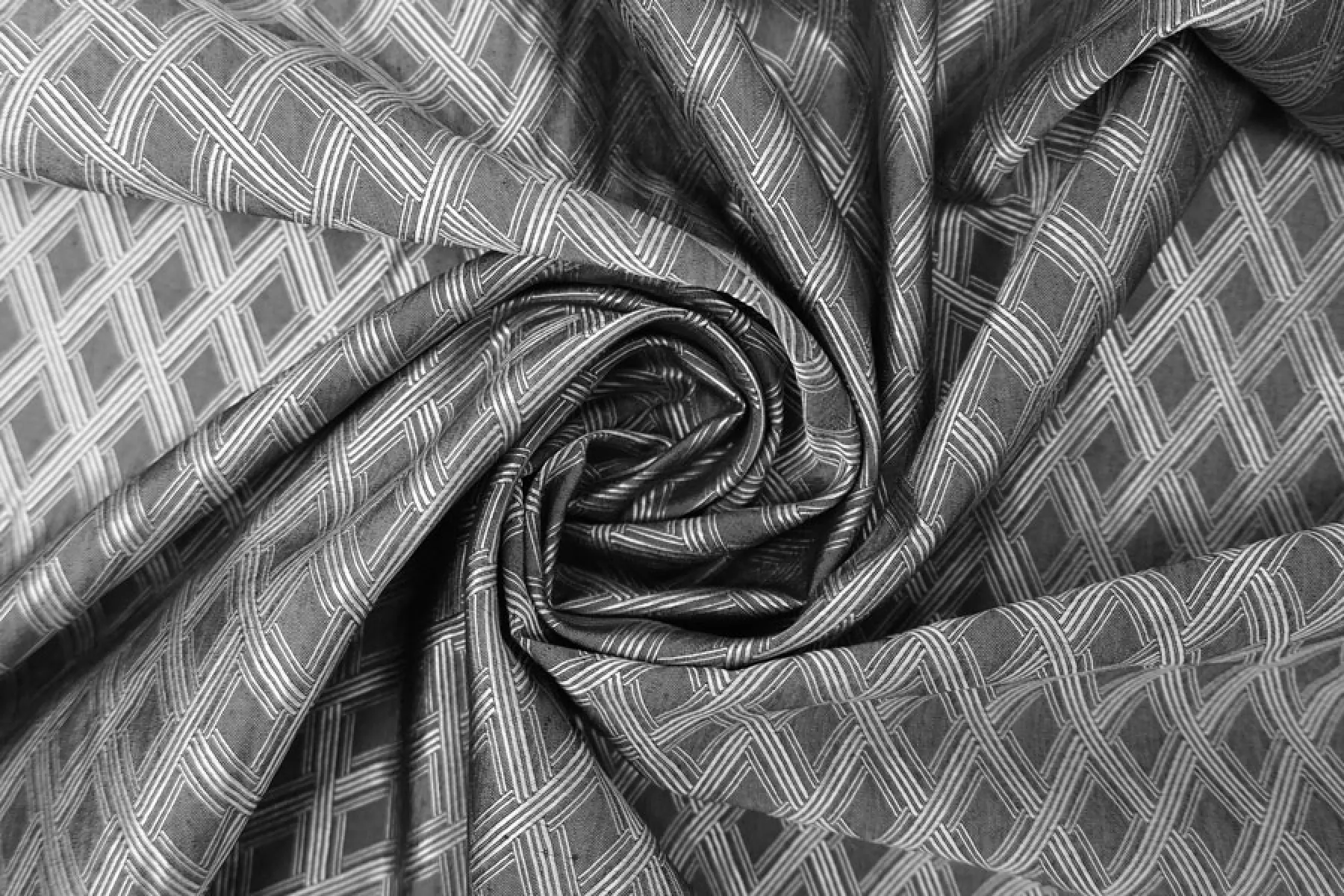 Итальянский рубашечный хлопок от Dolce & Gabbana, с жаккардовой выработкой - орнаментальным узором в виде ромбов, нити черного и белого цвета (белые нити с лоском-вискоза). Материал гладкий, мягкий, тонкий, легкий. Немного мнется и совсем немного просвечивает. Немного тянется, очень пластичный и форму практически не держит. Прекрасный вариант на рубашки, юбки, платья. Материал дает усадку.