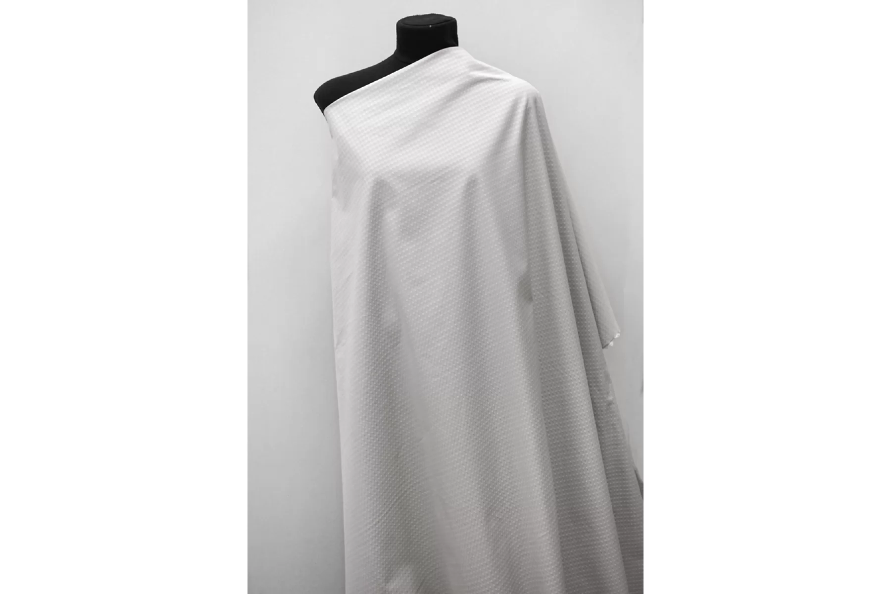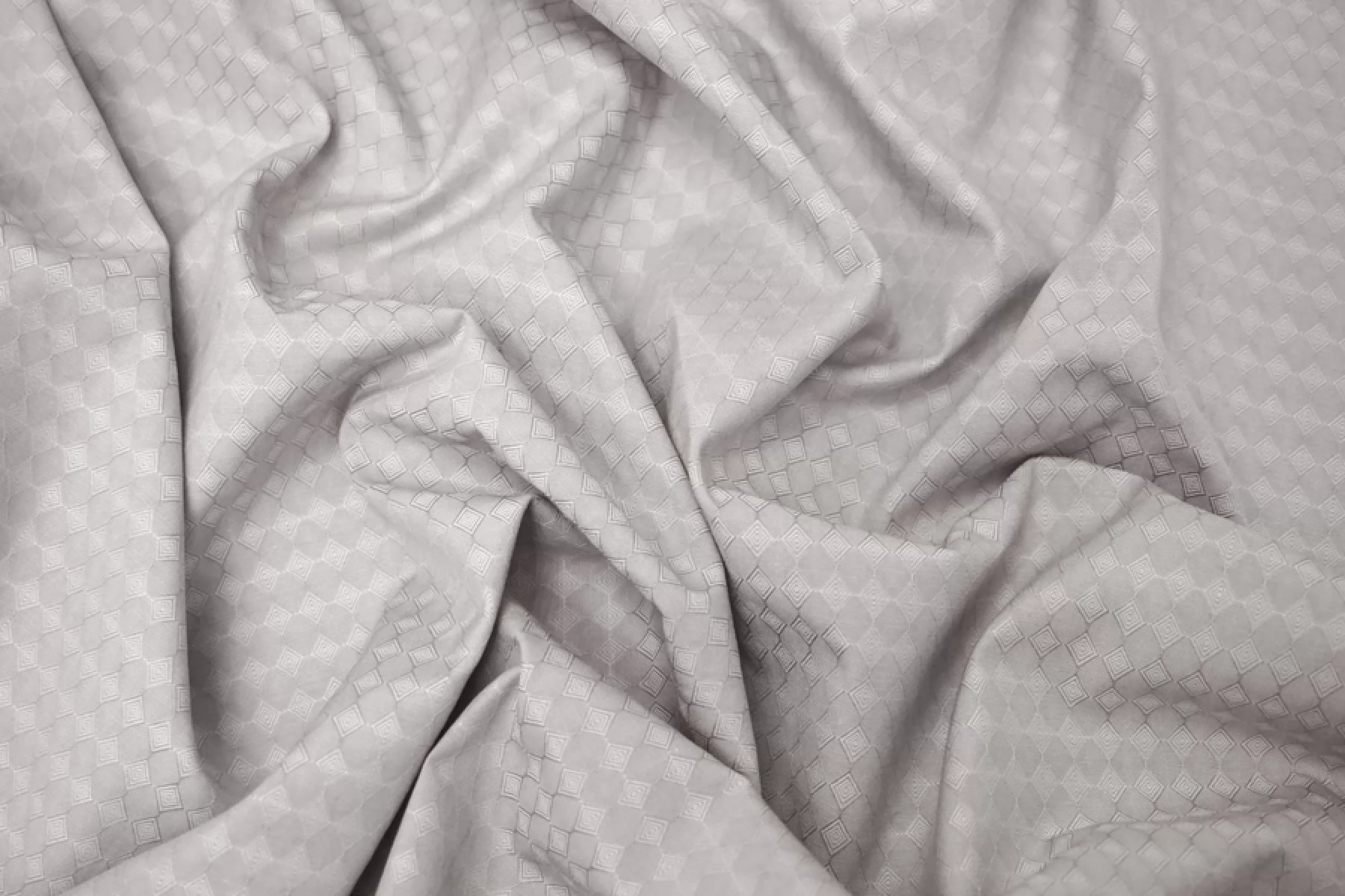 Интересный рубашечно-плательный хлопок с ромбовидным узором, цвет светло-серый. Довольно плотный, приятный тактильно, держит форму, не просвечивает и не тянется. Немного шуршащий. Слегка сминается. Подойдет для пошива плотной рубашки, летних брюк, шорт, платья или юбки (учитывайте, что не тянется).