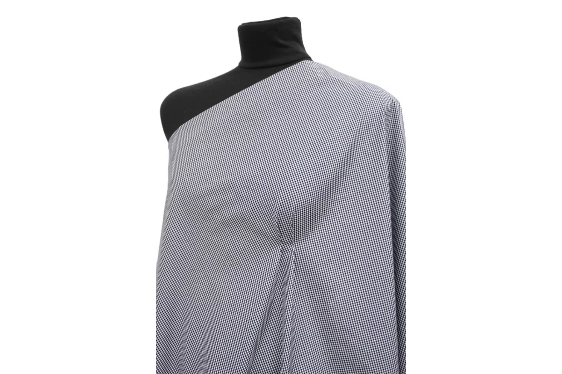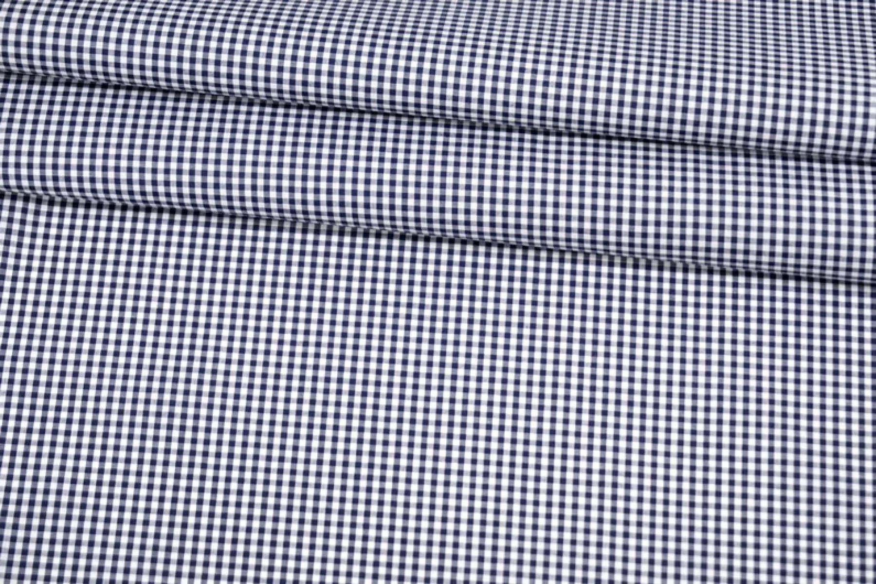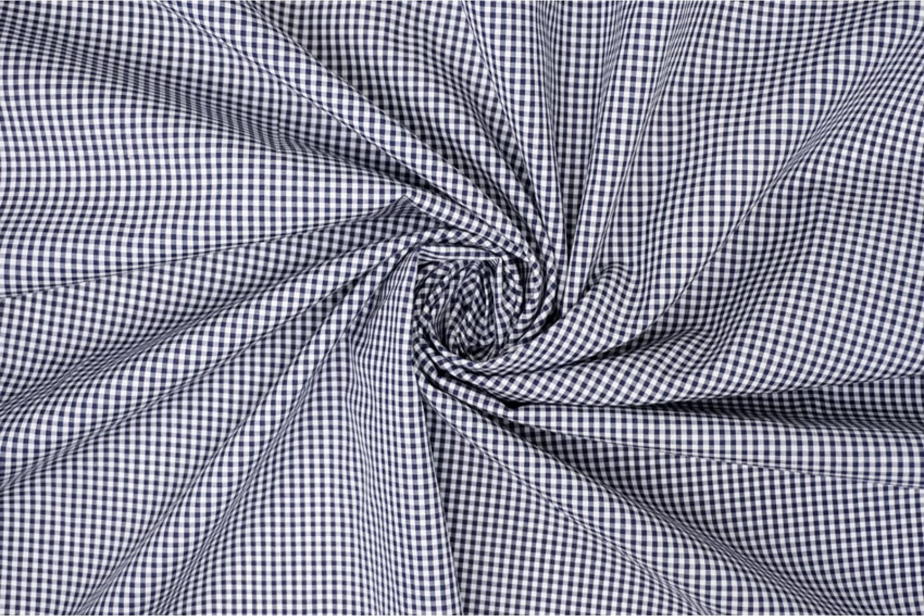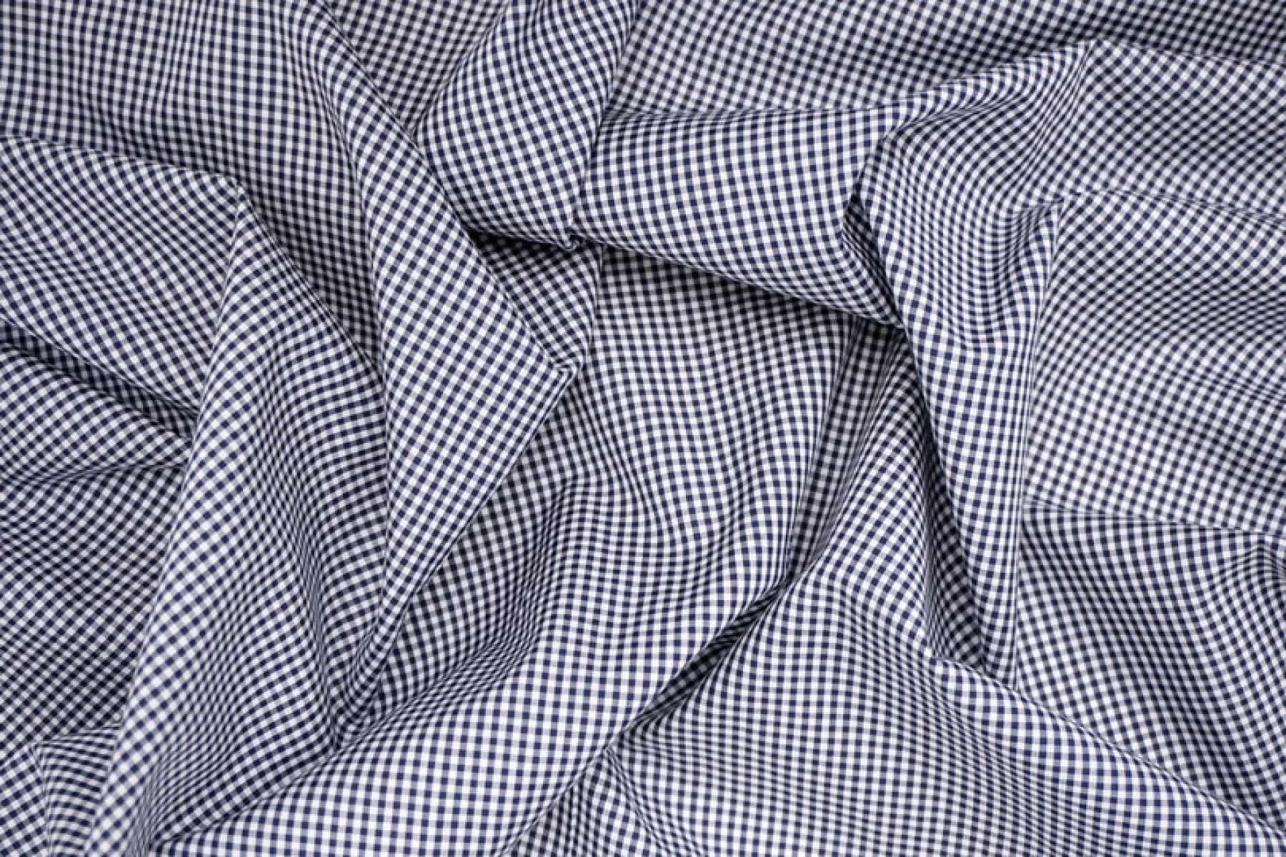 Рубашечный хлопок полотняного переплетения от фабрики Cotonificio Albini, в мелкую клетку в оттенках синего и белого. Приятный и гладкий. Тонкий. Не просвечивает, но совсем слегка заметна тень силуэта. Не тянется. Сминается, но за счет рябящего принта - это несильно заметно. Хорошо драпируется и неплохо держит форму. Отличный вариант на рубашки, платья, сарафаны, юбки.