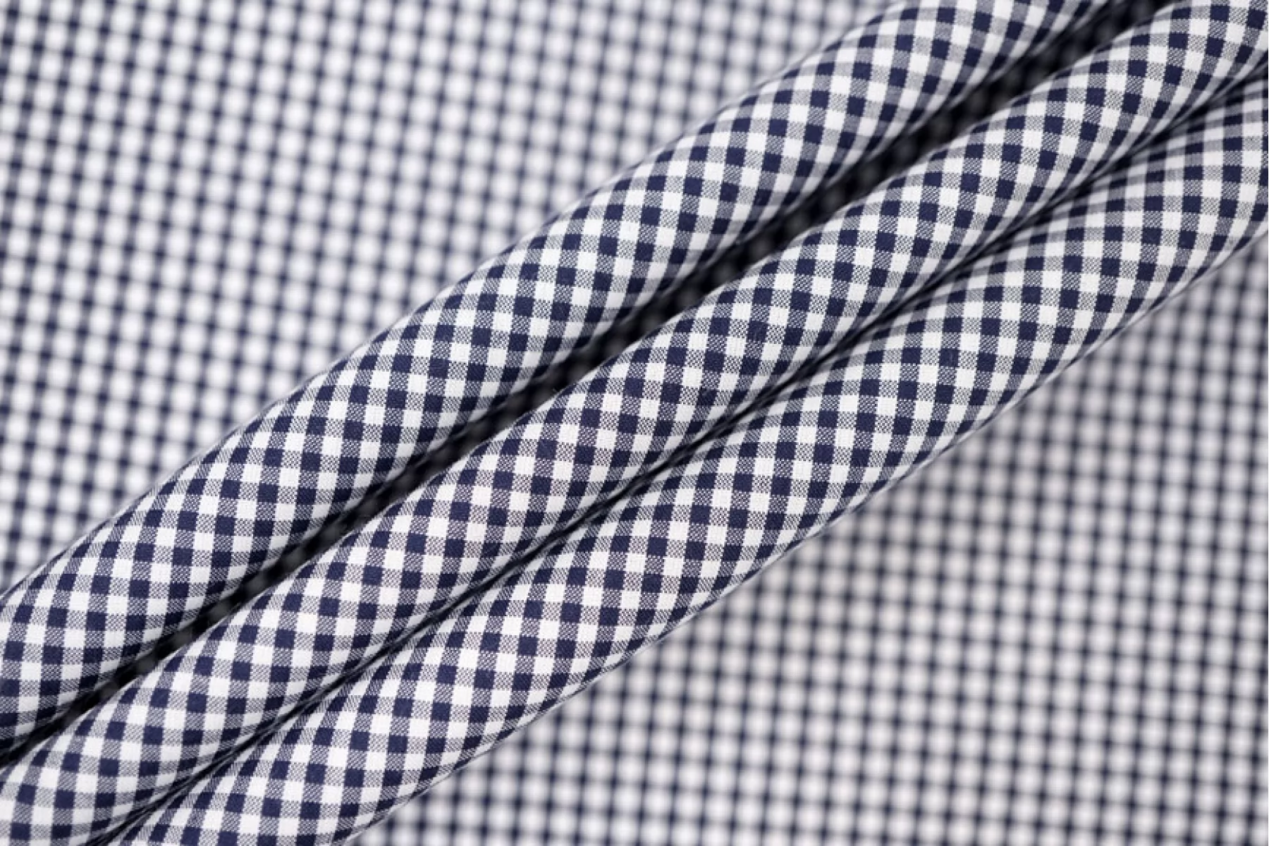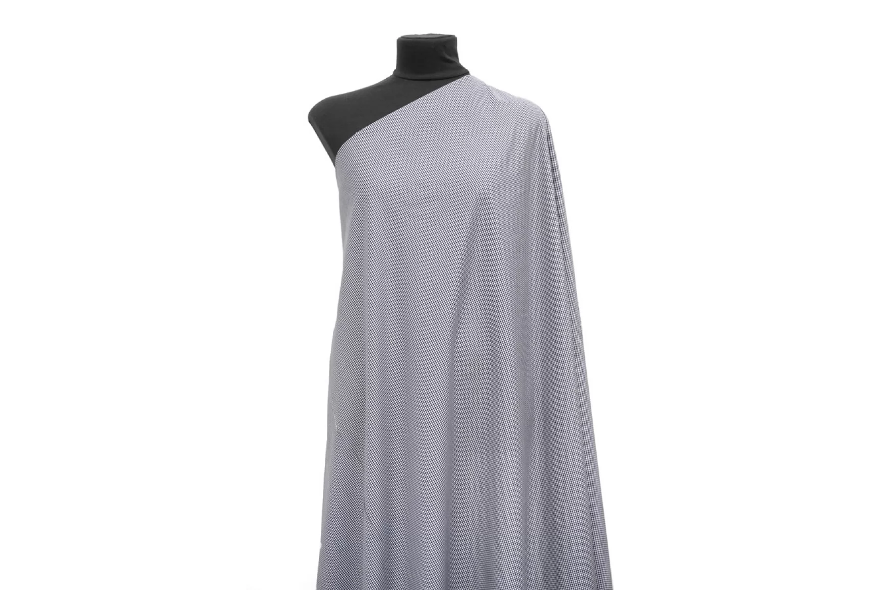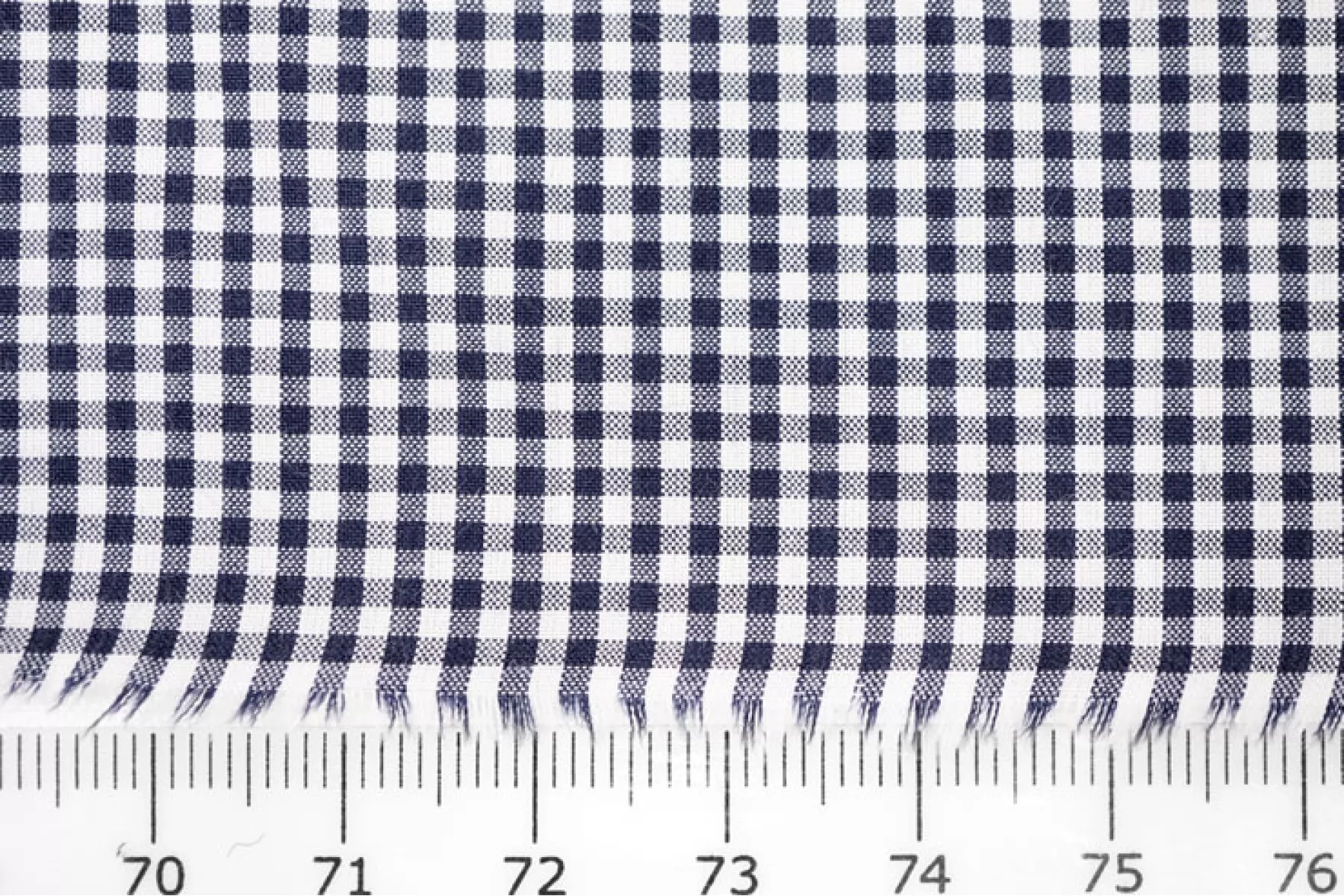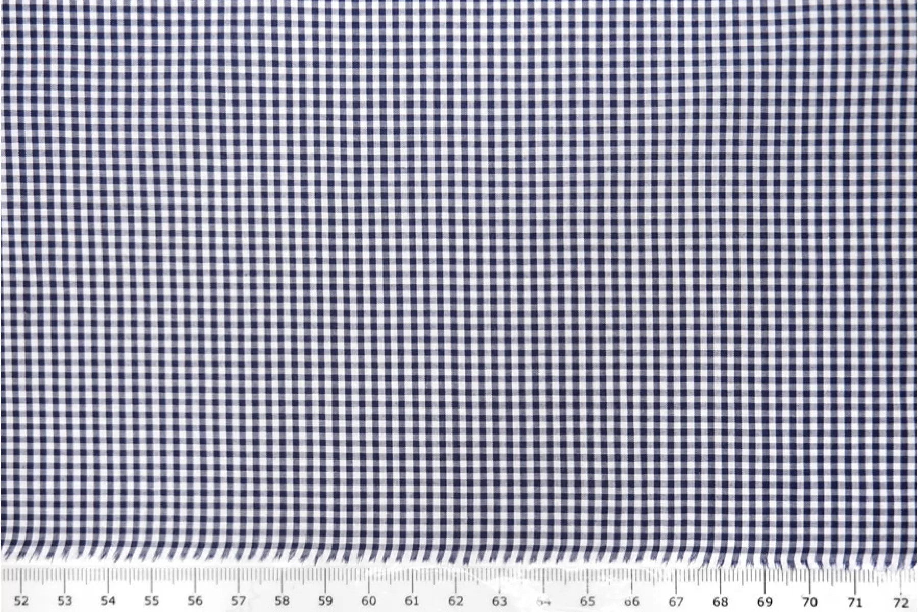 Рубашечный хлопок полотняного переплетения от фабрики Cotonificio Albini, в мелкую клетку в оттенках синего и белого. Приятный и гладкий. Тонкий. Не просвечивает, но совсем слегка заметна тень силуэта. Не тянется. Сминается, но за счет рябящего принта - это несильно заметно. Хорошо драпируется и неплохо держит форму. Отличный вариант на рубашки, платья, сарафаны, юбки.