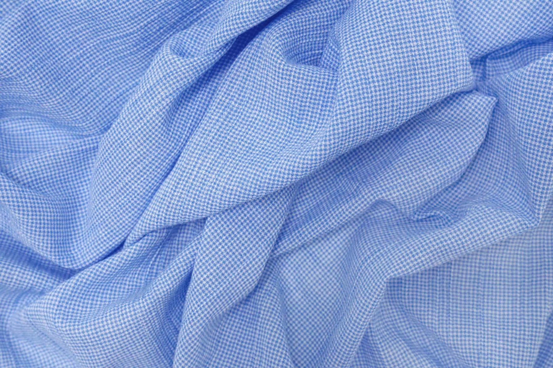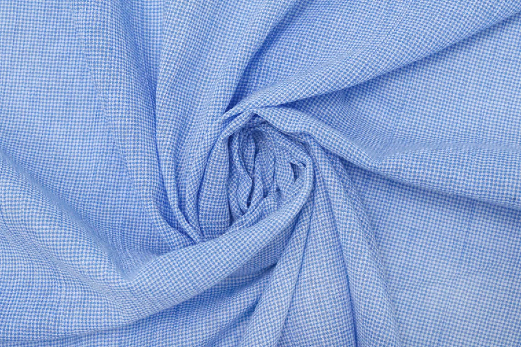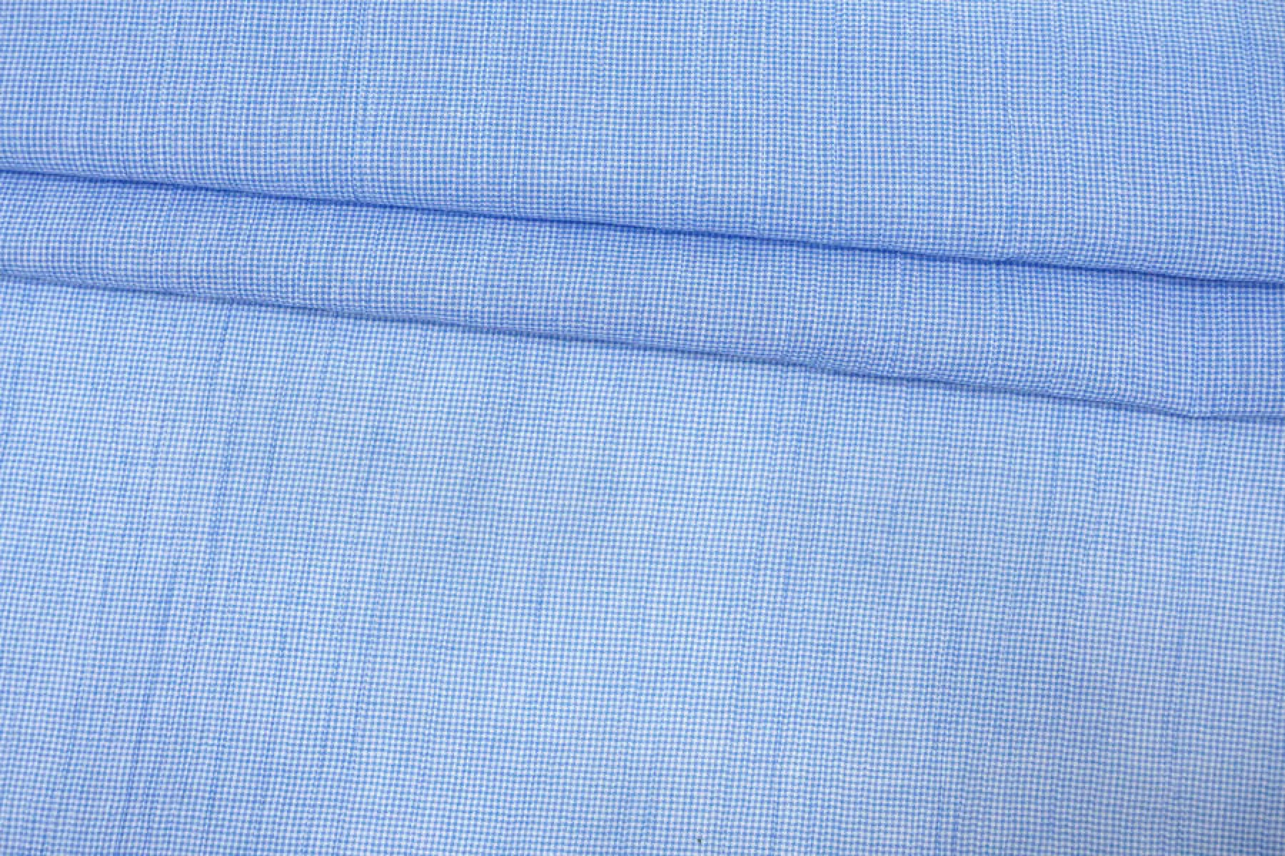 Итальянский рубашечный хлопок с мелким узором (напоминает пепиту) из нитей белого и голубого цвета. Чуть жатый, напоминает сирсакер. Материал тонкий, легкий. Сминается и немного просвечивает. Тянется плетение. Пластичный. Форму не держит. Прекрасный вариант на рубашки, юбки, платья. Материал дает усадку.