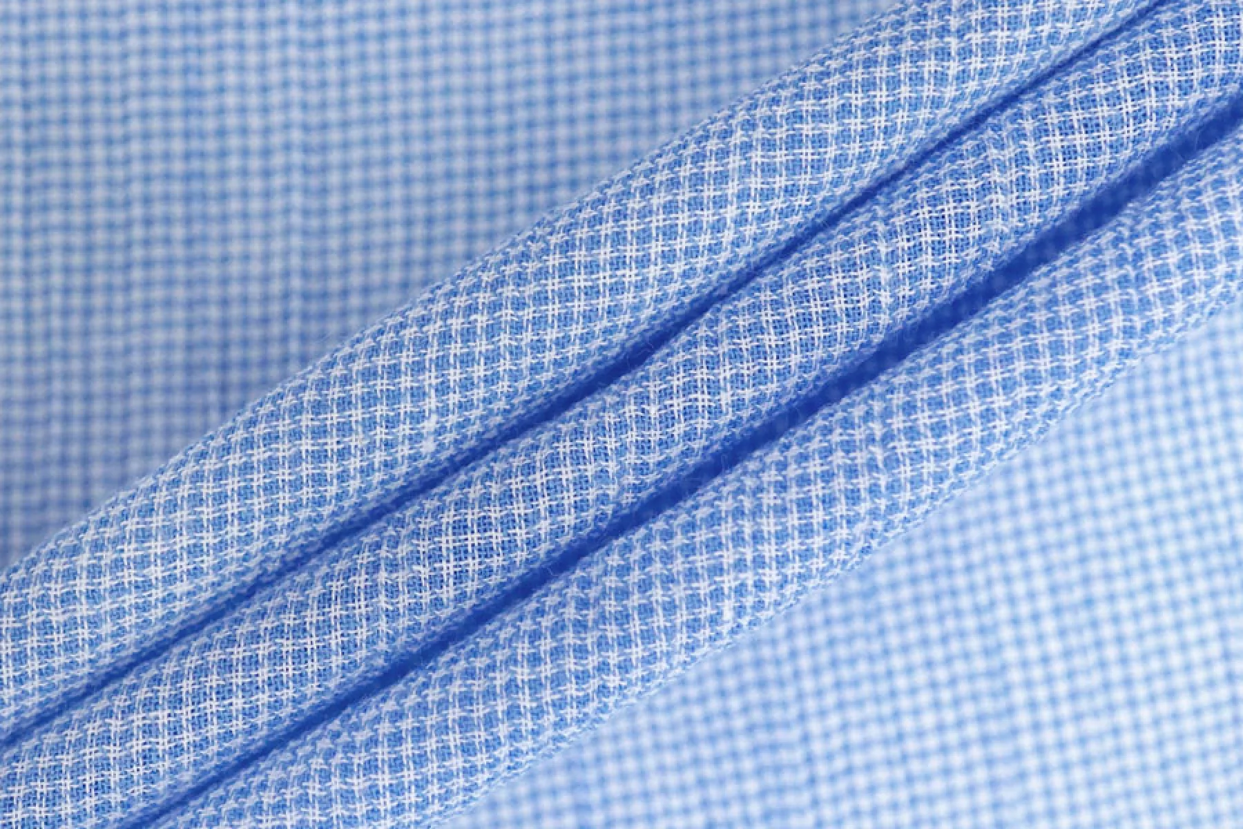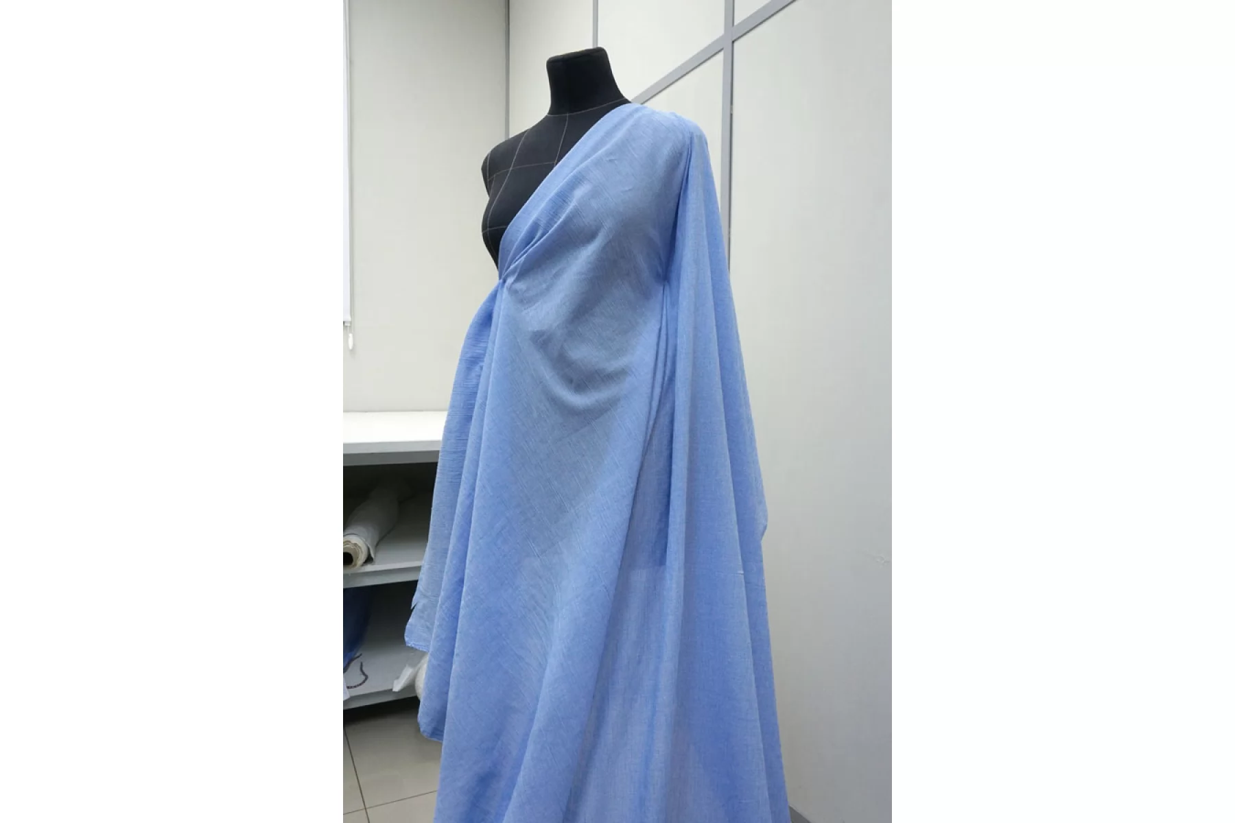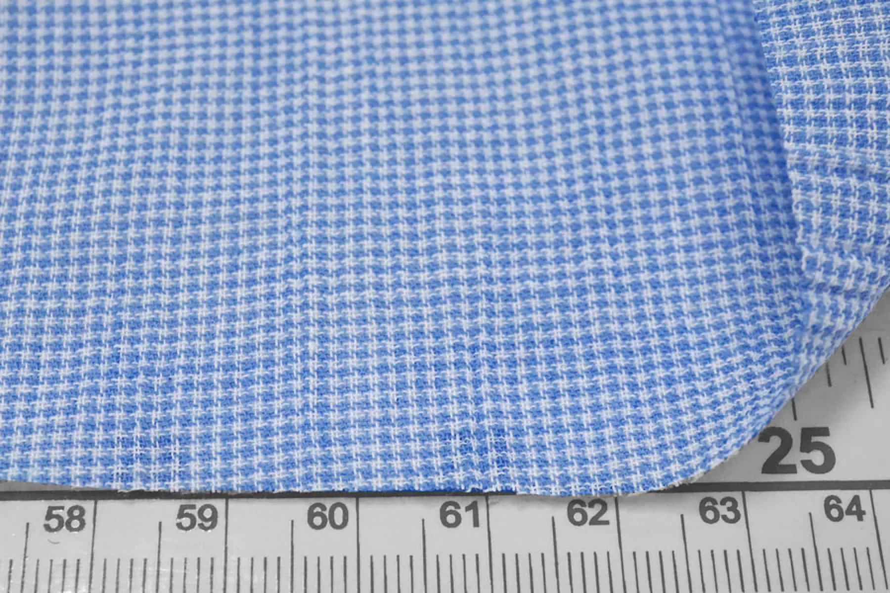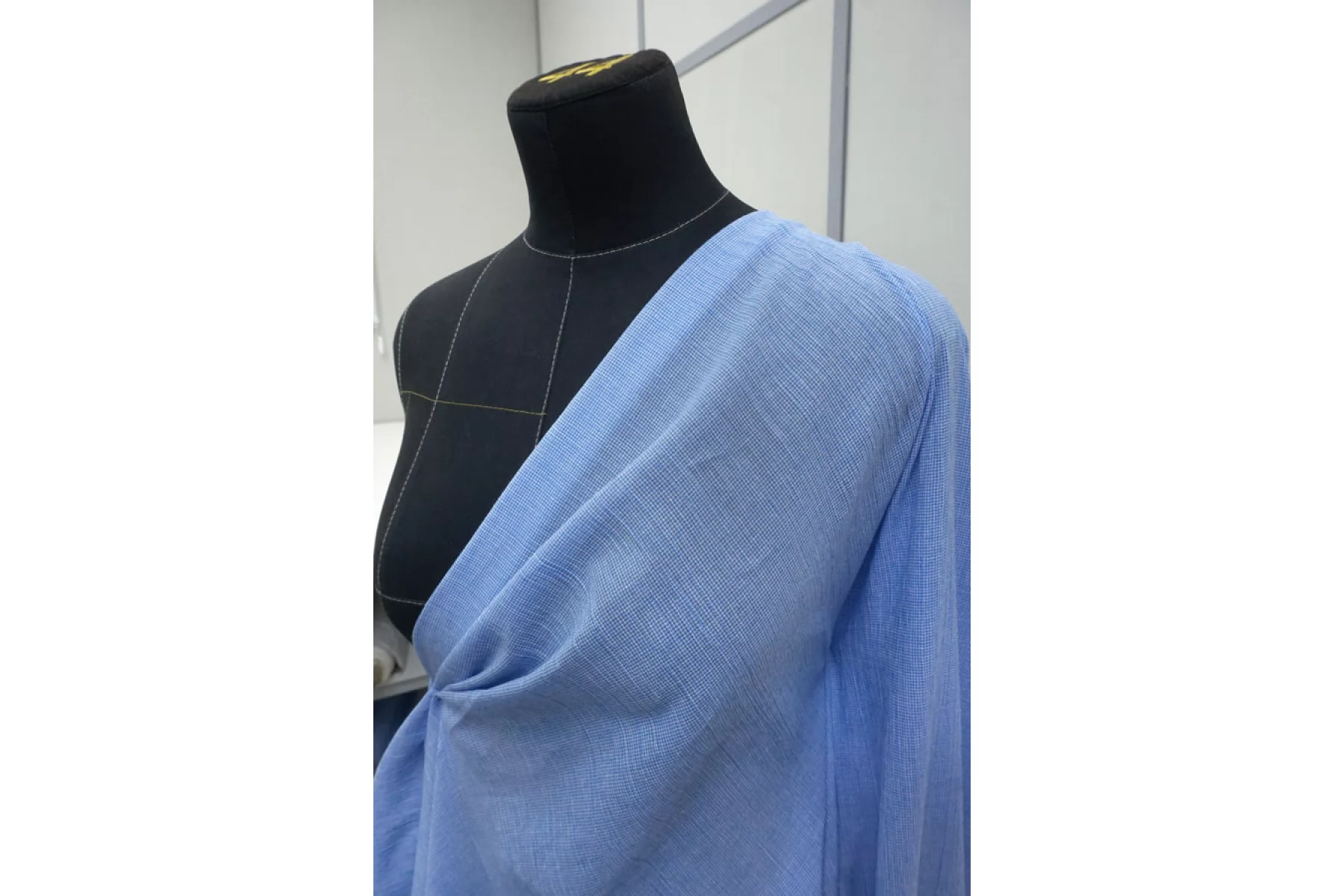 Итальянский рубашечный хлопок с мелким узором (напоминает пепиту) из нитей белого и голубого цвета. Чуть жатый, напоминает сирсакер. Материал тонкий, легкий. Сминается и немного просвечивает. Тянется плетение. Пластичный. Форму не держит. Прекрасный вариант на рубашки, юбки, платья. Материал дает усадку.