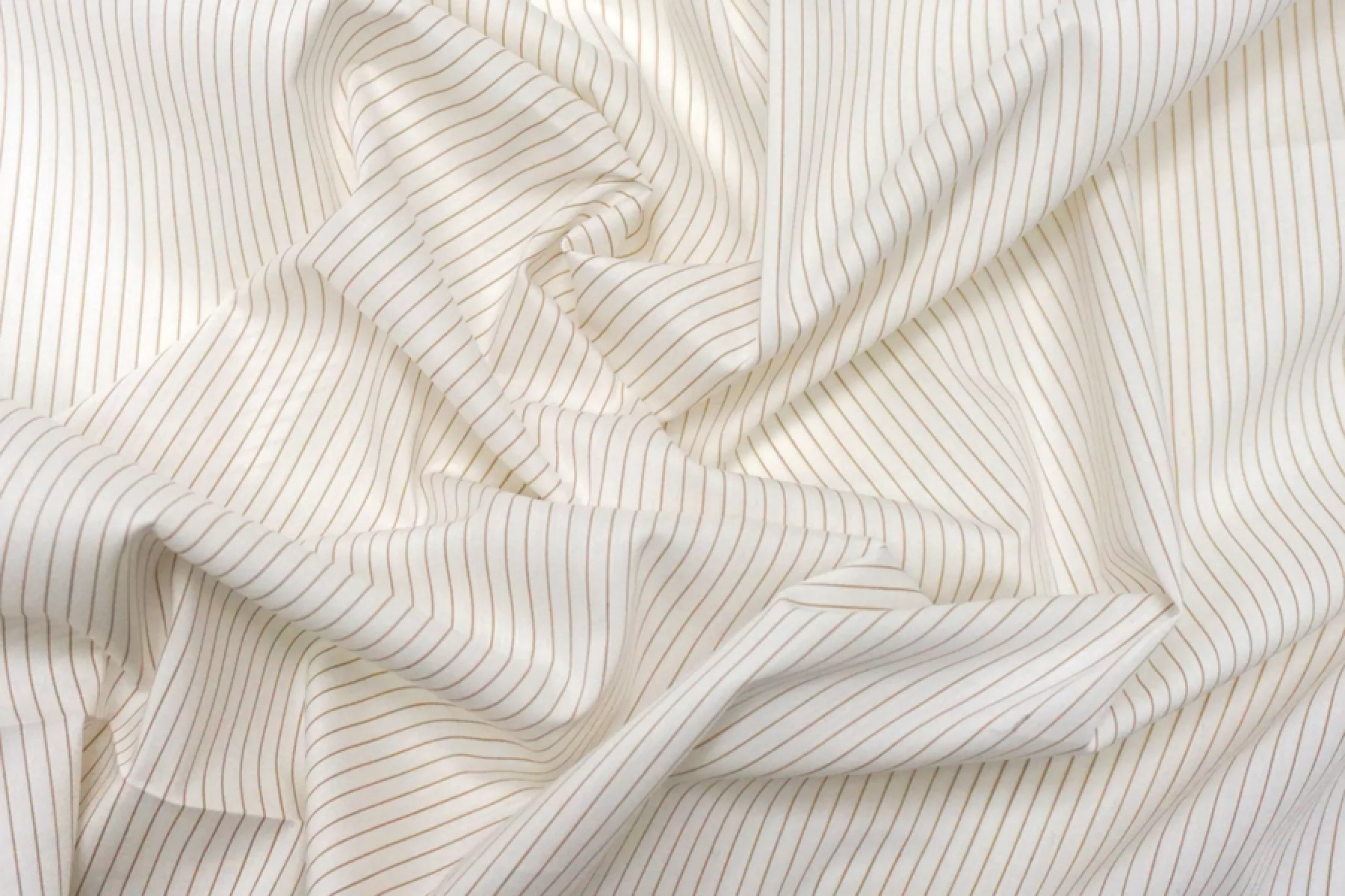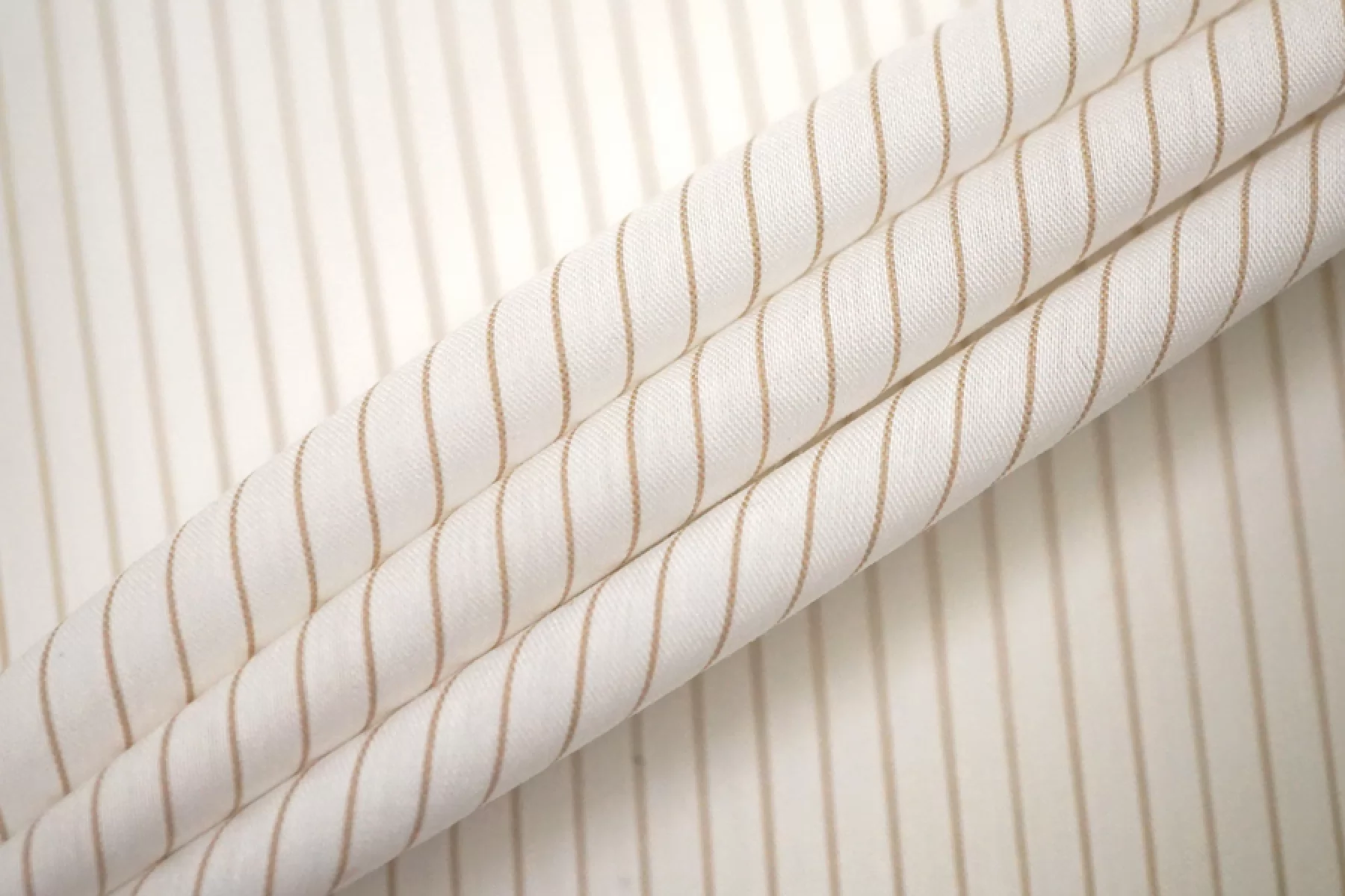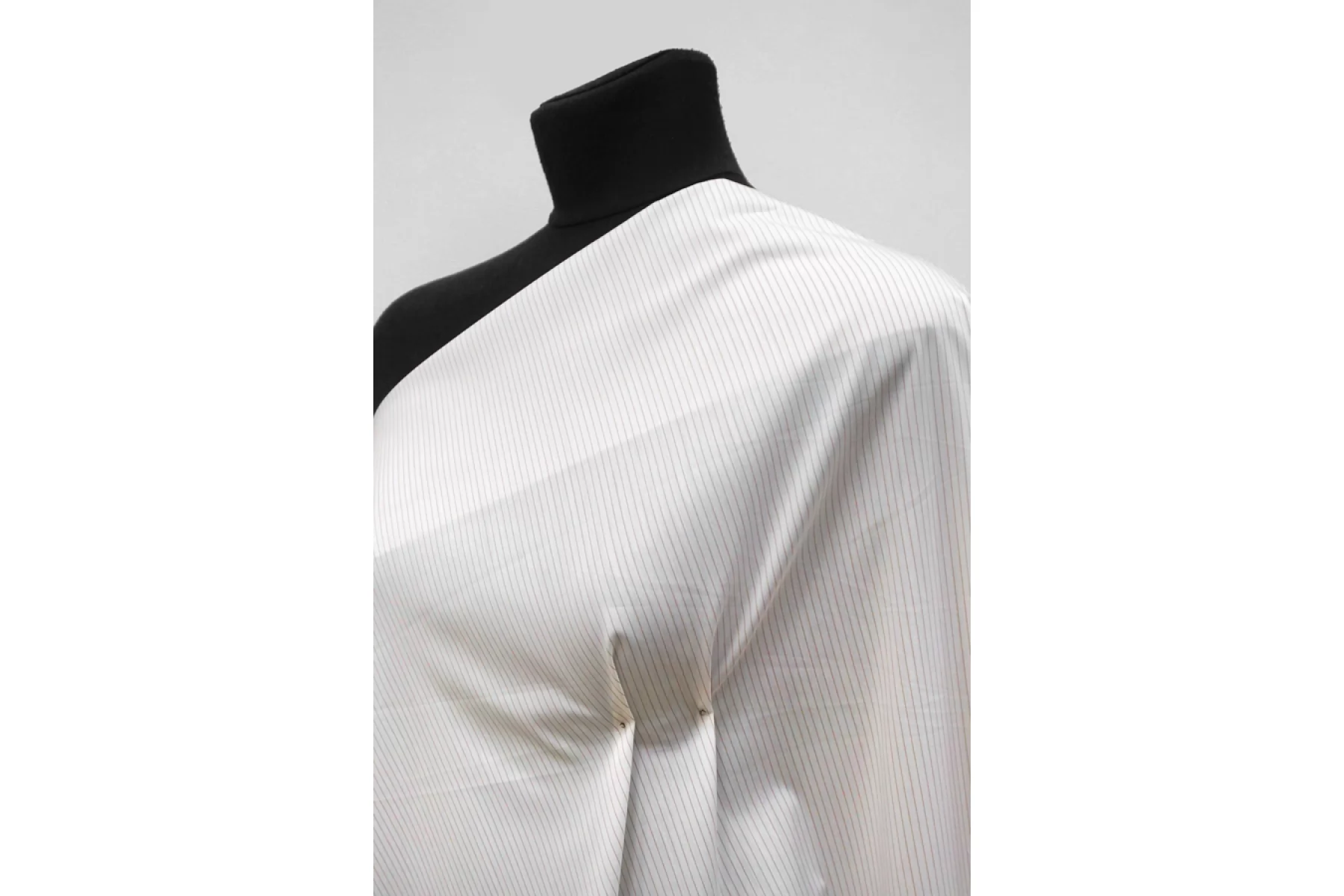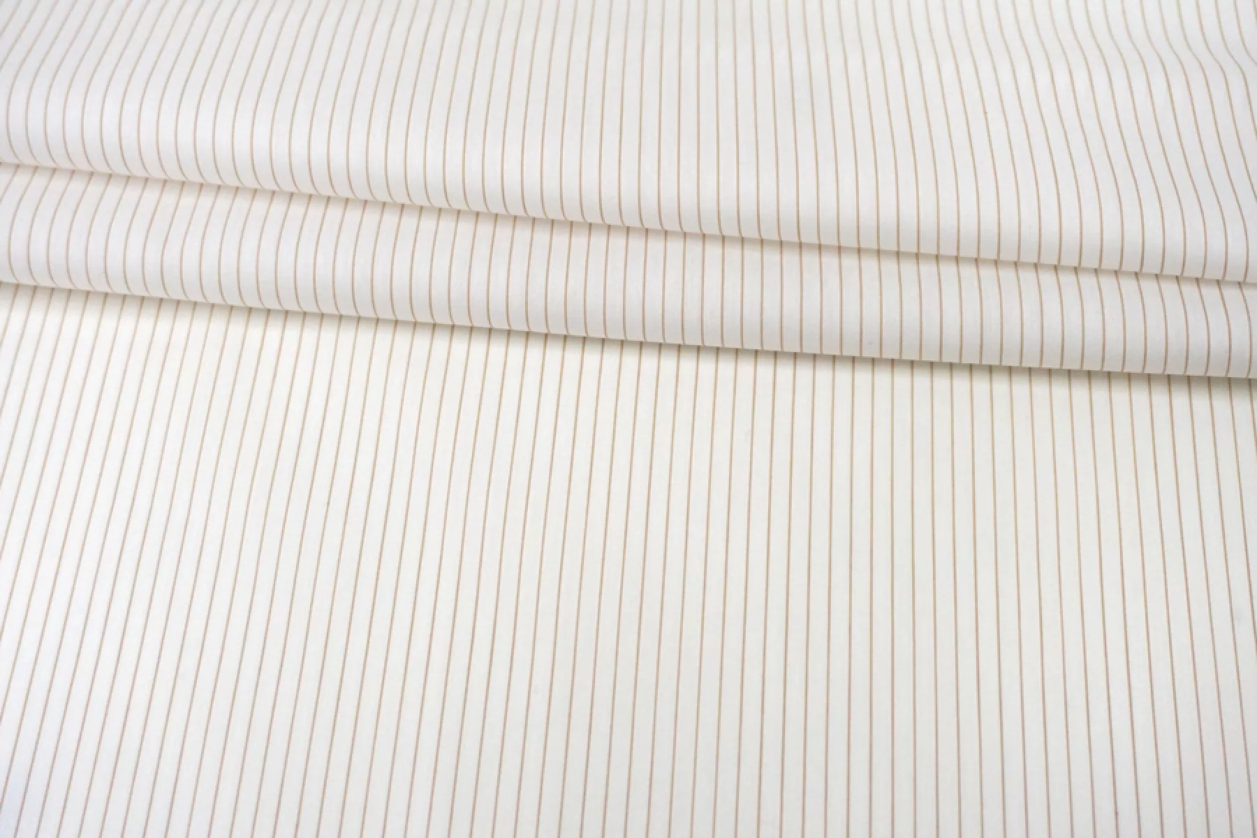 Рубашечный хлопок белого цвета в узкую бежевую полоску. Полоска расположена вдоль кромки. Тактильно очень приятный и мягкий, гладкий. Мнется. Тянется. Немного просвечивает в один слой. Хорошо драпируется и немного держит форму. Прекрасный вариант на рубашки, платья, юбки и не только.