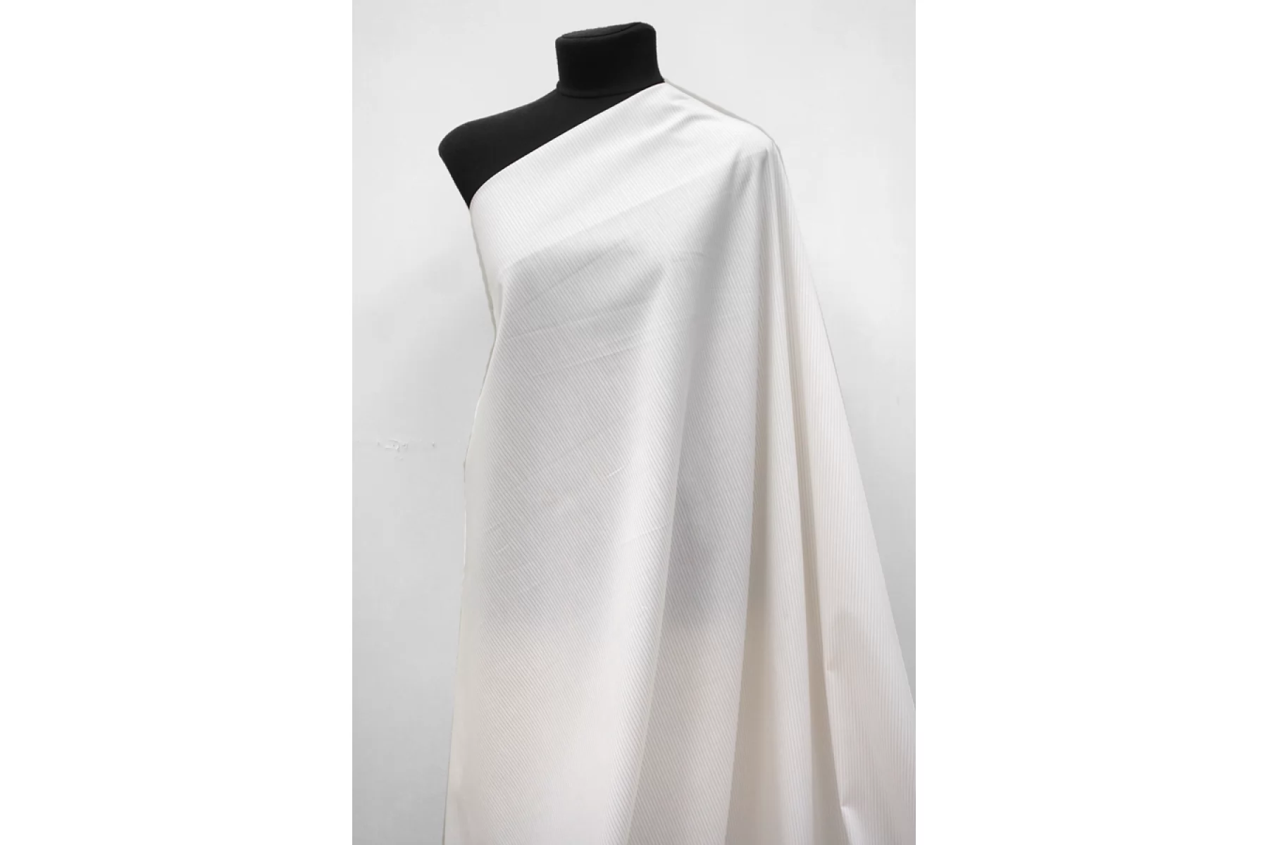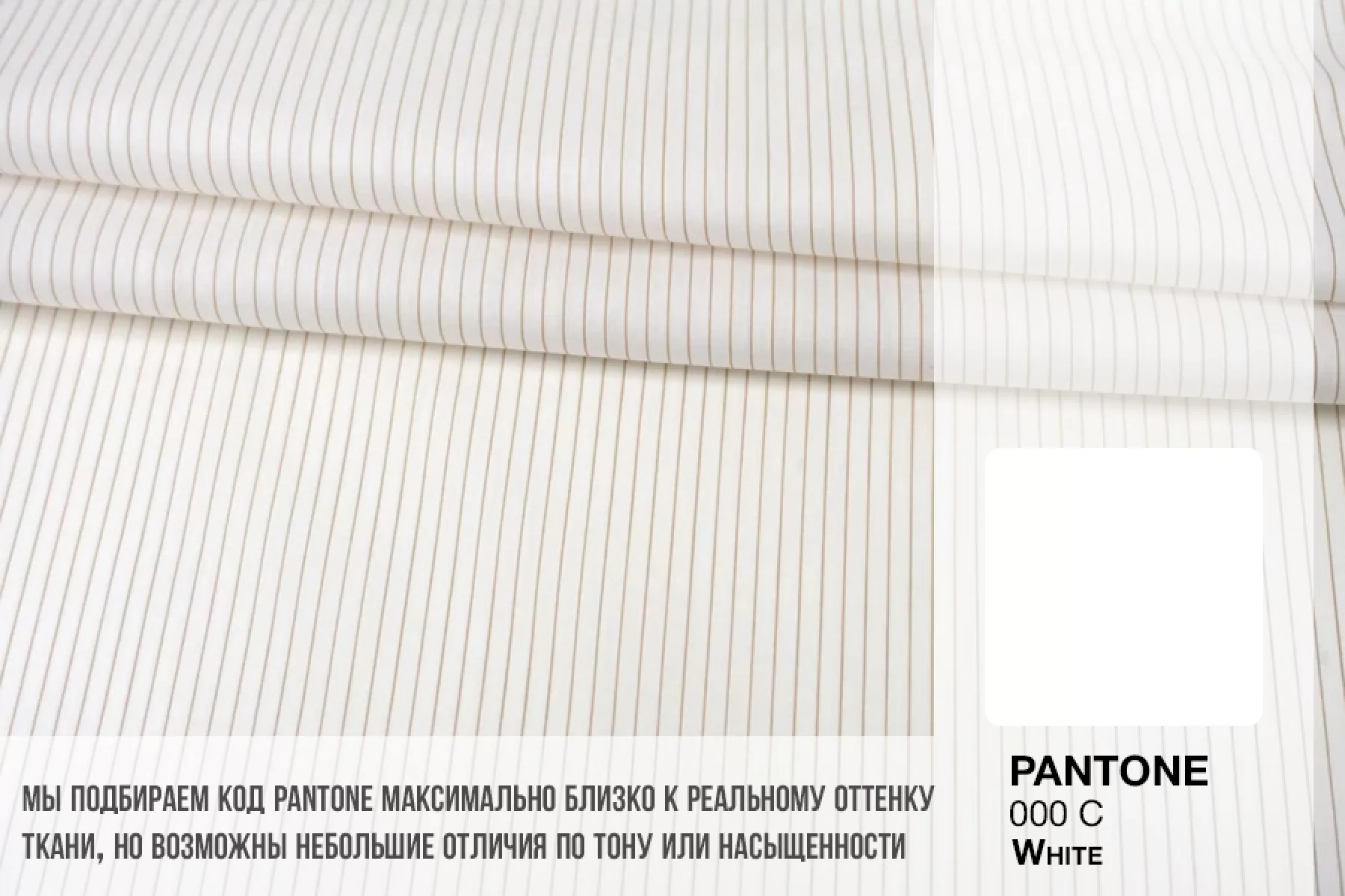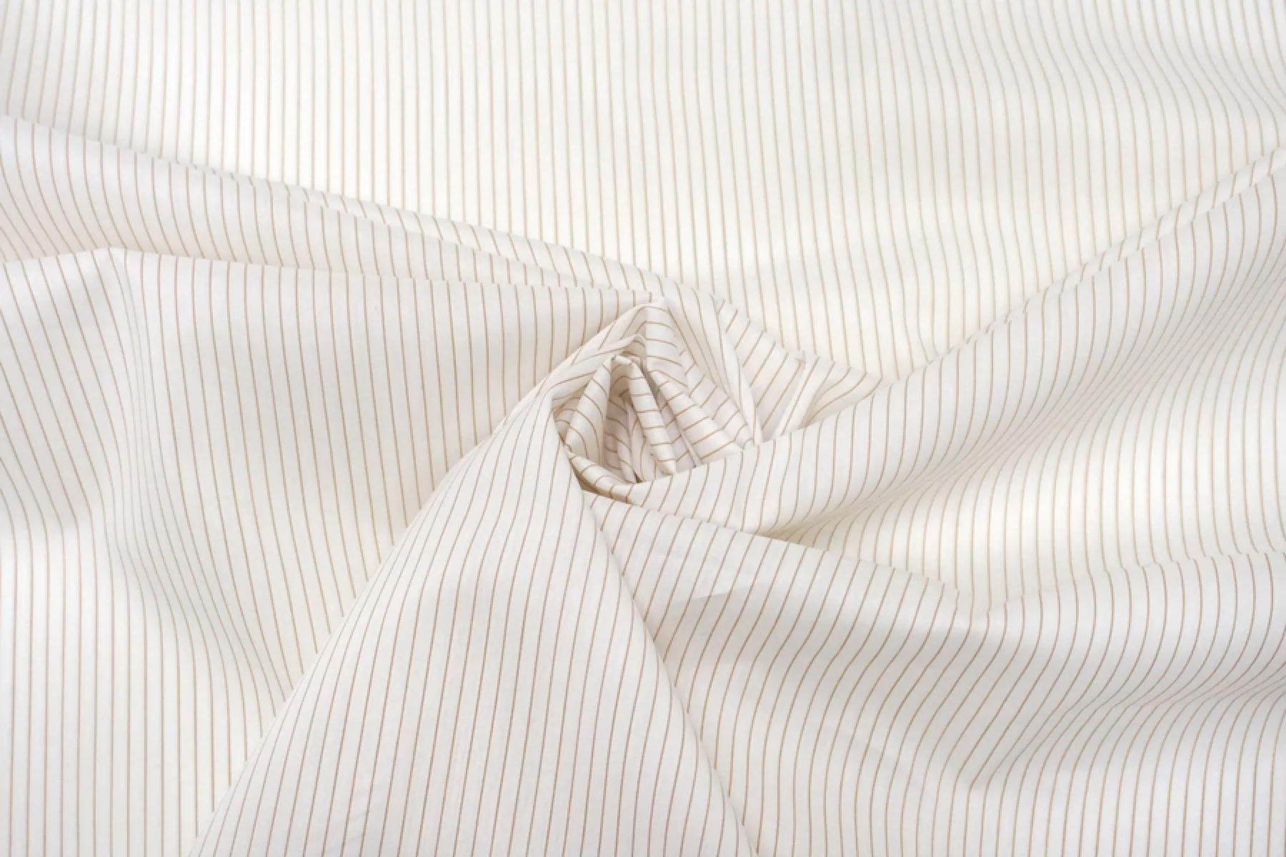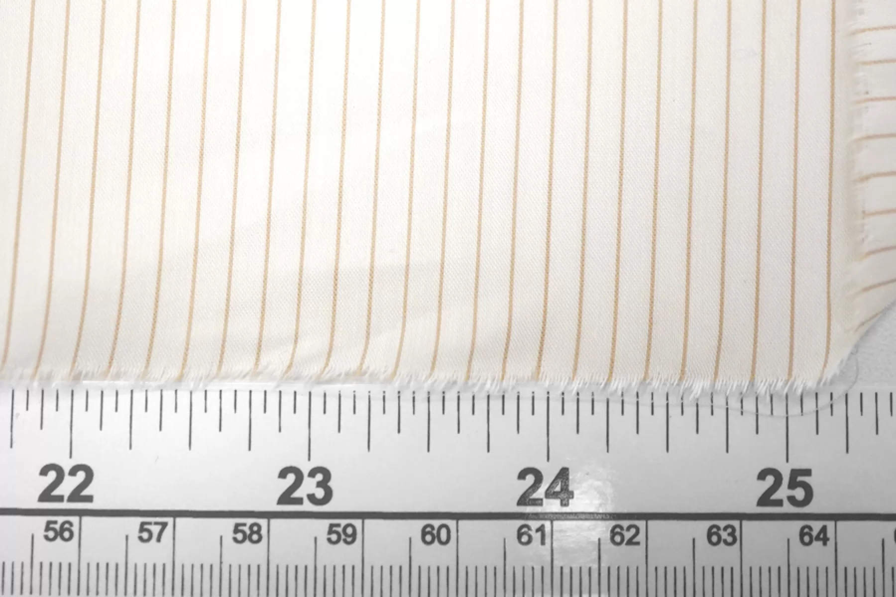 Рубашечный хлопок белого цвета в узкую бежевую полоску. Полоска расположена вдоль кромки. Тактильно очень приятный и мягкий, гладкий. Мнется. Тянется. Немного просвечивает в один слой. Хорошо драпируется и немного держит форму. Прекрасный вариант на рубашки, платья, юбки и не только.