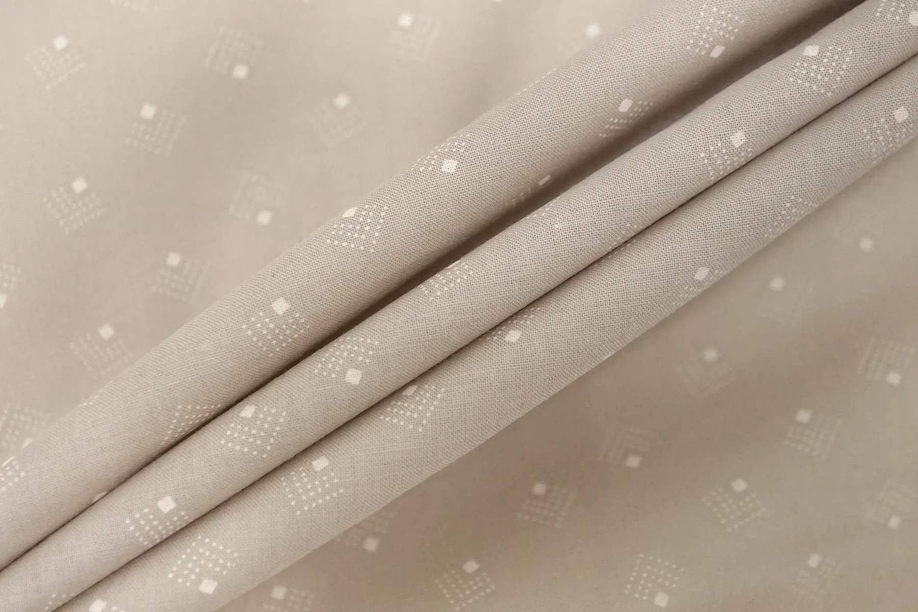 Рубашечный хлопок бежевого цвета с абстрактным молочным принтом. Тактильно приятный, мягкий, довольно тонкий. Просвечивает силуэт. Тянется. Хорошо драпируется. Форму не держит, по плотности близок к батисту. Сминается. Классный вариант на рубашки, платья, сарафаны и юбки. При необходимости используйте подкладочный материал.
