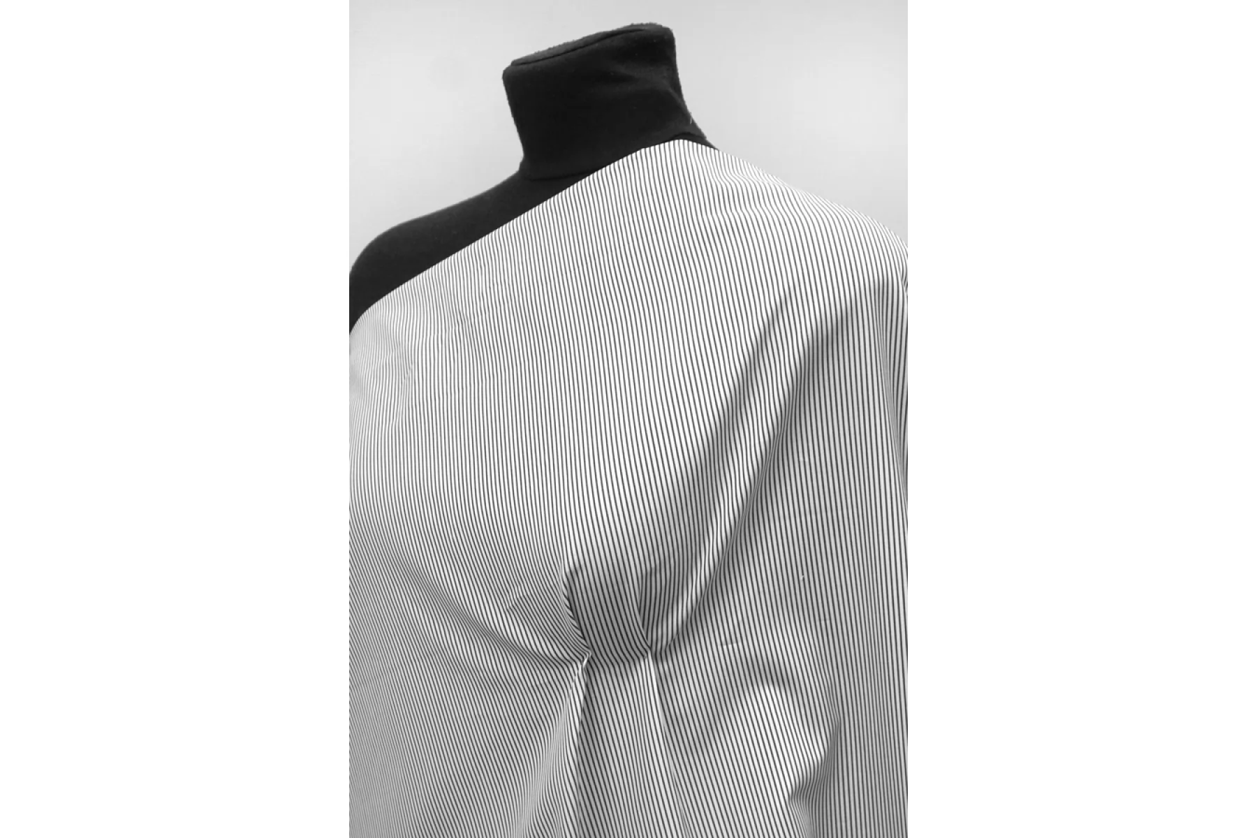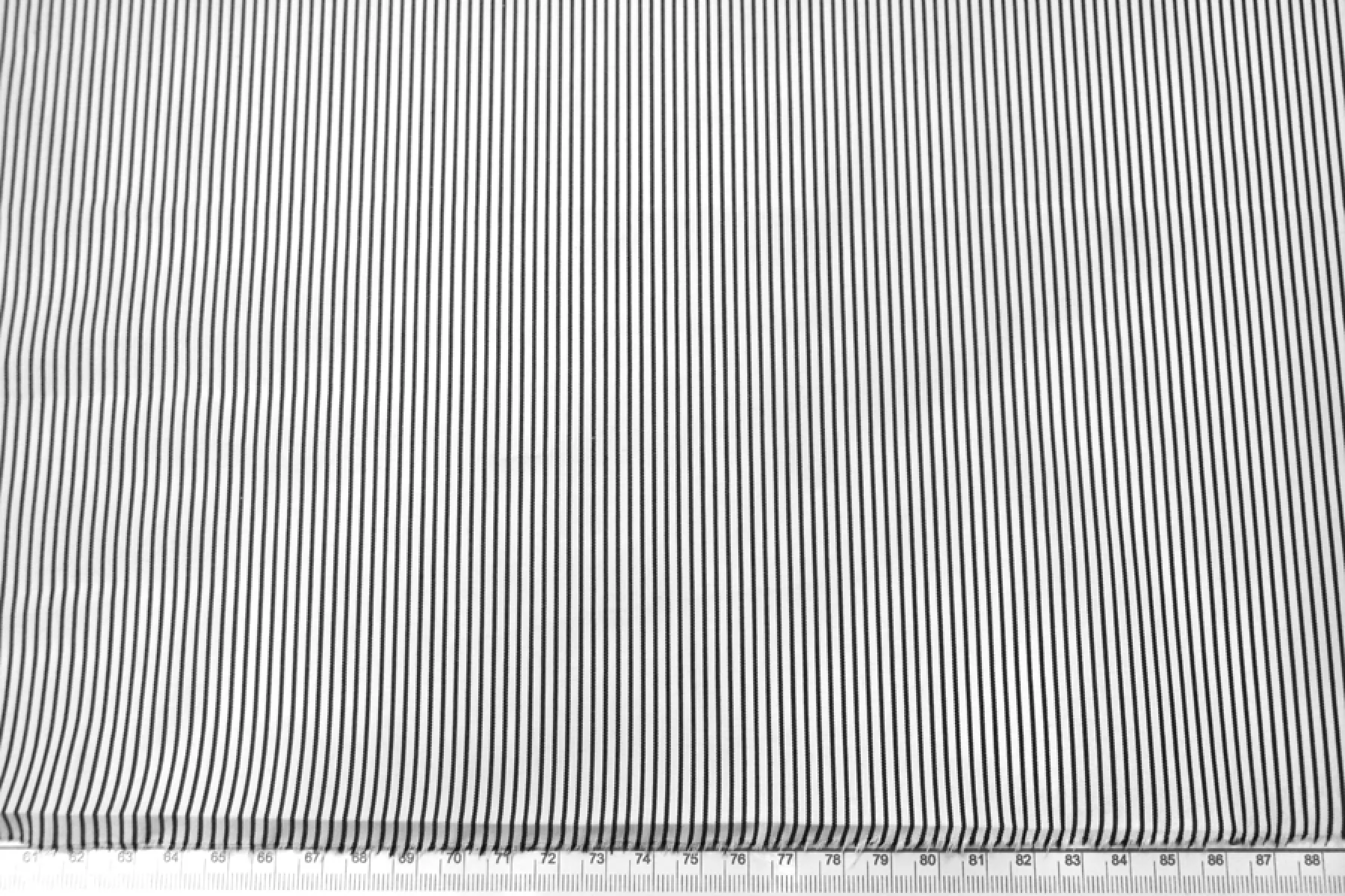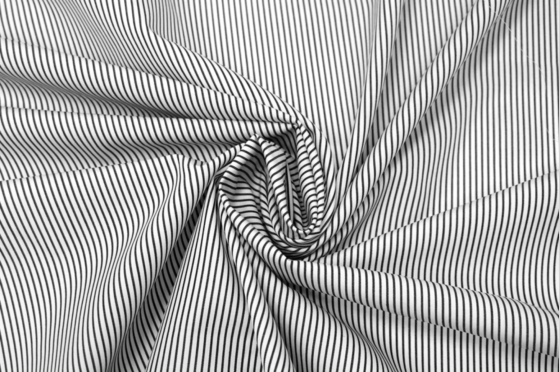 Итальянский рубашечный хлопок в узкую черную полоску на чистом белом фоне. Материал гладкий, мягкий, тонкий, легкий, очень приятный тактильно. Сминается и немного виднеется силуэт на просвет. Не тянется, очень пластичный, форму практически не держит. Прекрасный вариант на рубашки, юбки, платья. Материал дает усадку.