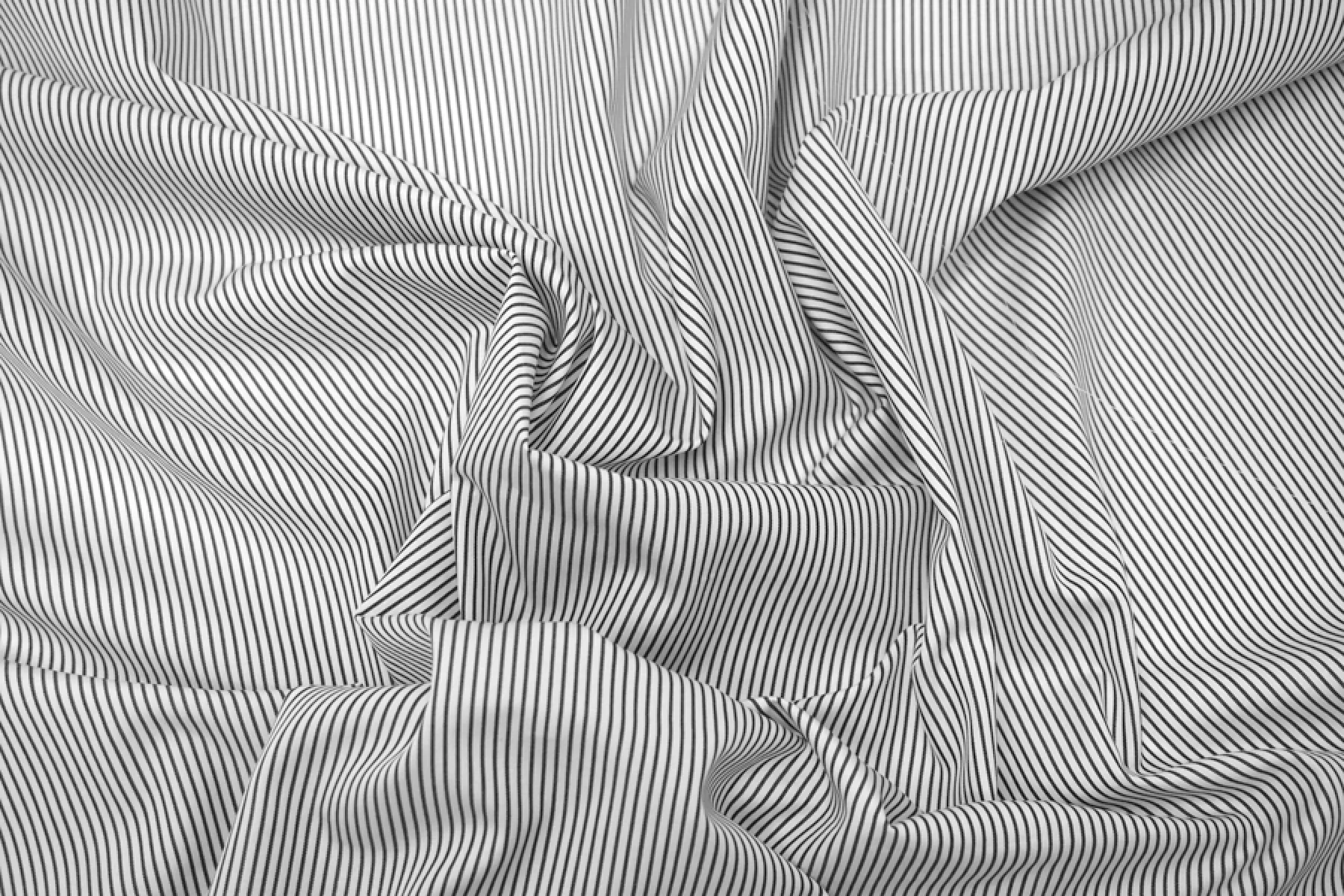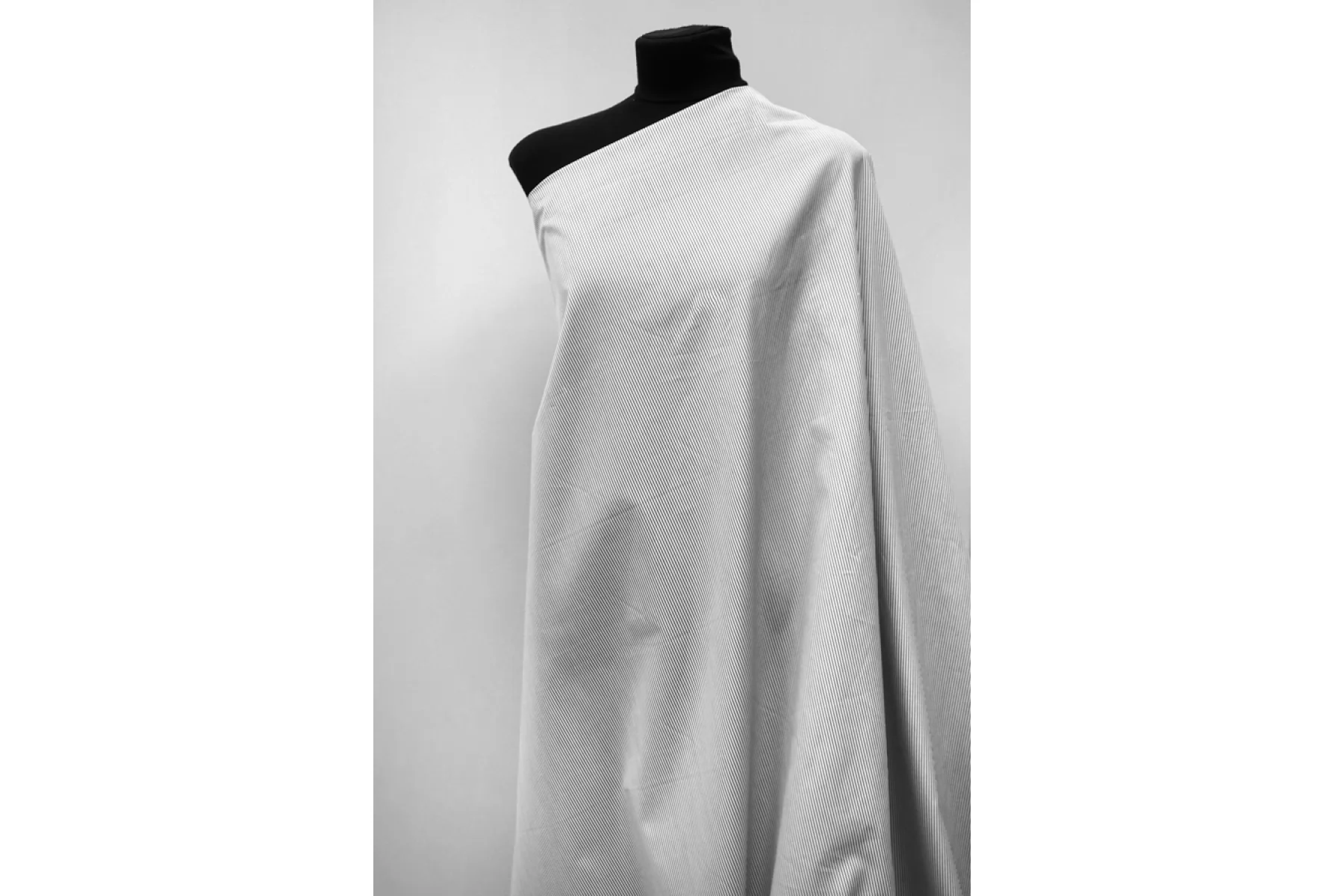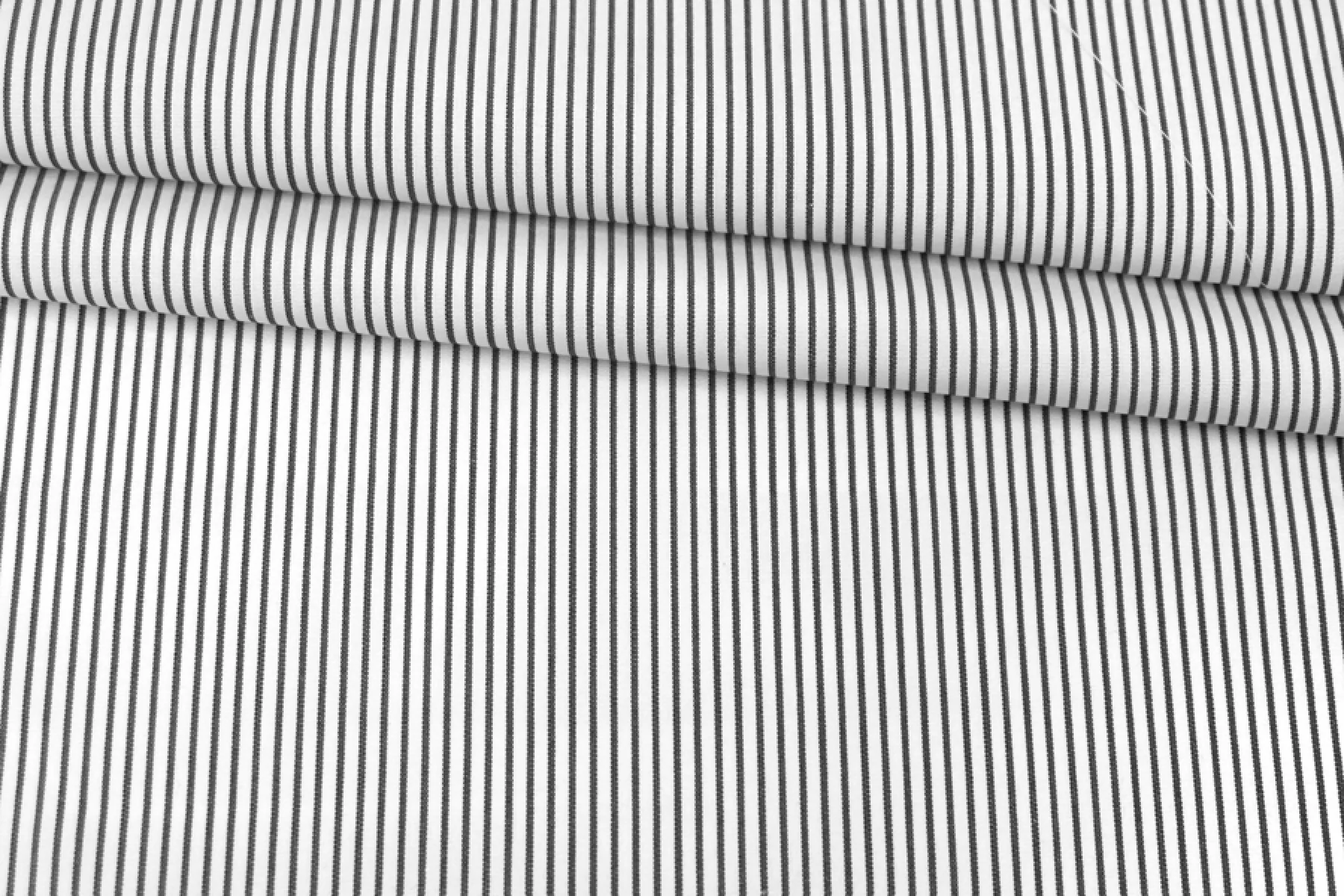Итальянский рубашечный хлопок в узкую черную полоску на чистом белом фоне. Материал гладкий, мягкий, тонкий, легкий, очень приятный тактильно. Сминается и немного виднеется силуэт на просвет. Не тянется, очень пластичный, форму практически не держит. Прекрасный вариант на рубашки, юбки, платья. Материал дает усадку.