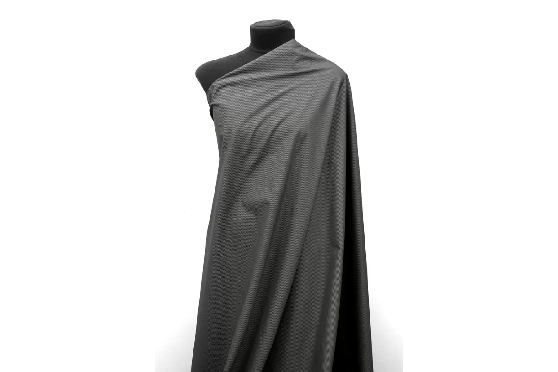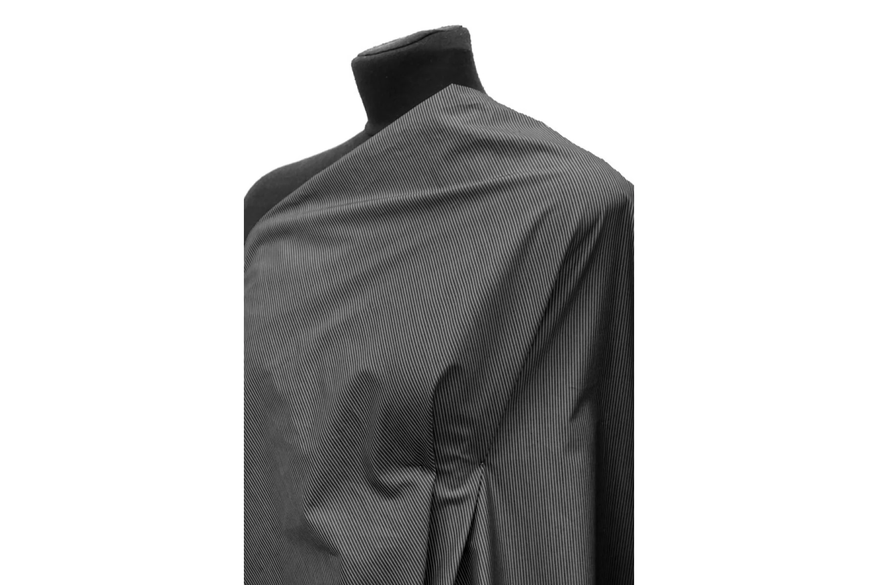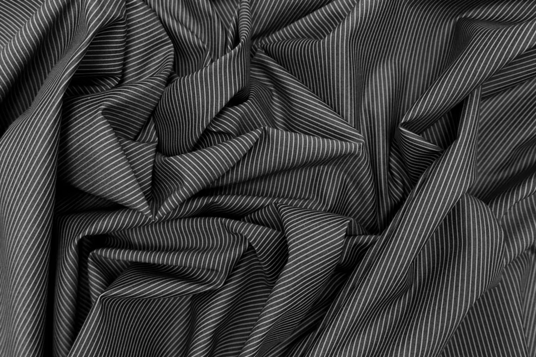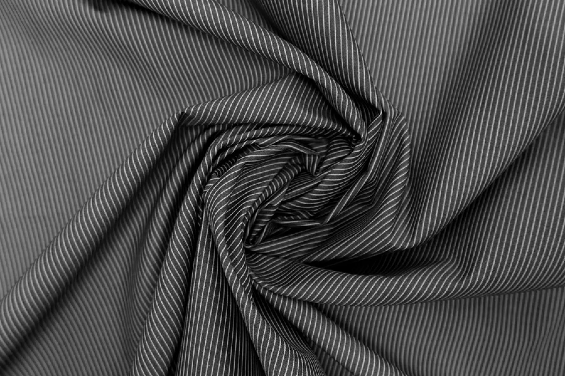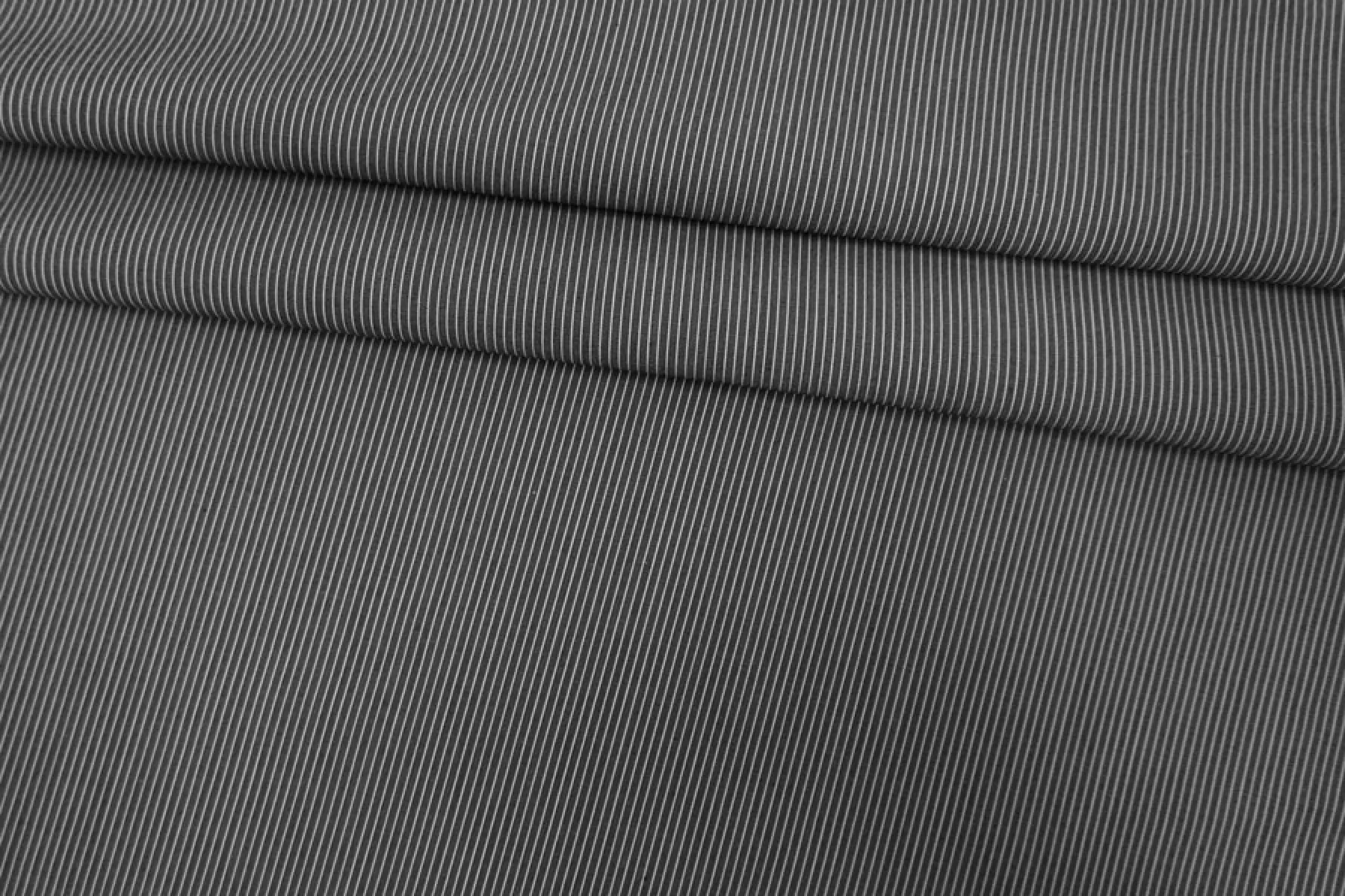 Прекрасный рубашечный хлопок в полоску, нити белого и черного цвета, общий тон получается графитово-белым (полоска параллельна кромке). Шуршащий и похрустывающий. Тактильно приятный, гладкий. Мнется умеренно. Не тянется. Не просвечивает. Хорошо драпируется, держит форму. Прекрасный вариант на рубашки, платья, юбки и не только.