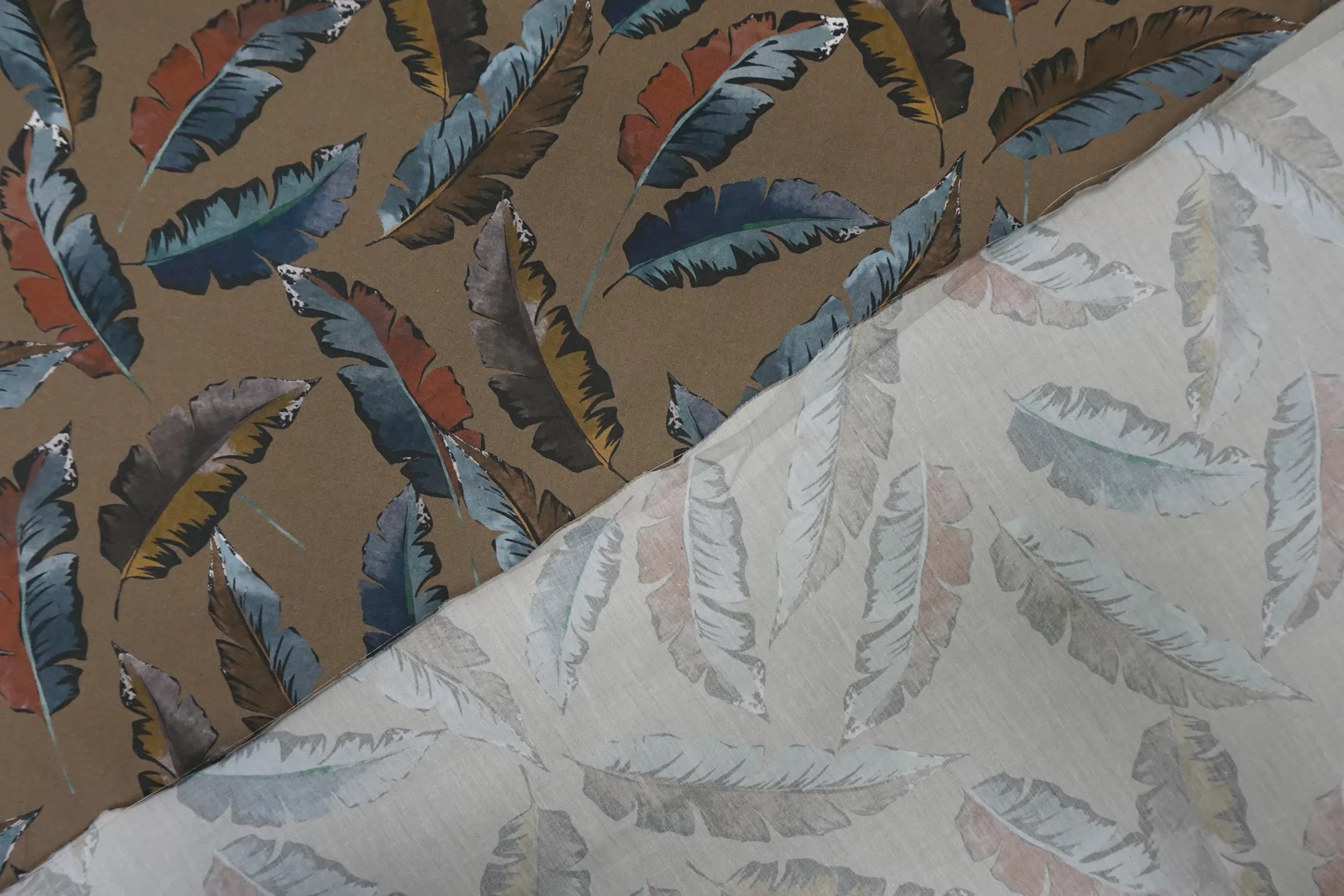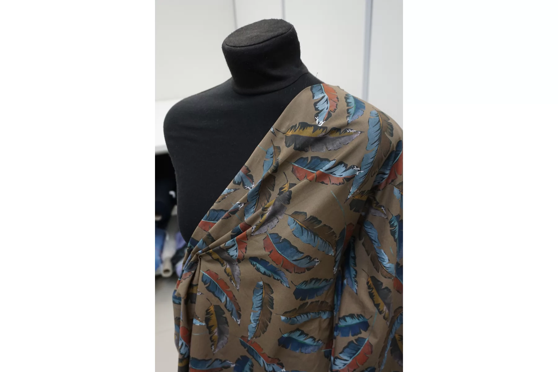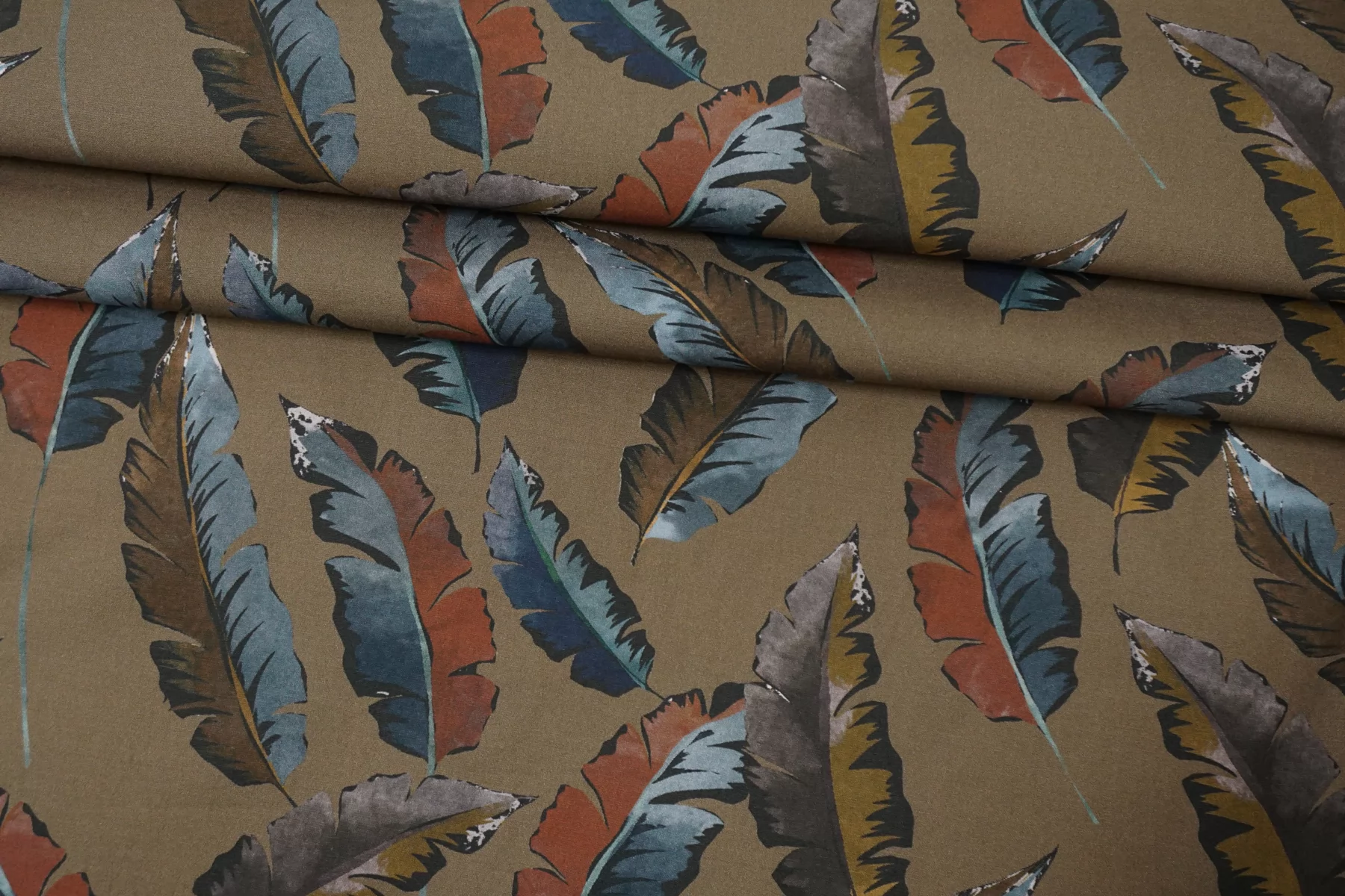 Рубашечный хлопок с принтом в виде разноцветных перьев на коричневом фоне (есть лёгкий зеленоватый подтон). Плетение полотняное. Приятный, мягкий. Легкий. Мнется. Минимально просвечивает в один слой, в изделии заметно не будет. Вариант на свободные рубашки, платья, сарафаны и юбки. При необходимости используйте подкладочный материал.
