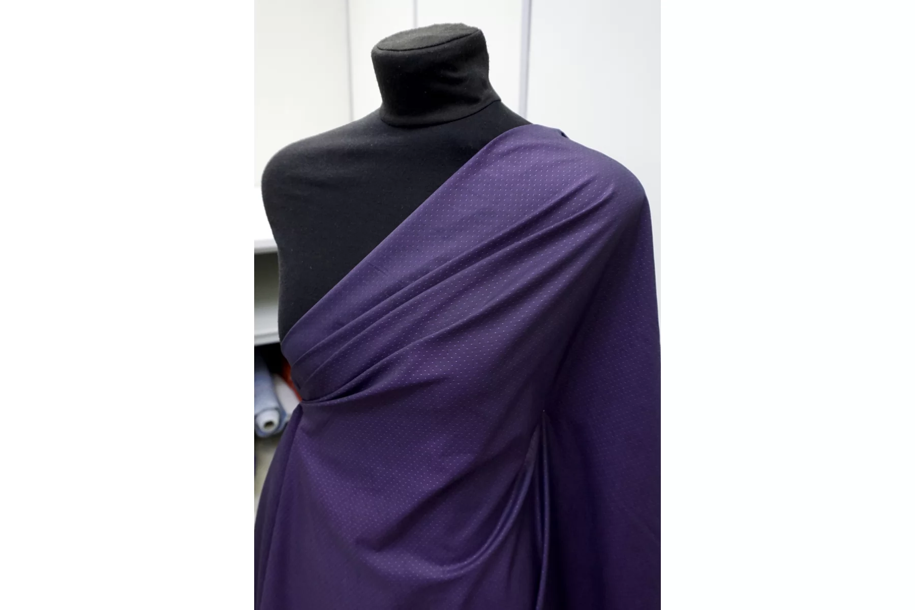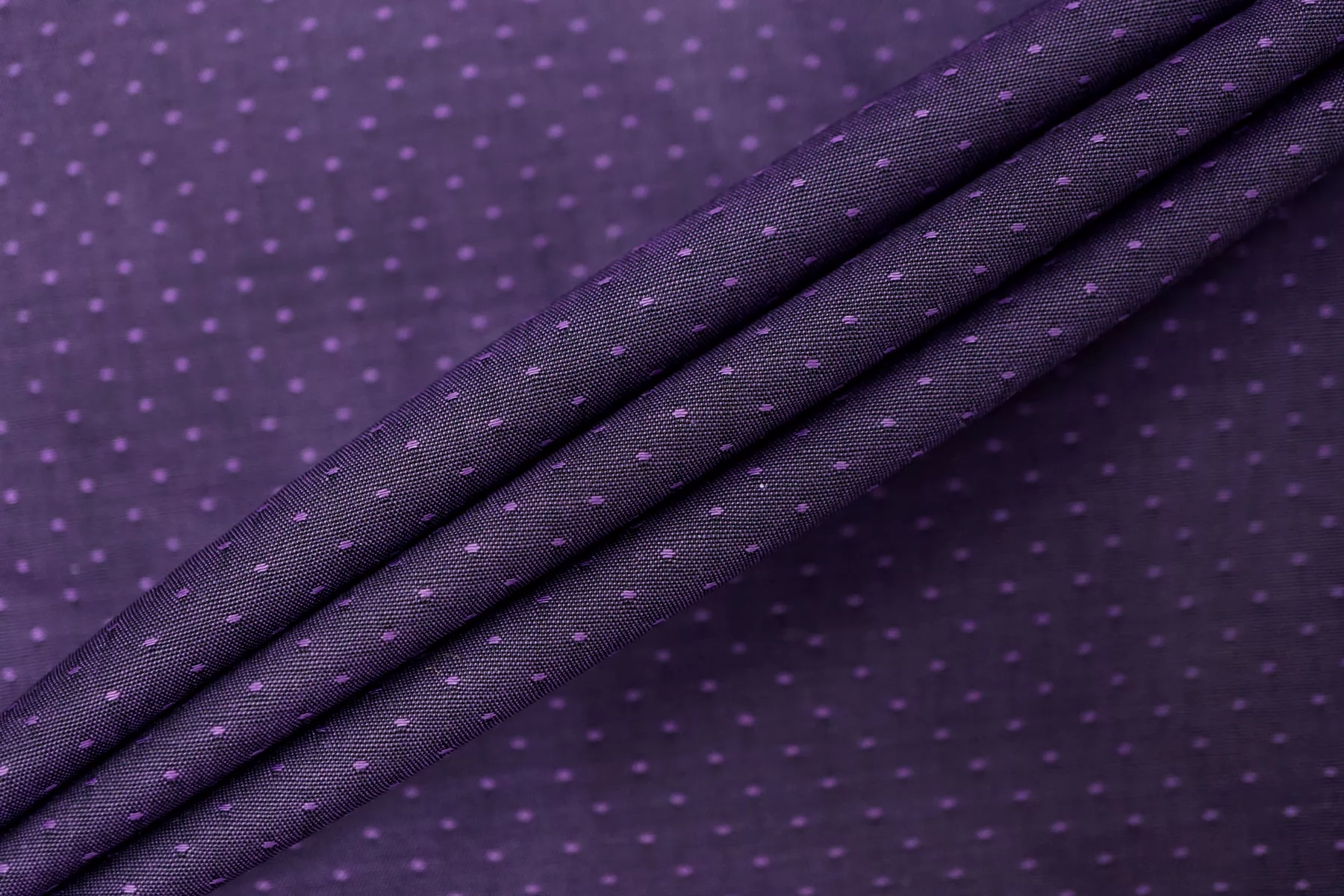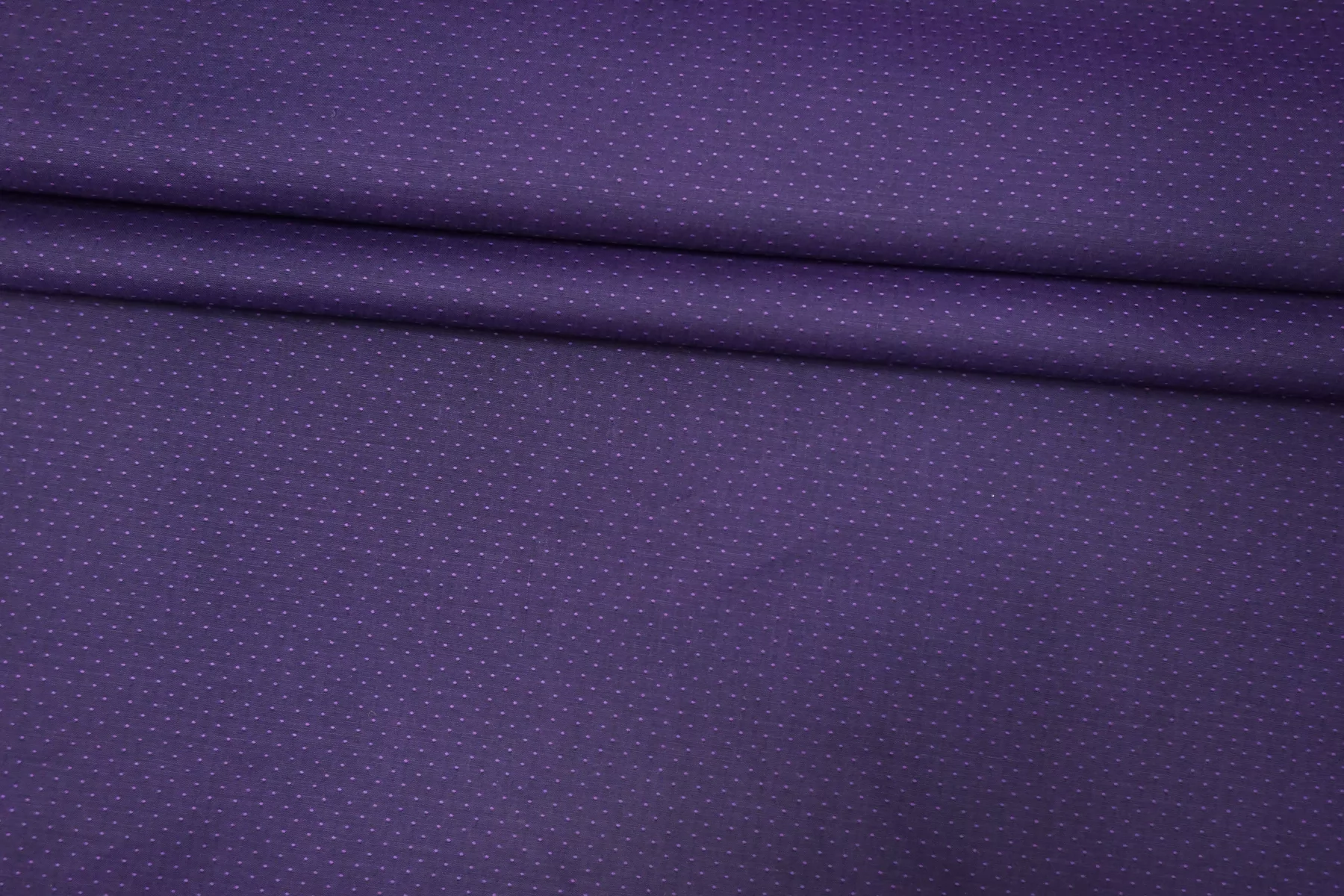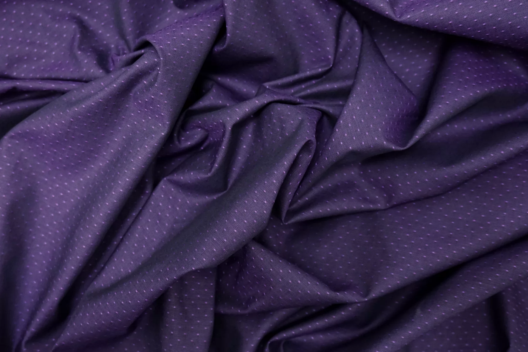 Итальянский хлопок рубашечно-плательной плотности, с мелкой жаккардовой выработкой. Фиолетового цвета. Материал приятный тактильно, мягкий. Немного мнется. Слегка просвечивает силуэт, не тянется. Пластичный и немного держит форму. Прекрасный вариант на рубашки, юбки, платья, брюки. Материал дает усадку.