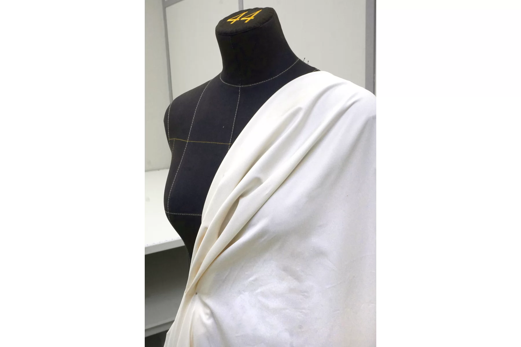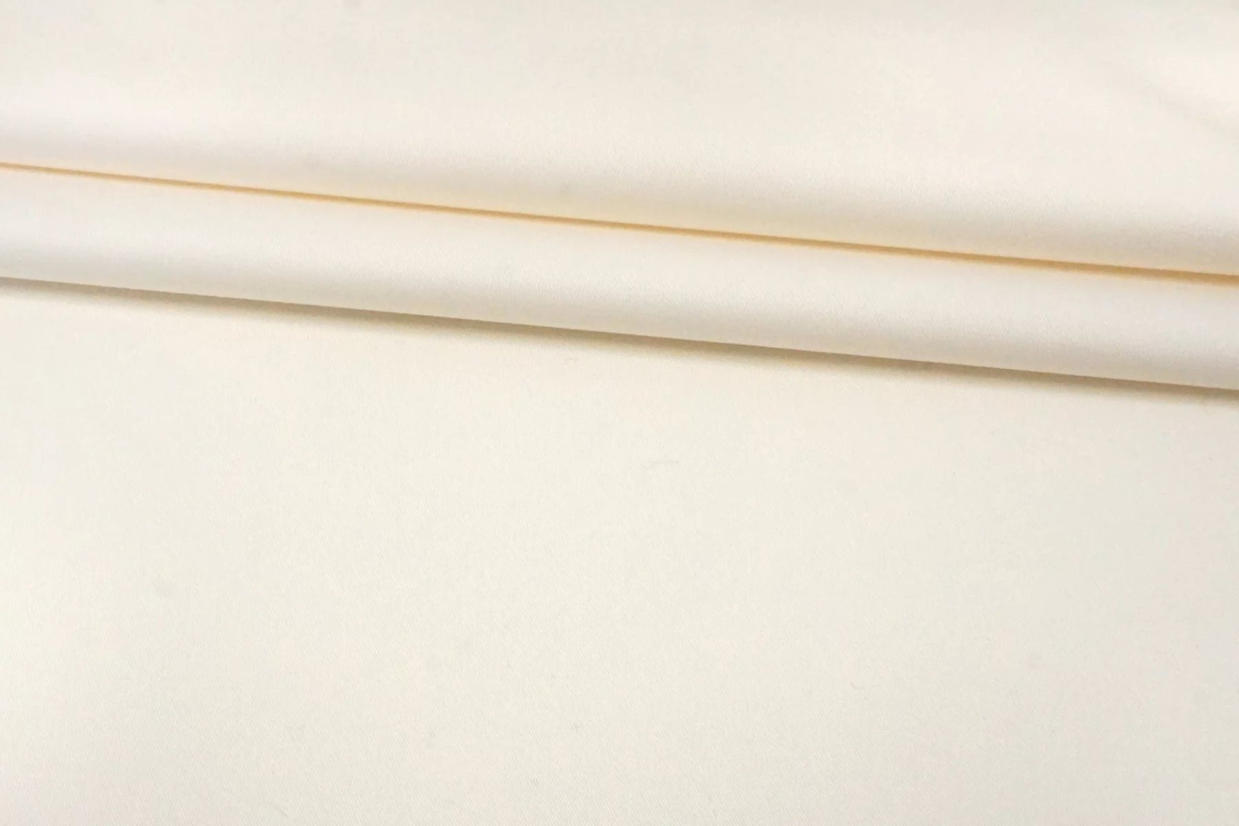 Прекрасный костюмно-плательный хлопок в нежном молочно-кремовом оттенке. Гладкий, мягкий, приятный. С легким матовым лоском. Сминается. Неплохо тянется. Не просвечивает. Хорошо драпируется, форму не держит. Прекрасный вариант на костюмы, платья, брюки и не только.