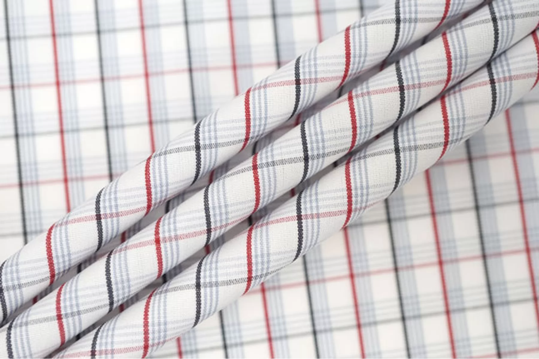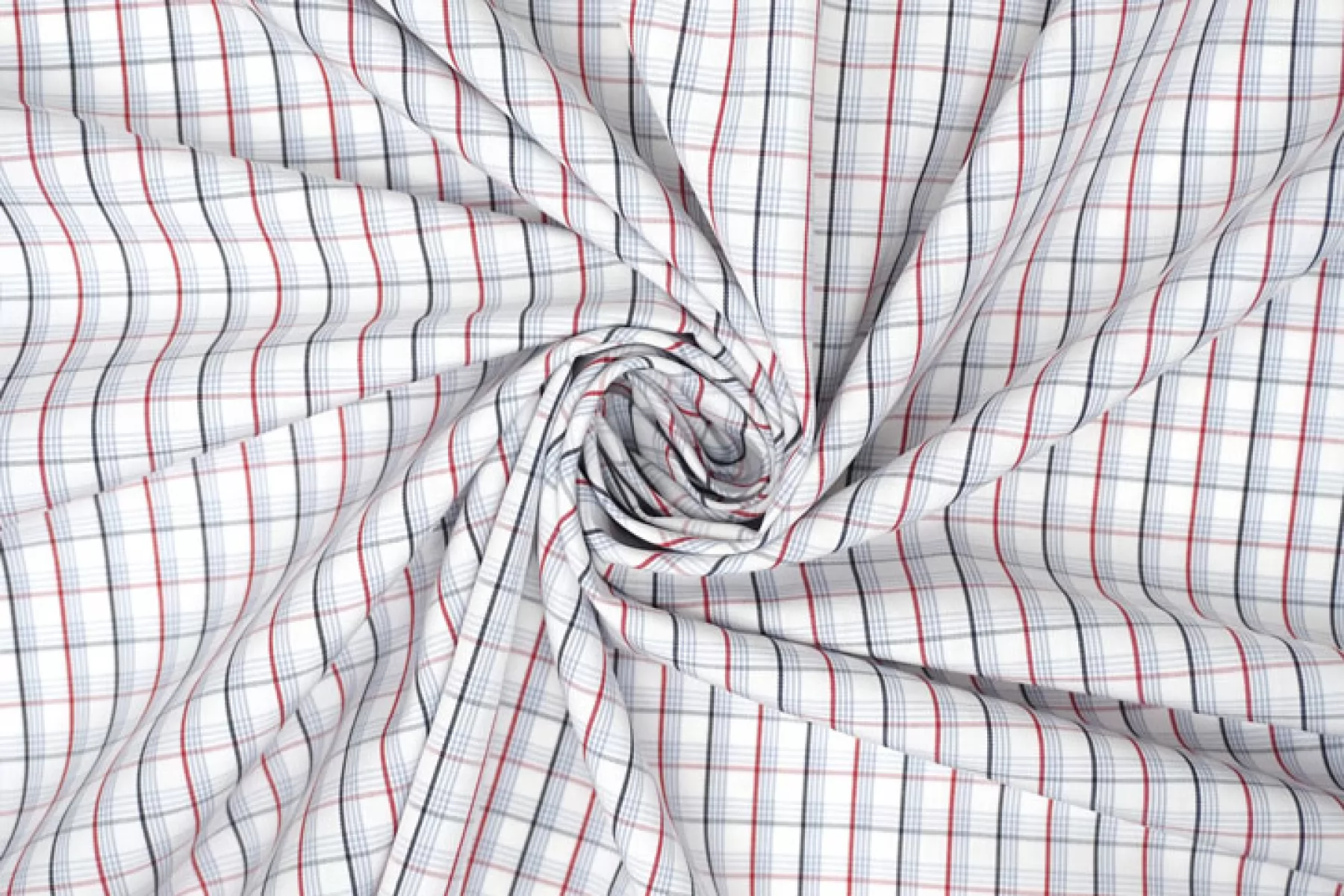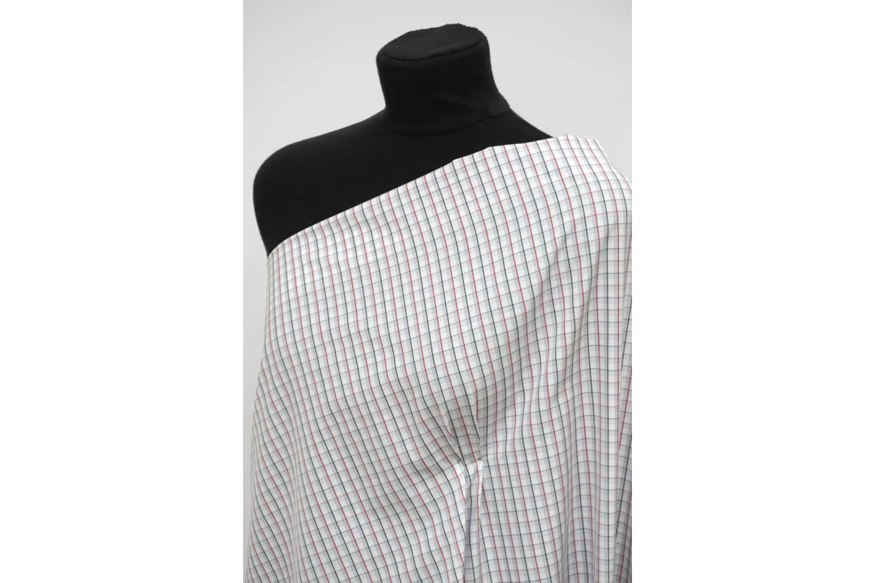 Итальянский рубашечный хлопок от модного дома GUCCI белого цвета в клеточку из красных, серых, голубых и черных полос. Материал тактильно приятный, мягкий, плотненький. Немного мнется, но немного восстанавливается. Слегка просвечивает силуэт. Не тянется. Отлично драпируется и неплохо держит форму. Прекрасный вариант на рубашки, юбки, платья и не только. Материал дает усадку.