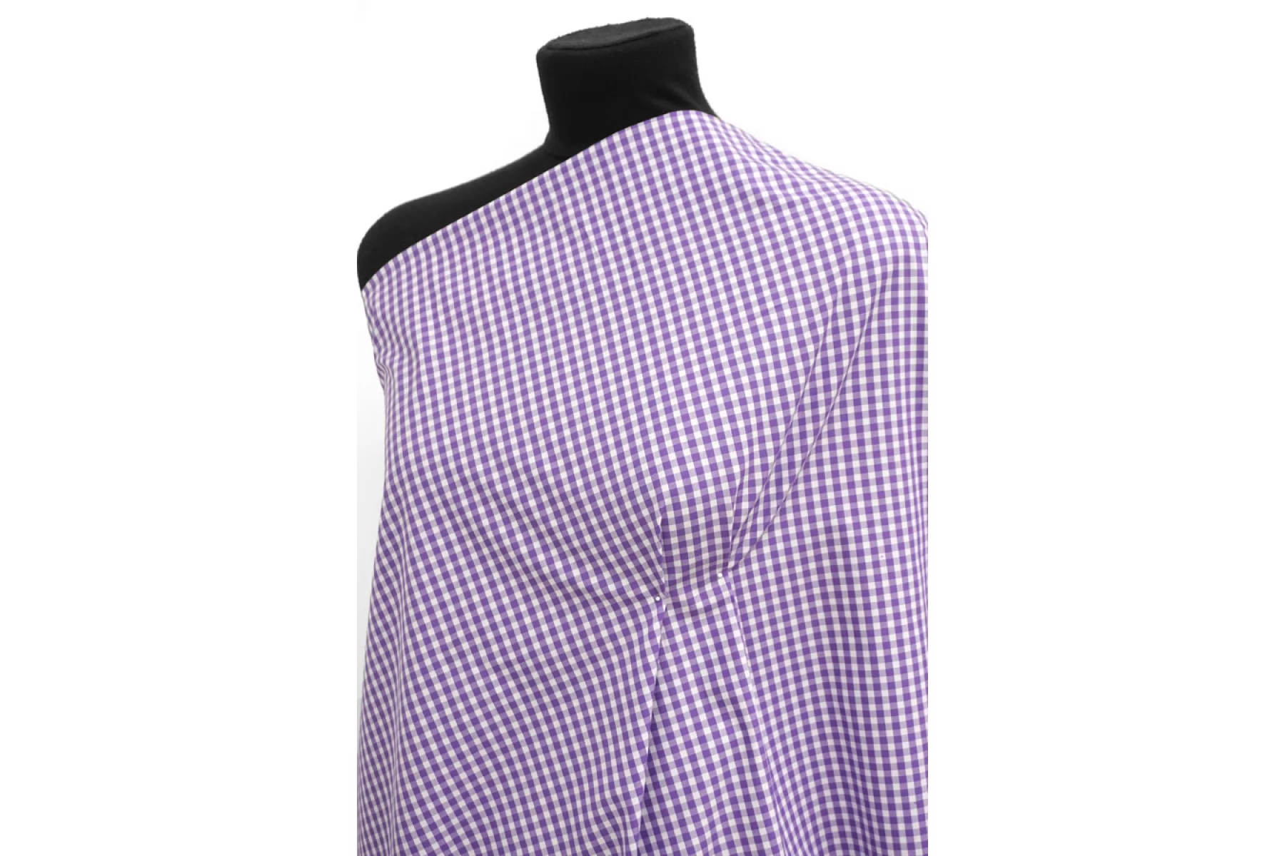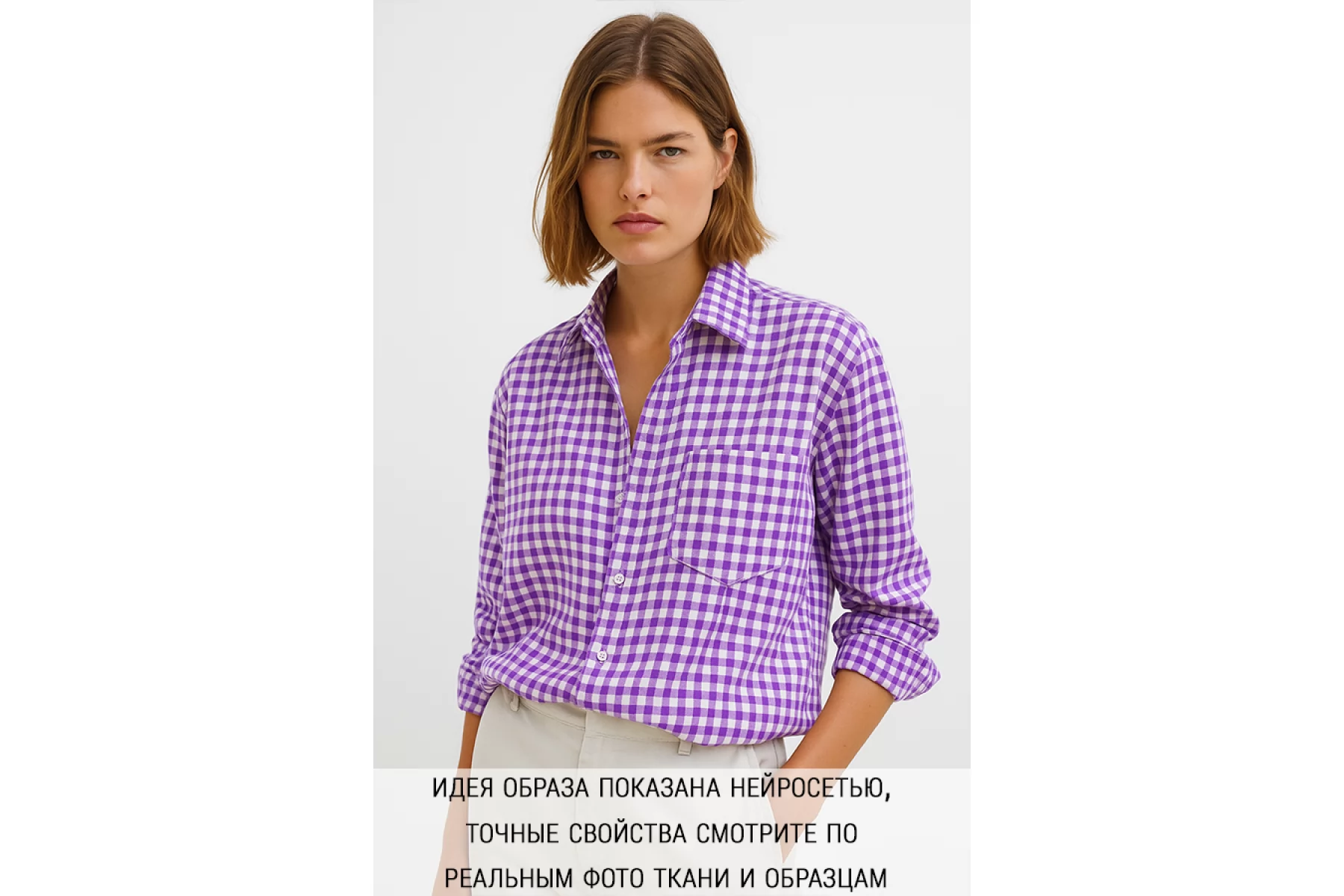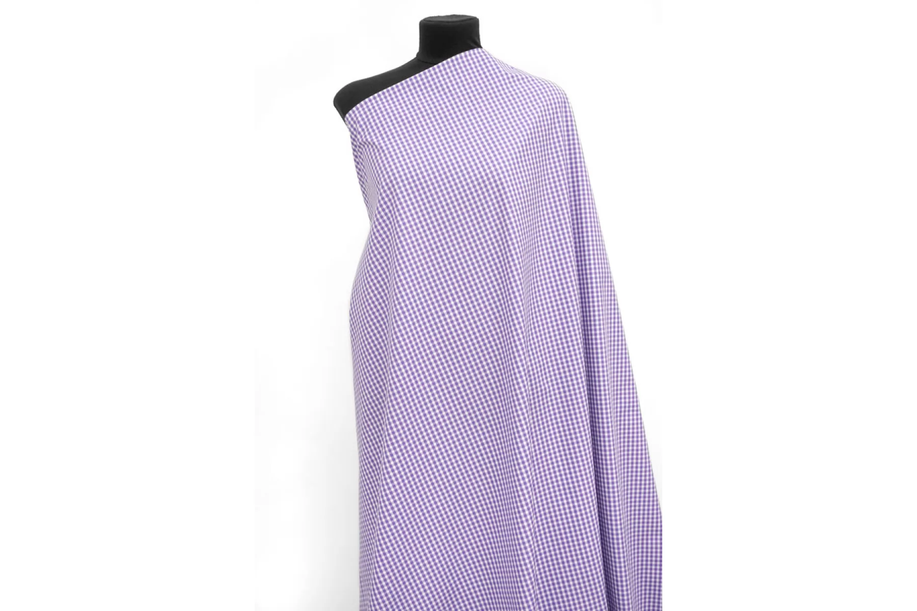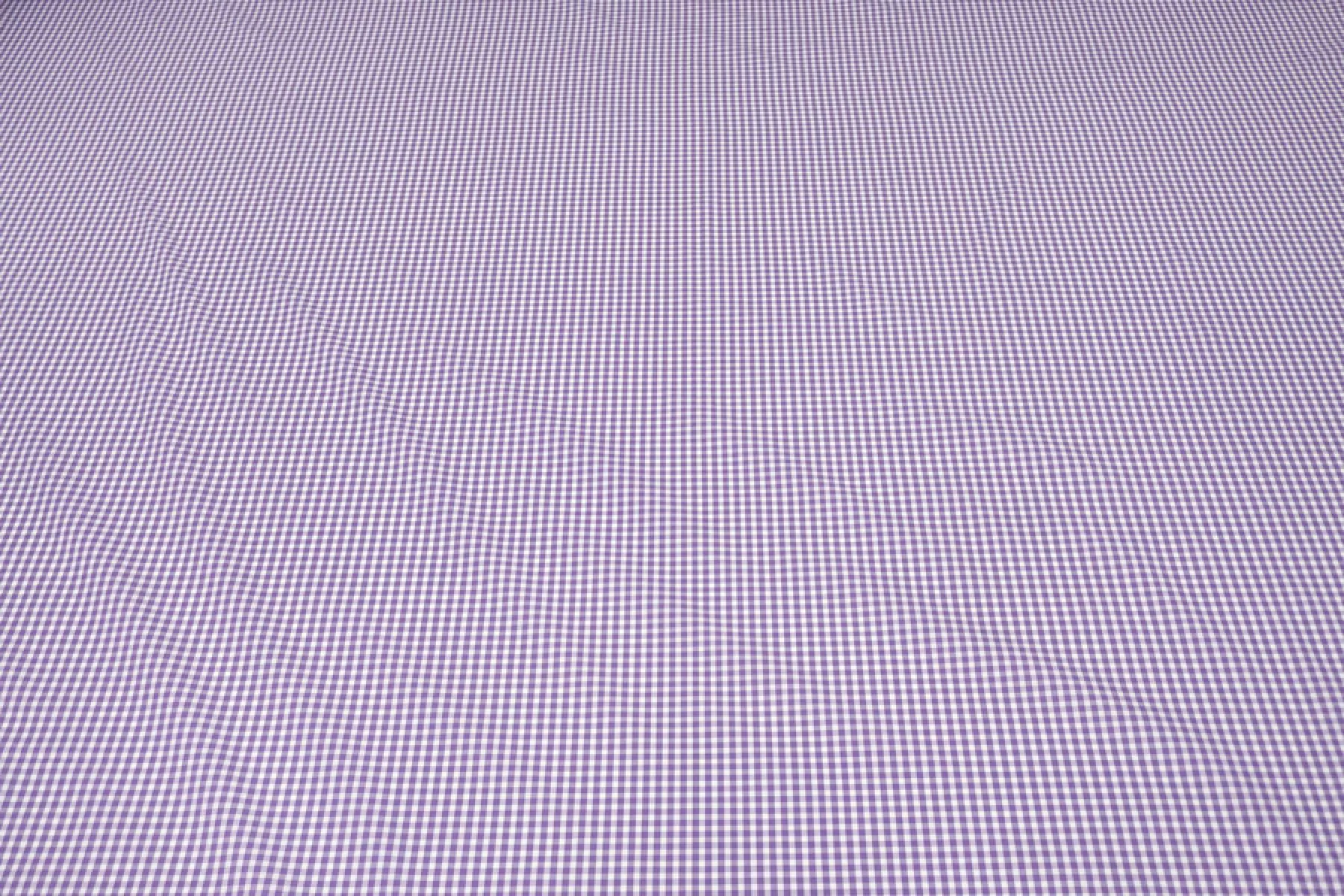 Отличный рубашечный хлопок в мелкую клетку. Полотняное переплетение белых и сиреневых нитей. Приятный тактильно. Хорошо драпируется и неплохо держит форму. Практически не просвечивает. Мнется. Не тянется, но совсем слегка и упруго пружинит за счет плетения. Шьем рубашки, платья, сарафаны и не только.