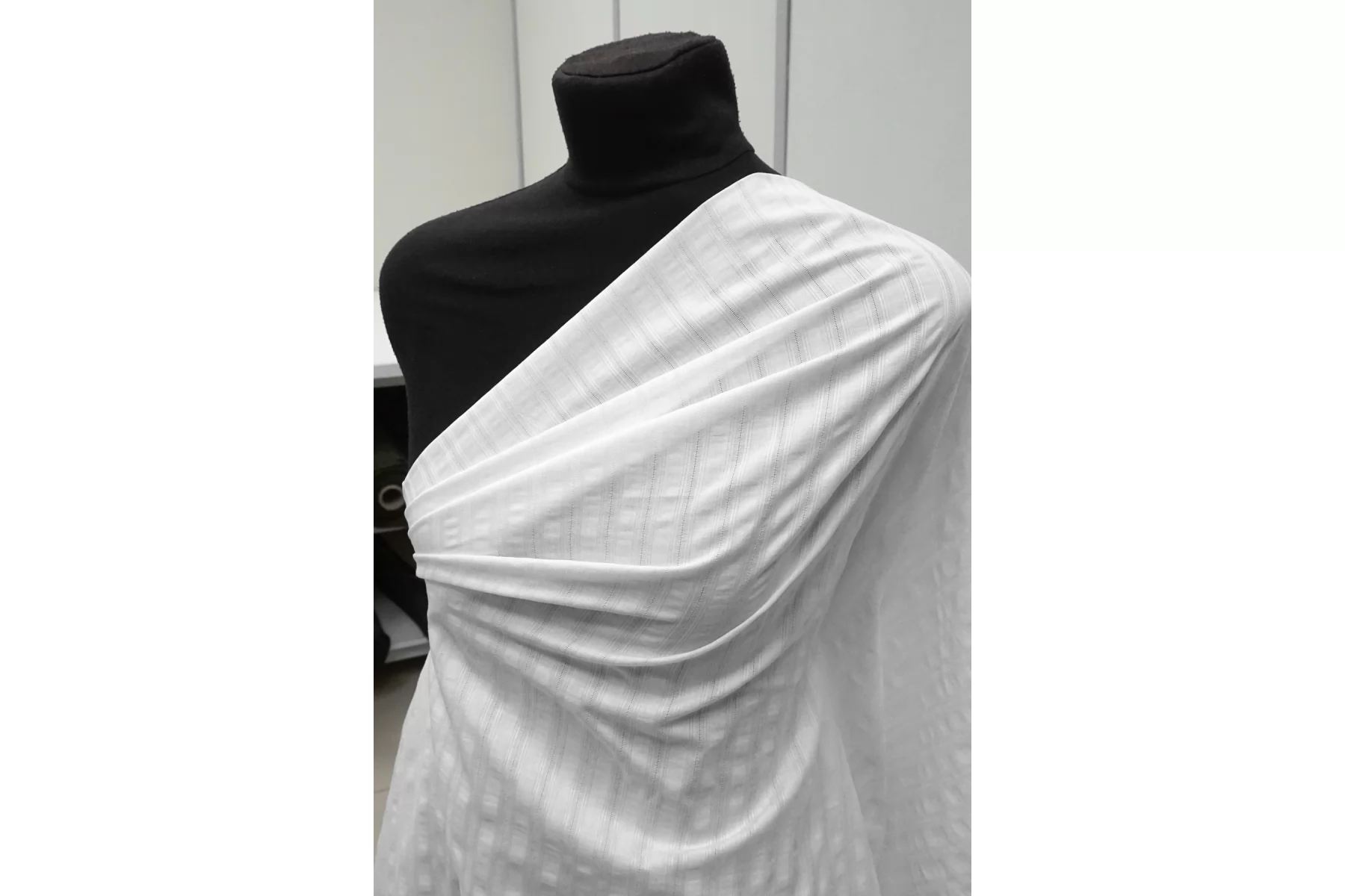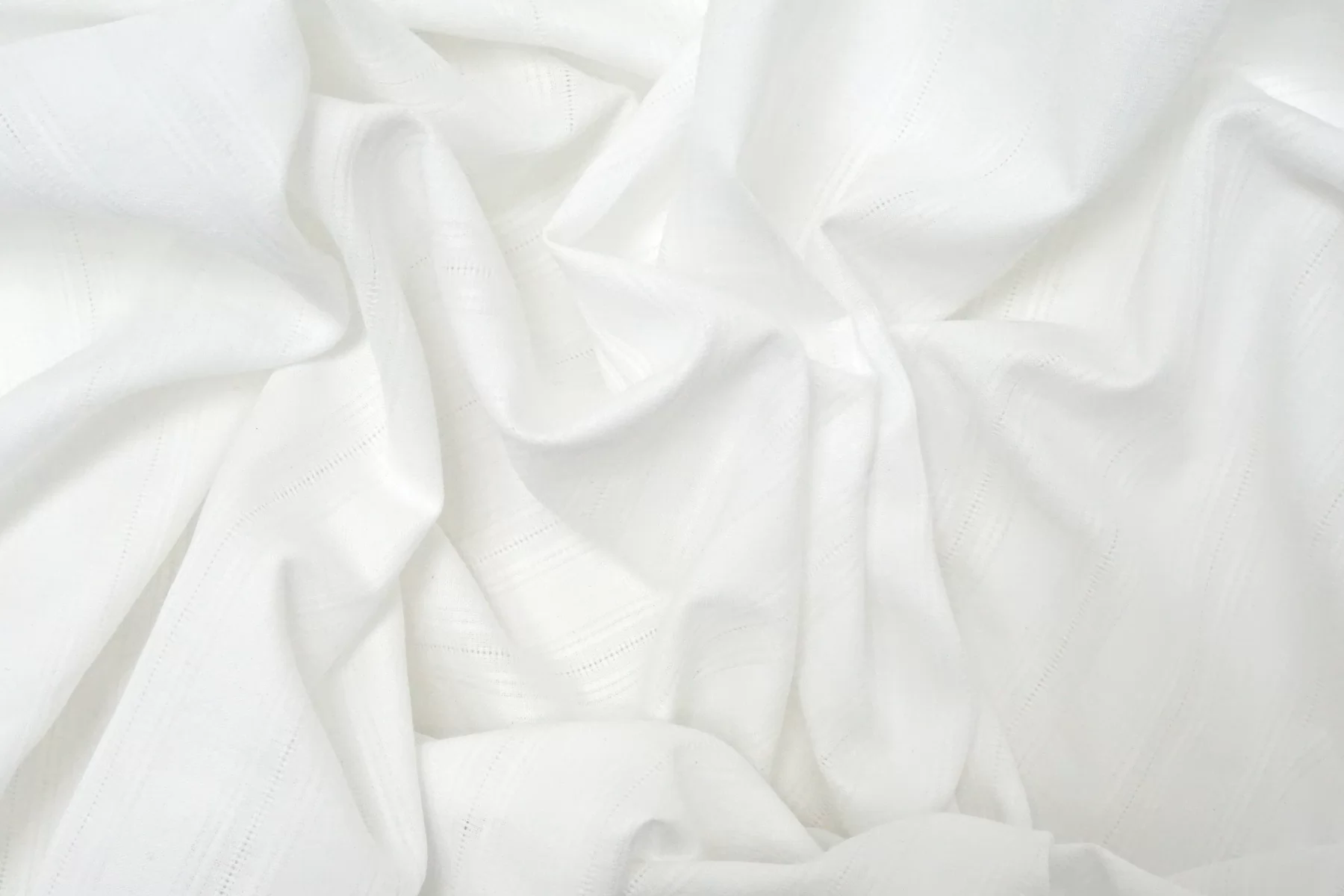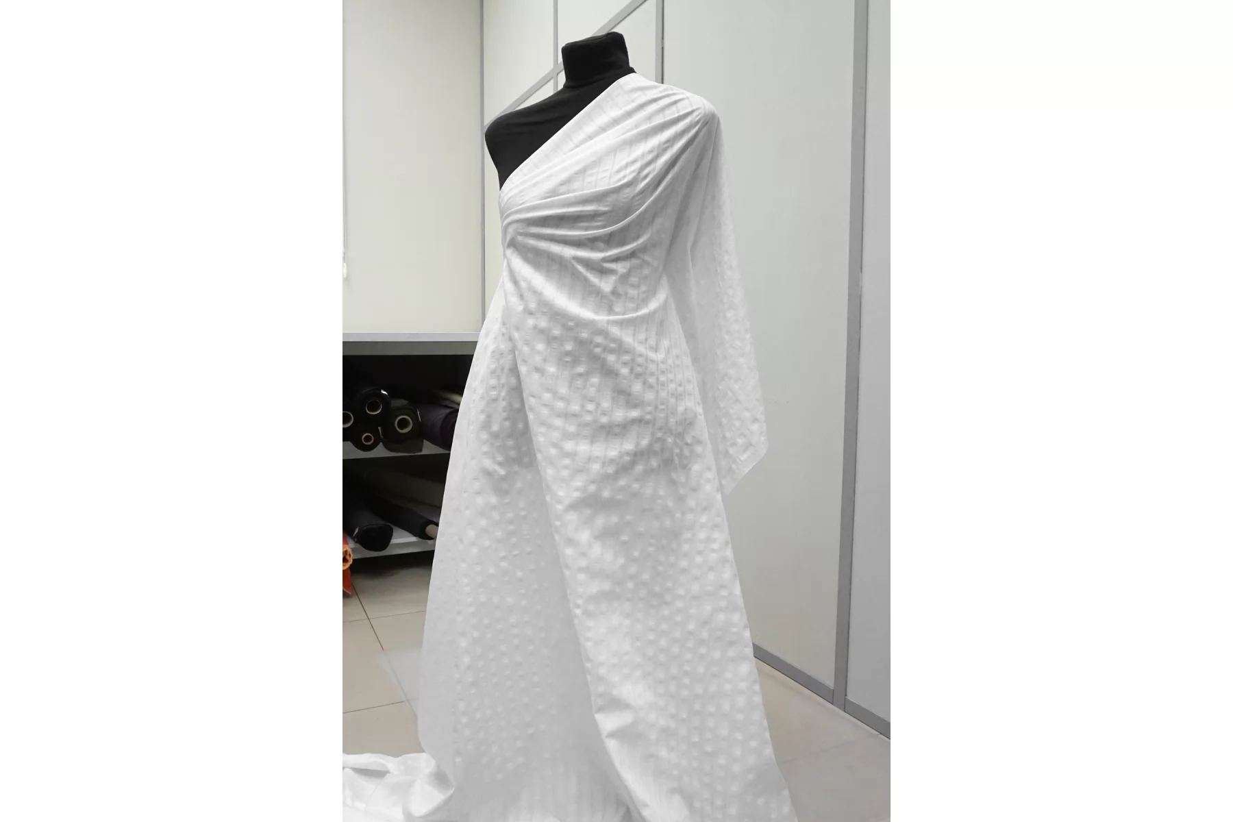 Рубашечный хлопок с мережкой в белом цвете с лёгким молочным подтоном. Приятный и мягкий наощупь, тонкий. Материал средний по пластичности, держит форму. Просвечивает, не тянется. Сминается не сильно. Идеальный вариант для рубашки, сарафана. Учитывайте усадку материала на 7-10%.