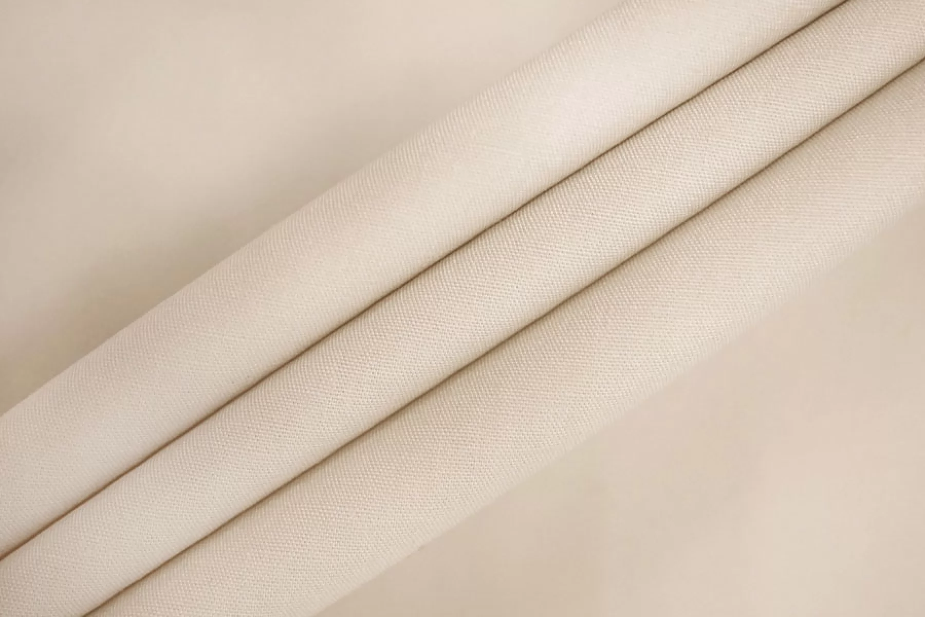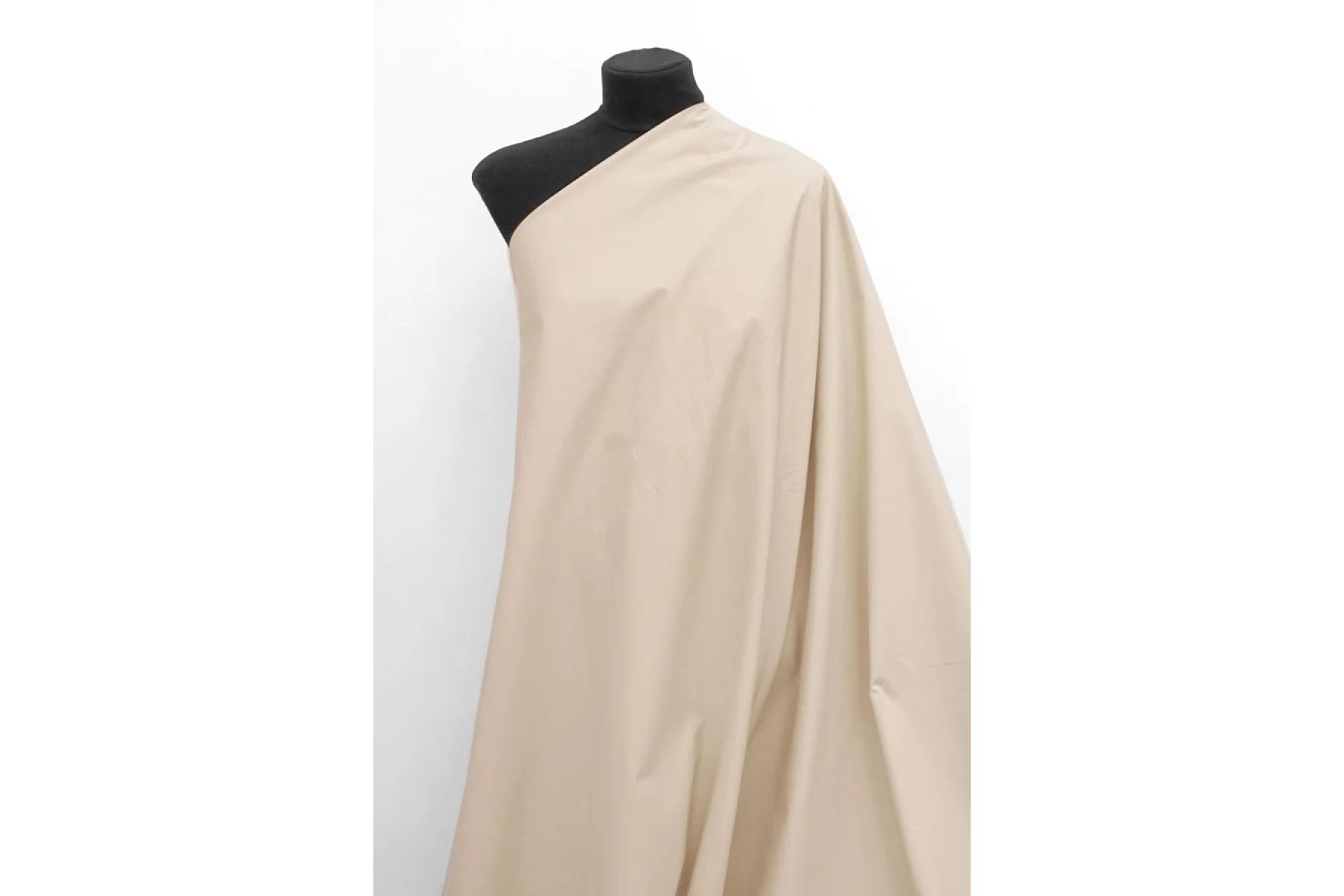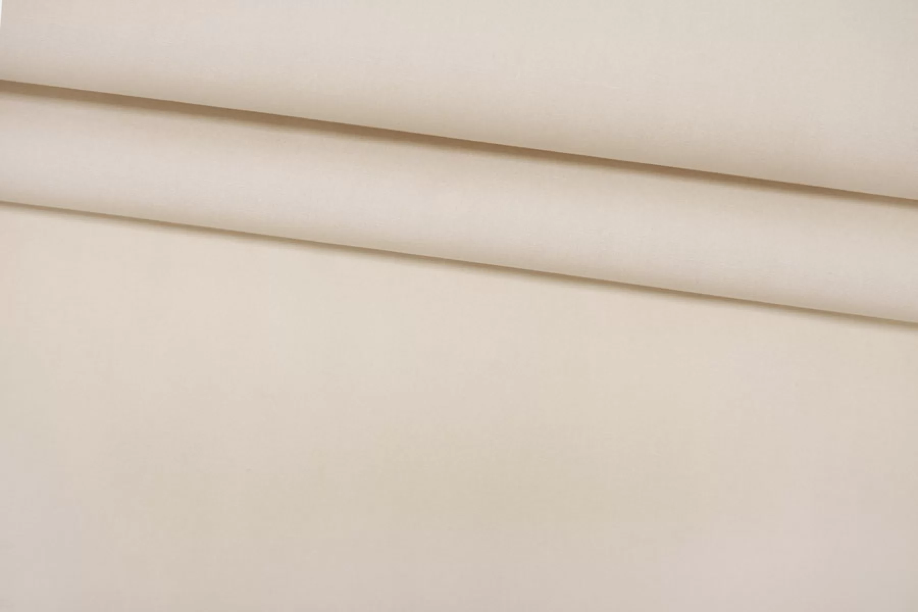 Рубашечный хлопок светло-бежевого оттенка полотняного плетения. Тактильно очень приятный и гладкий. Плотный. Не тянется. Немного просвечивает силуэт. Хорошо держит форму. Шьем рубашки, платья, юбки и не только. Учитывайте возможную усадку.