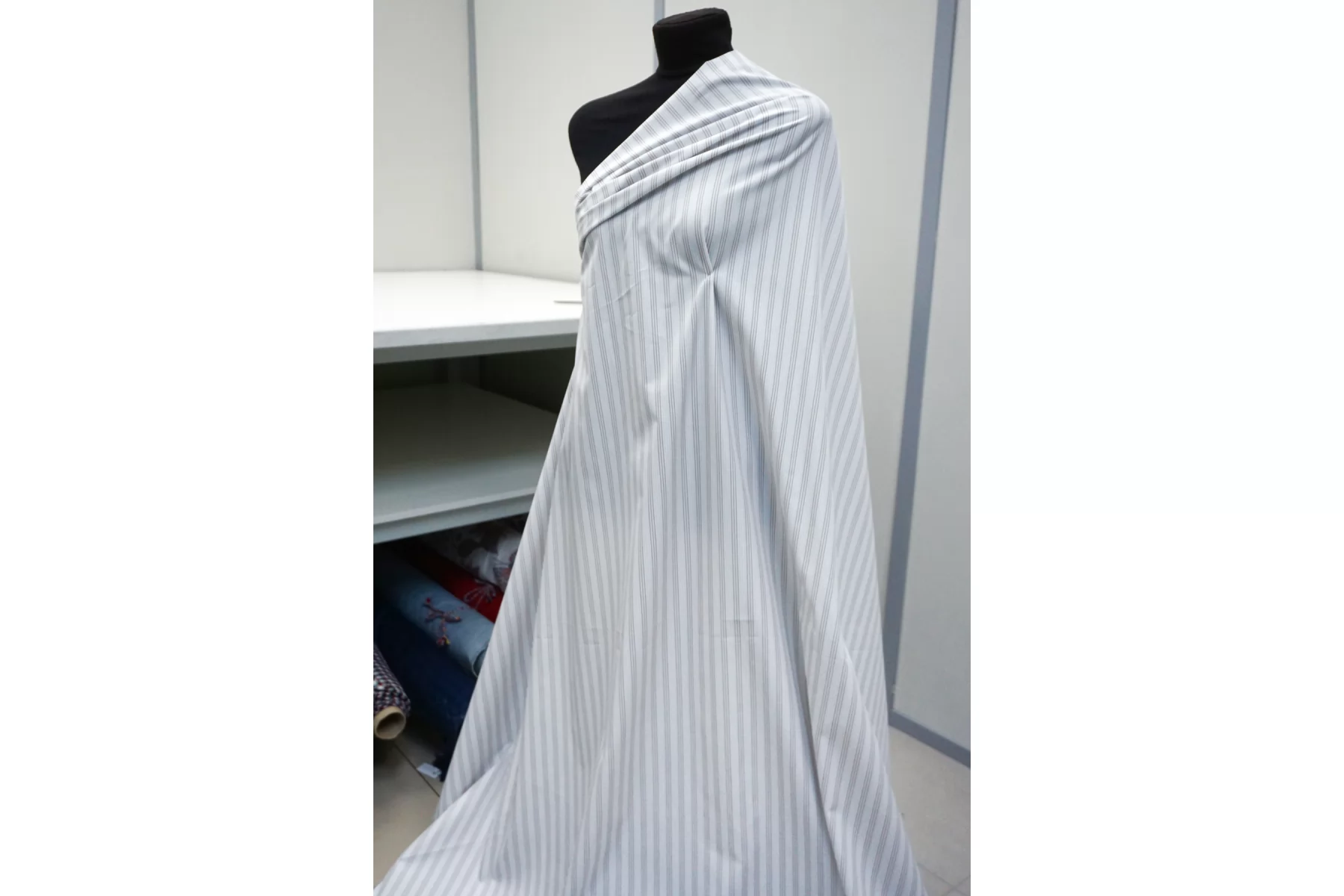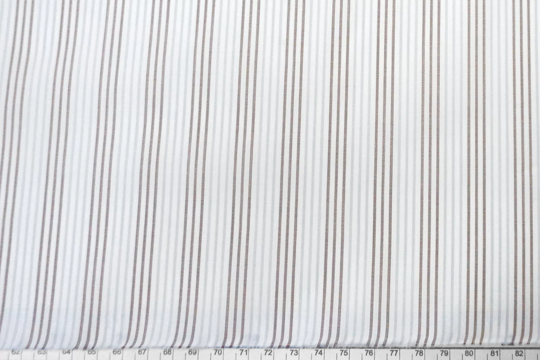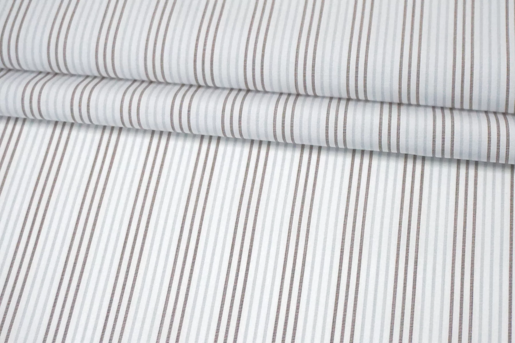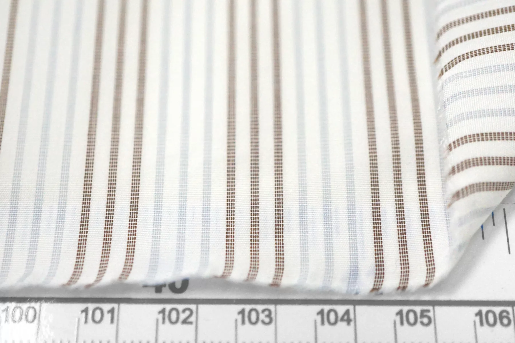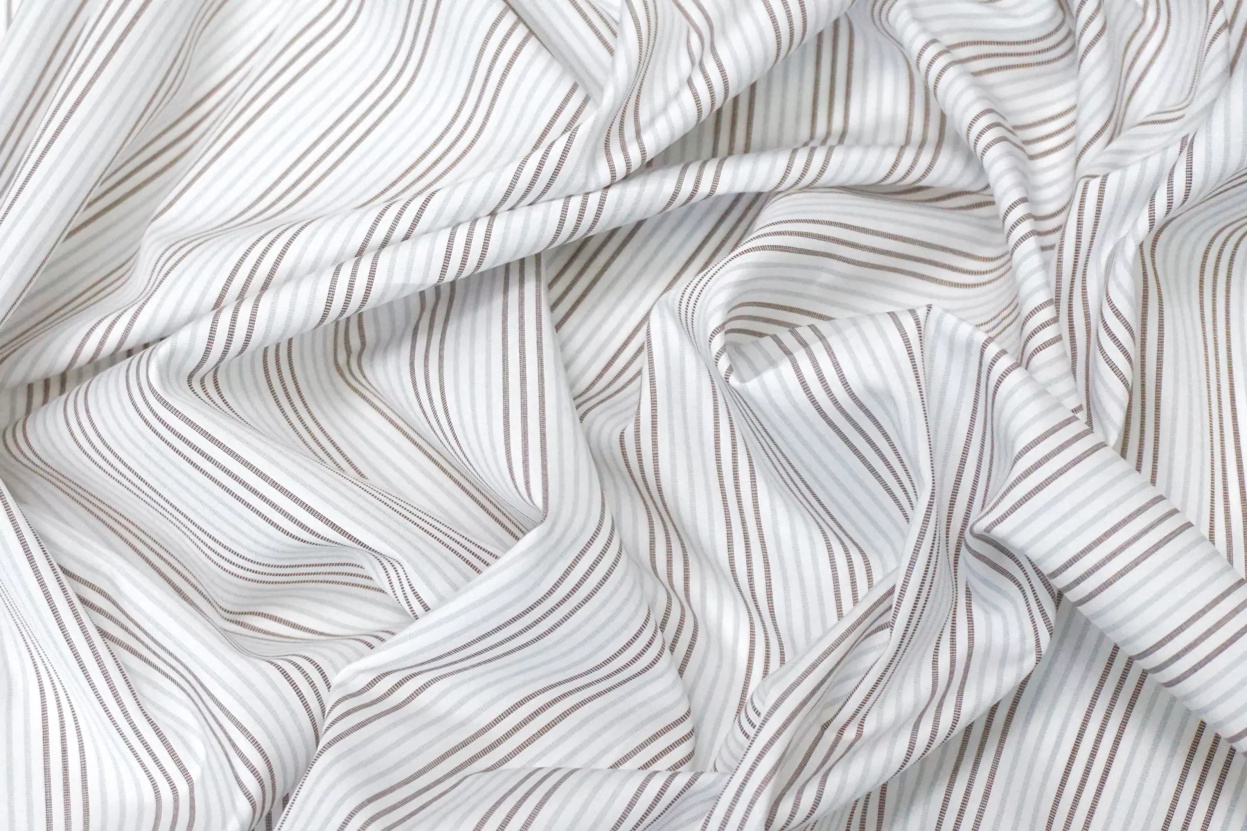 Итальянский хлопок от ALBINI рубашечной плотности, белого цвета в голубую и коричневую полоску (проходит параллельно кромке). Материал гладкий, мягкий, тонкий. Мнется. Слегка просвечивает силуэт в один слой, не тянется. Пластичный и немного держит форму. Прекрасный вариант на рубашки, юбки, платья. Материал дает усадку.
