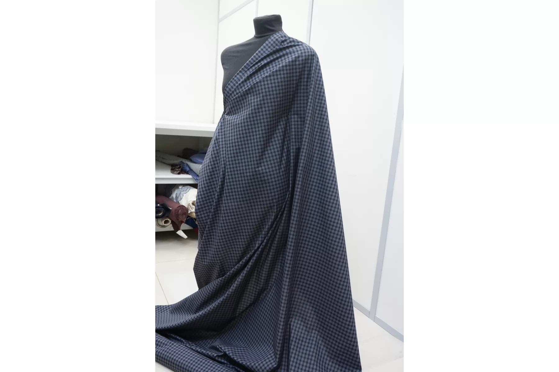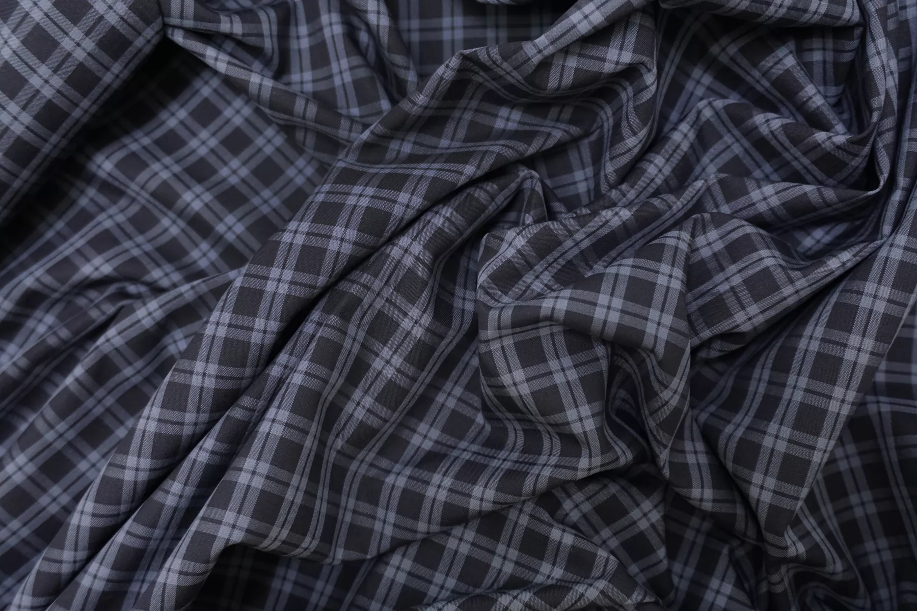 Итальянский хлопок от ALBINI рубашечной плотности, с узором-клеткой из нитей чёрно-серого и серого цвета (есть лёгкий синеватый подтон). Материал гладкий, мягкий, тонкий. Мнется. Просвечивает в один слой, не тянется. Пластичный, форму практически не держит. Прекрасный вариант на рубашки, юбки, платья. Материал дает усадку.