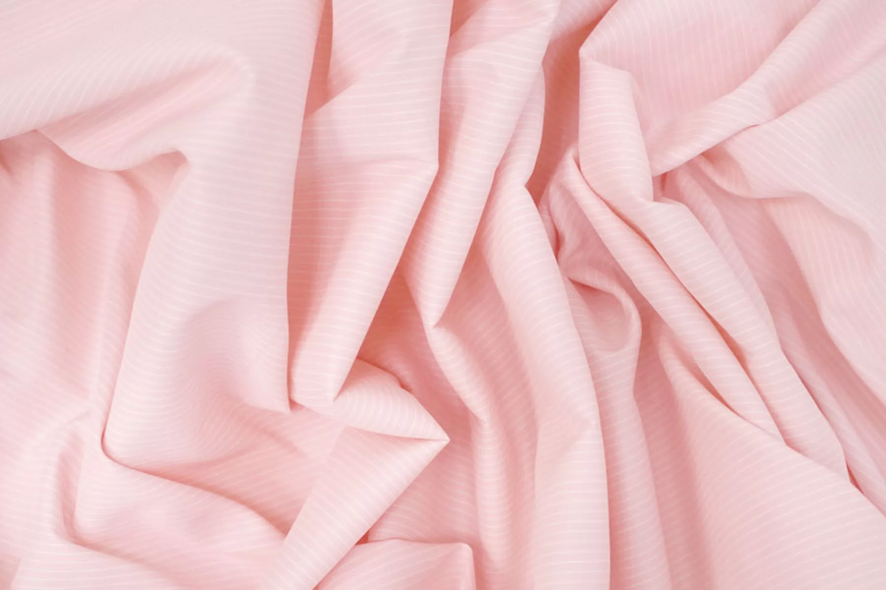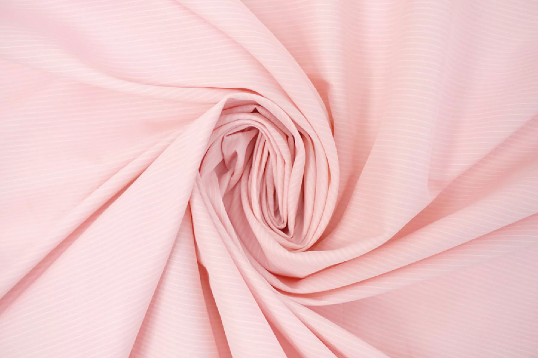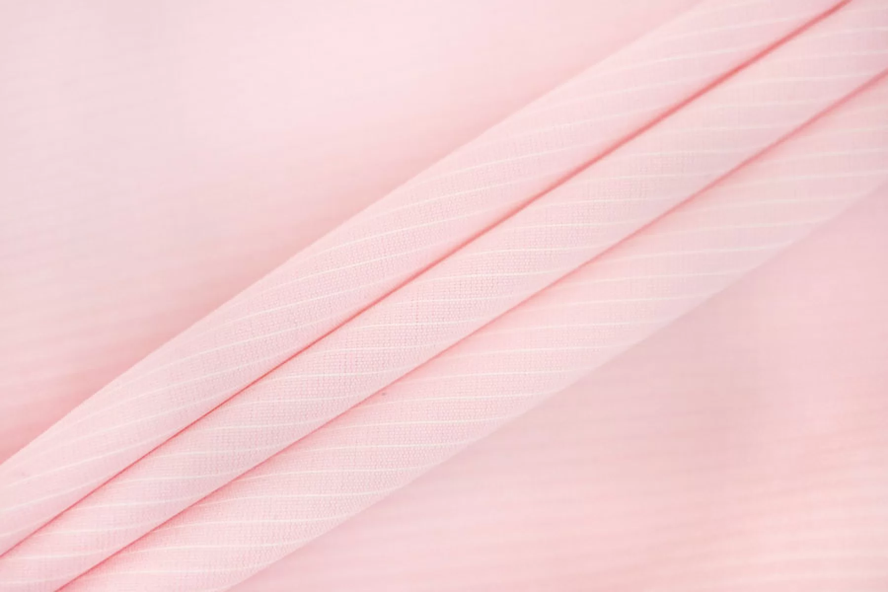 Прекрасный мерсеризованный рубашечный хлопок в узкую полоску, нити белого и розового цвета. Тактильно очень приятный и мягкий, гладкий. Мнется. Не тянется. Немного просвечивает. Хорошо драпируется и немного держит форму. Прекрасный вариант на рубашки, платья, юбки и не только.