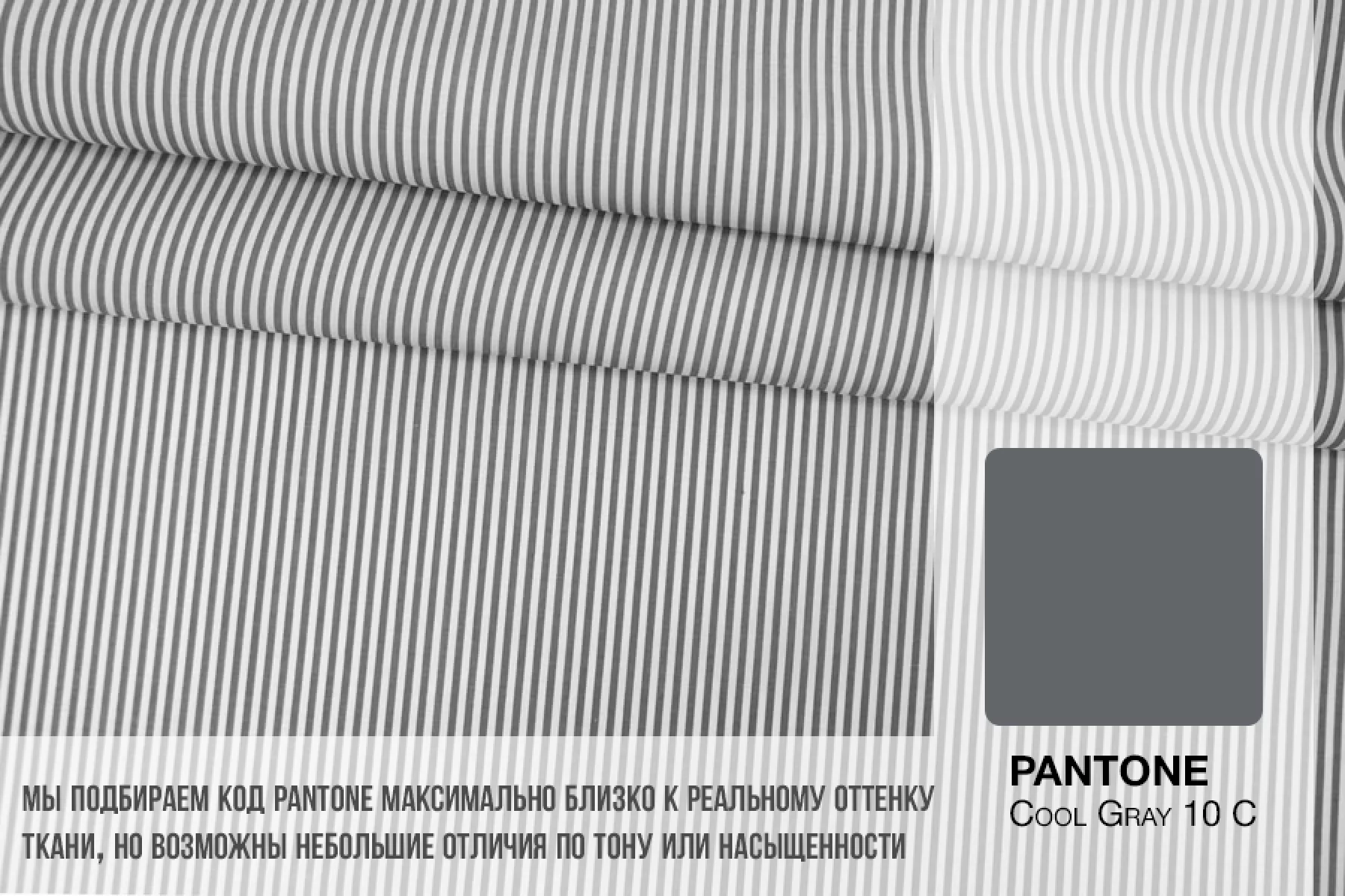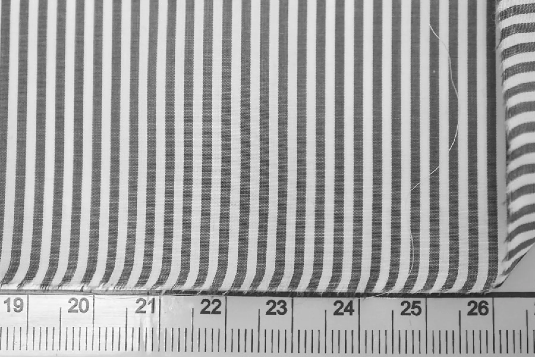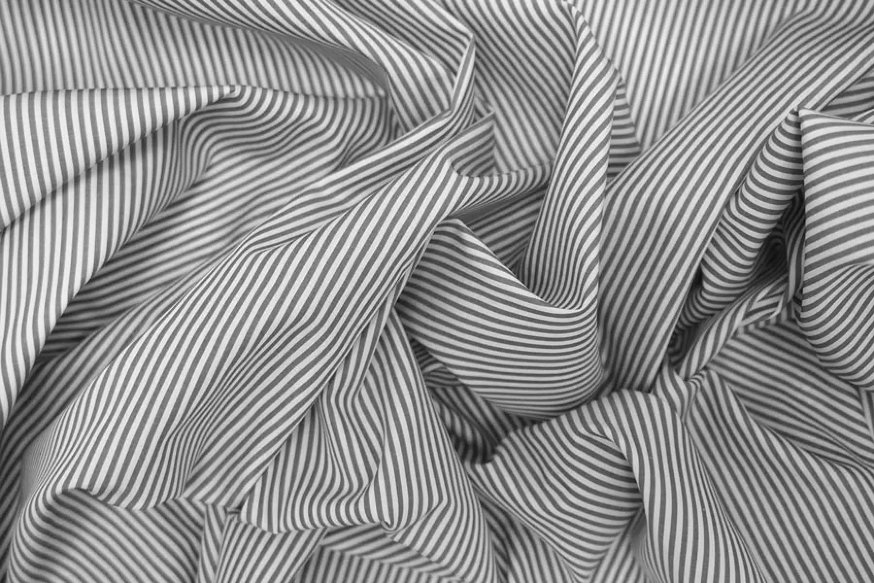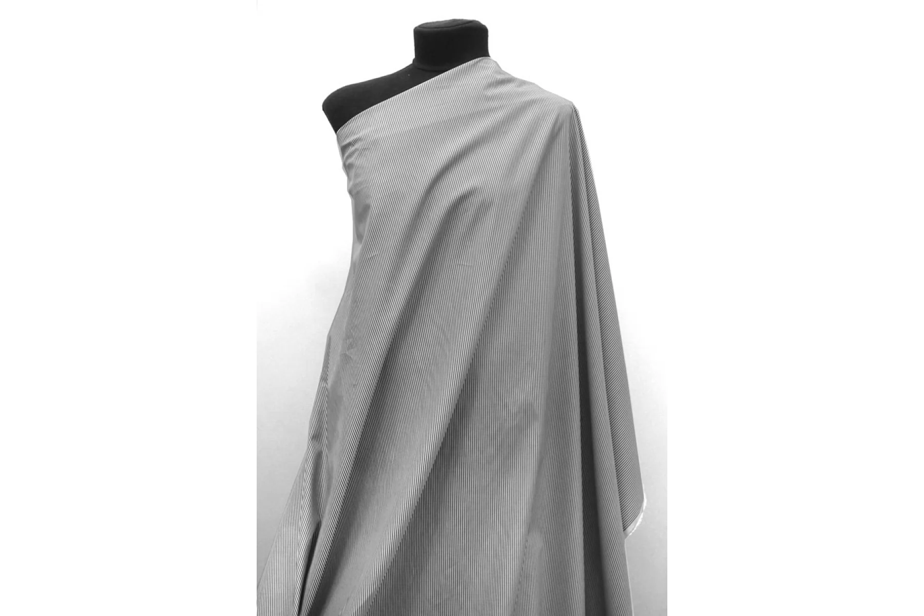 Хлопковый мерсеризованный рубашечный хлопок в полоску, нити белого и серого цвета. Полоска расположена вдоль кромки. Слегка шуршит и похрустывает. Тактильно очень приятный и мягкий, гладкий. Мнется. Не тянется. Просвечивает минимально. Хорошо драпируется и немного держит форму. Прекрасный вариант на рубашки, платья, юбки и не только.