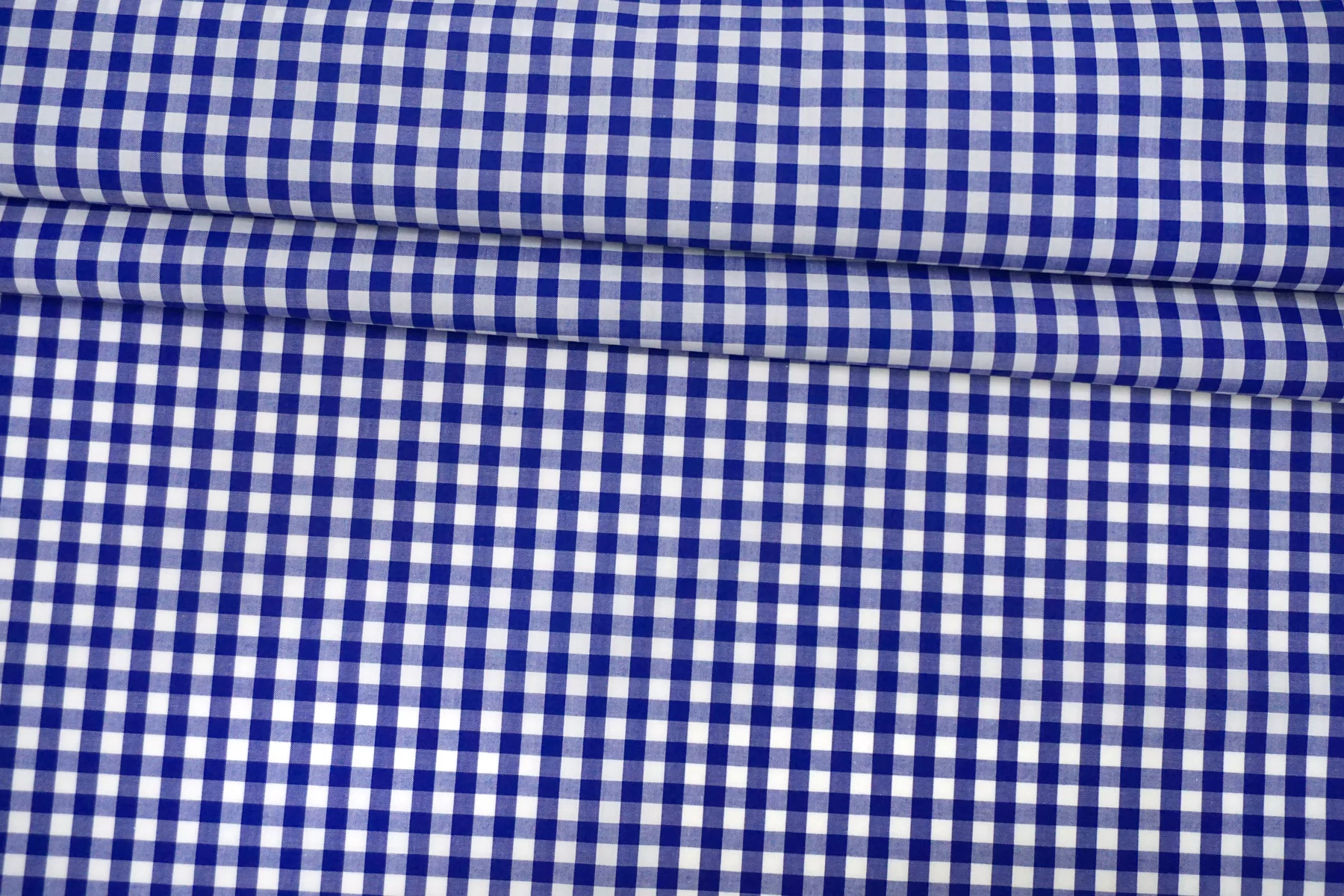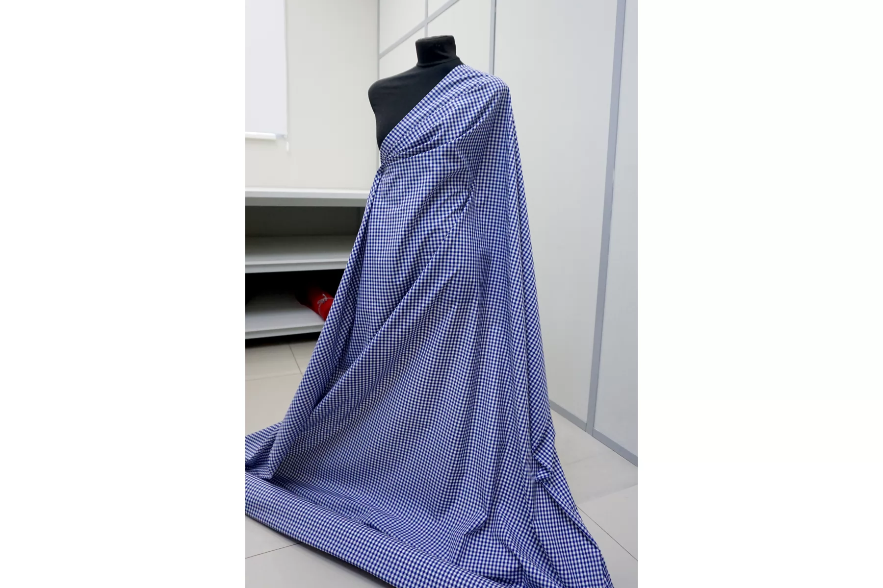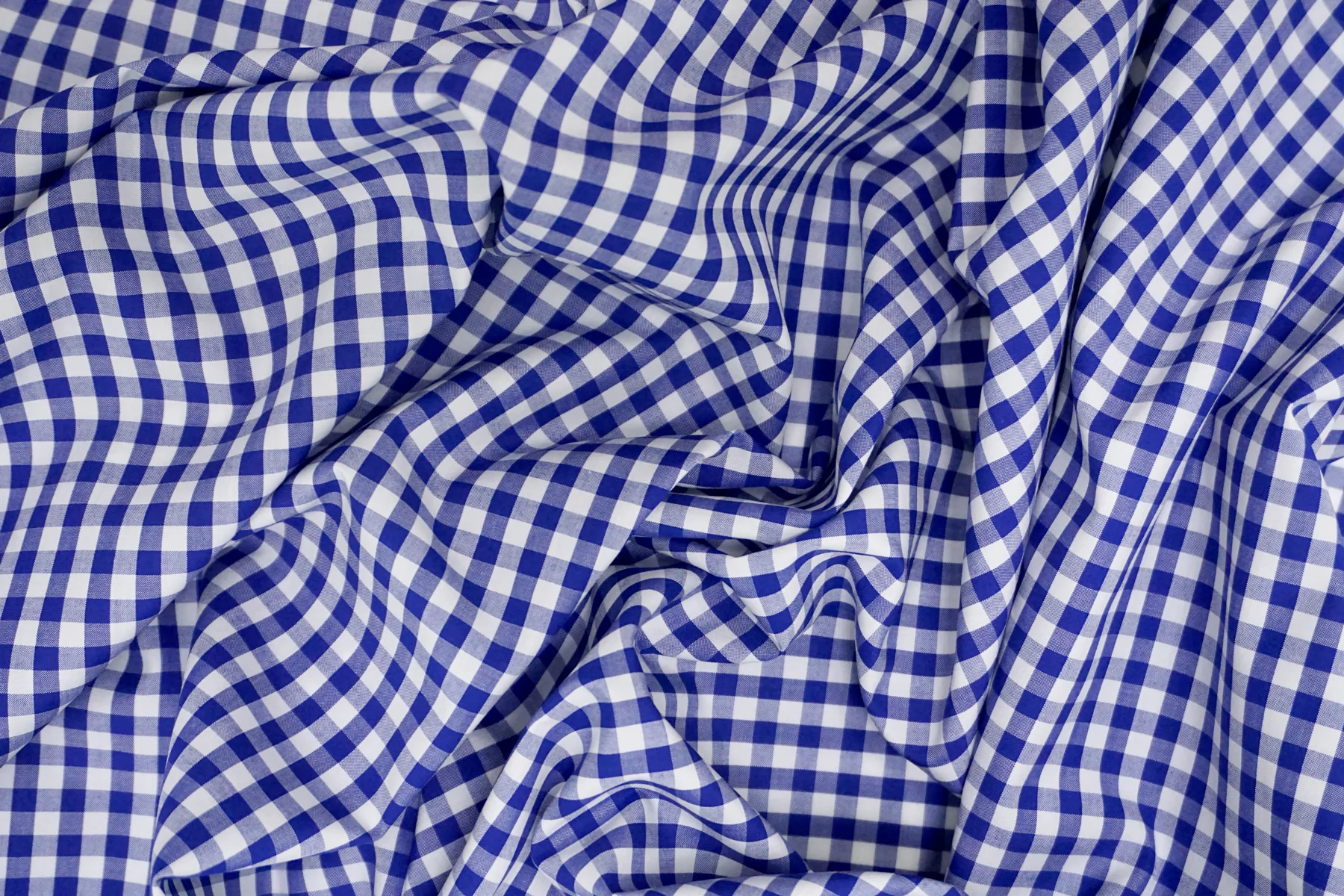 Итальянский хлопок рубашечной плотности, с узором-клеткой из нитей белого и синего цвета. Материал гладкий, мягкий, тонкий. Мнется. Минимально просвечивает в один слой, не тянется. Пластичный, форму практически не держит. Прекрасный вариант на рубашки, юбки, платья. Материал дает усадку.