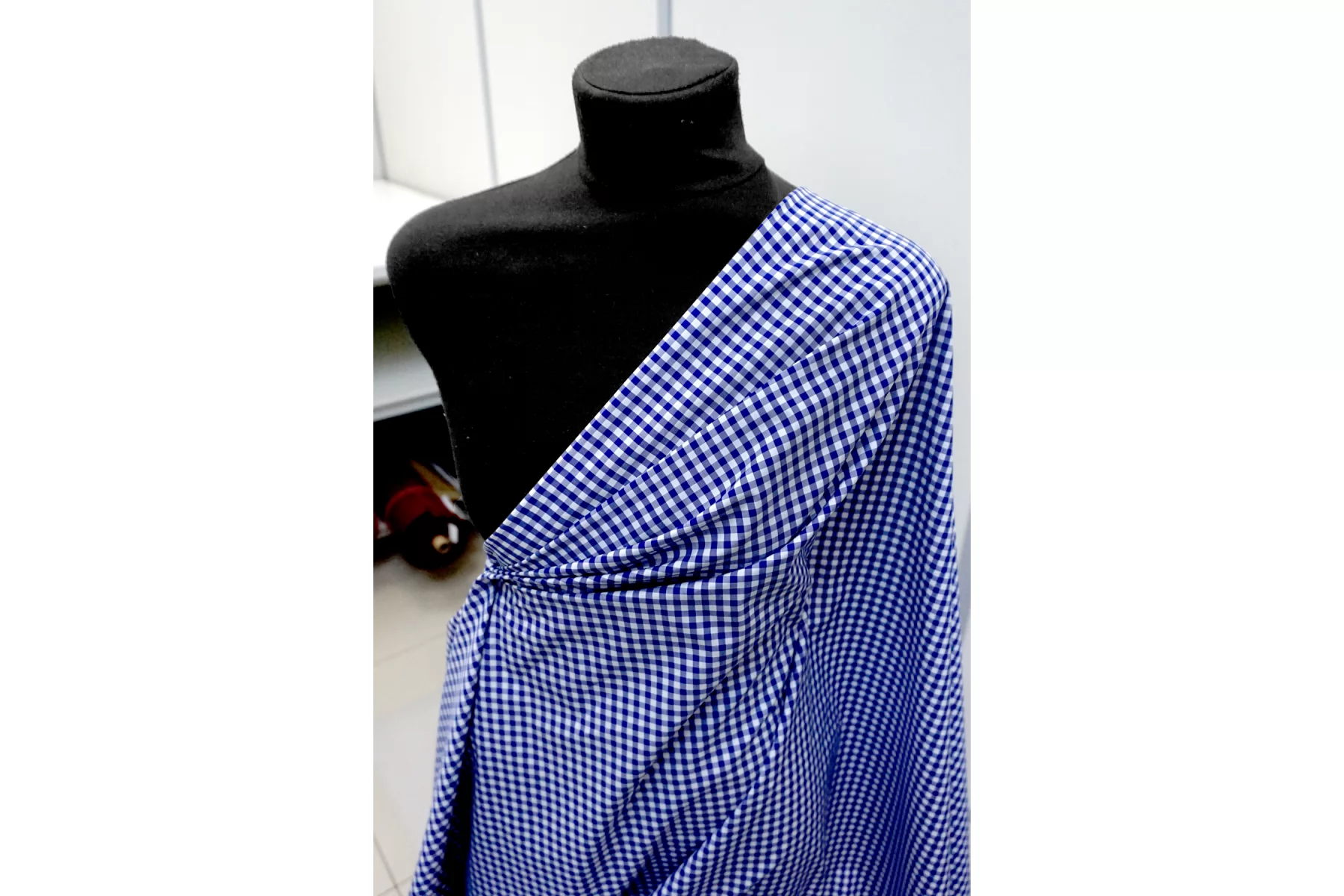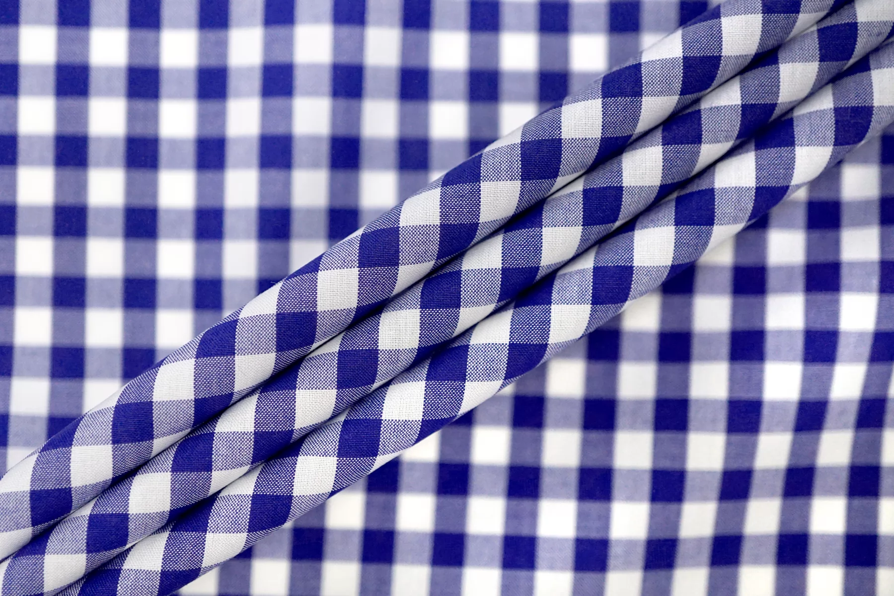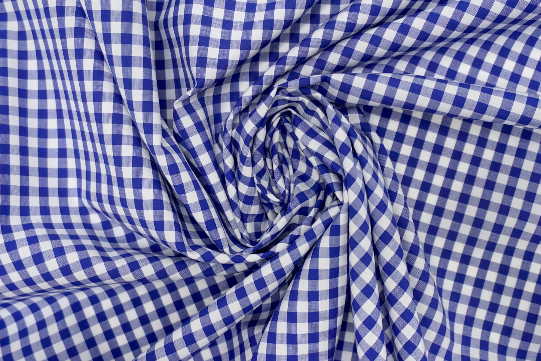 Итальянский хлопок рубашечной плотности, с узором-клеткой из нитей белого и синего цвета. Материал гладкий, мягкий, тонкий. Мнется. Минимально просвечивает в один слой, не тянется. Пластичный, форму практически не держит. Прекрасный вариант на рубашки, юбки, платья. Материал дает усадку.