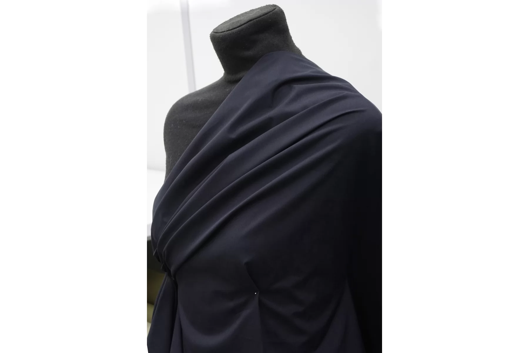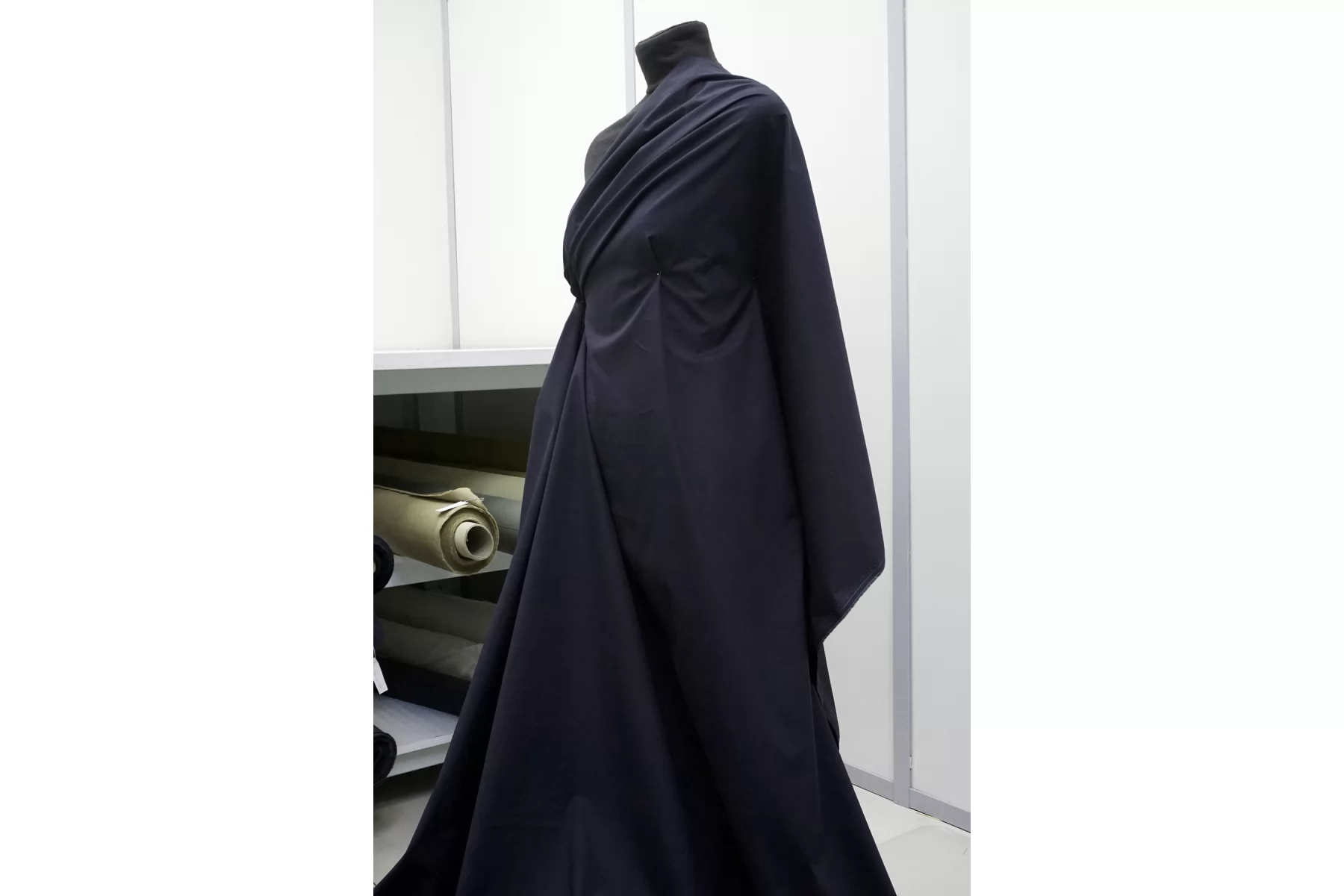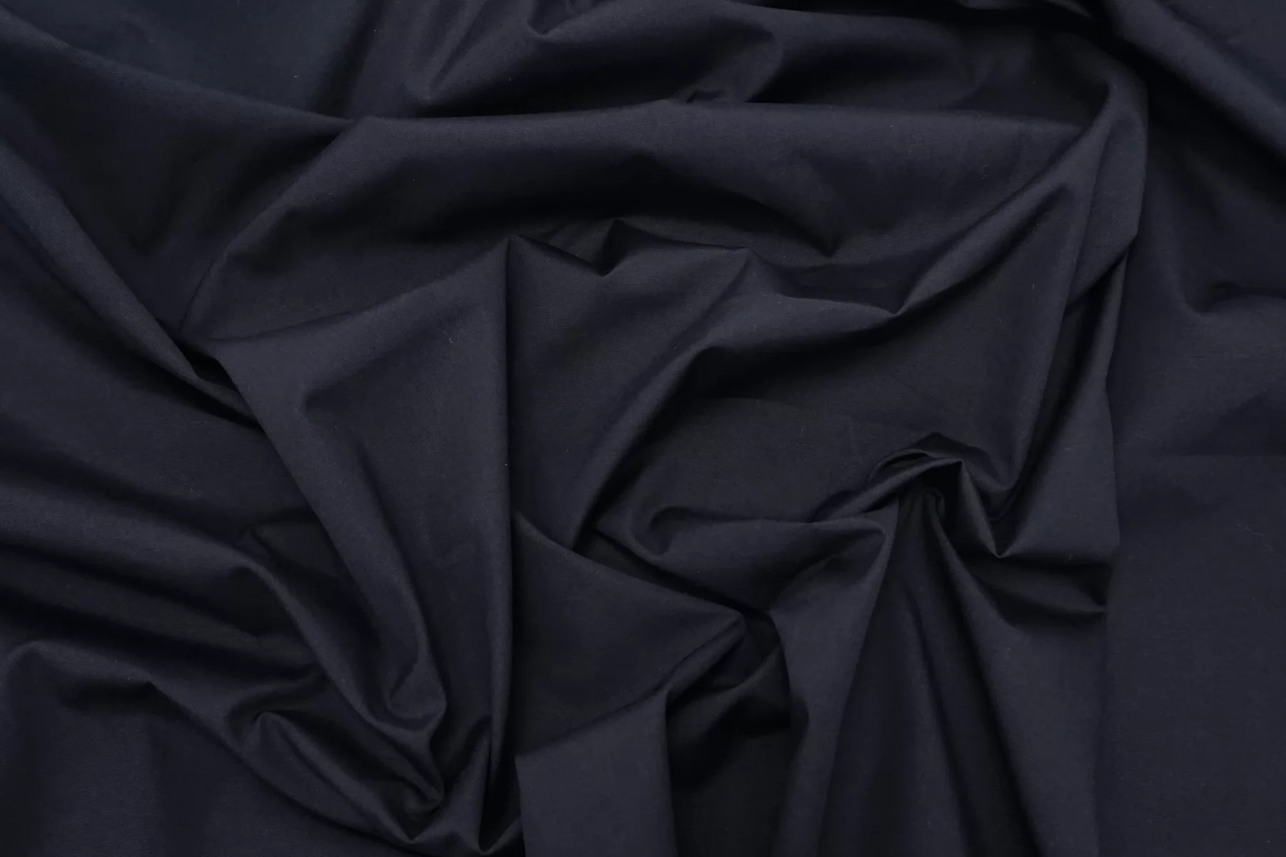 Итальянский рубашечный мерсеризованный хлопок тёмно-синего цвета. Материал гладкий, мягкий, тонкий, легкий. Слегка шуршащий. Немного мнется и не просвечивает. Немного тянется, очень пластичный но при этом умеренно держит форму. Прекрасный вариант на рубашки, юбки, платья. Материал дает усадку.