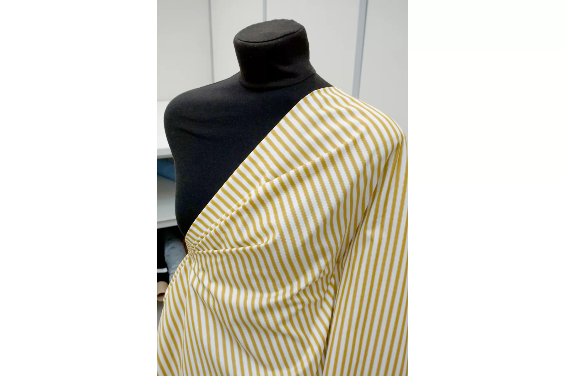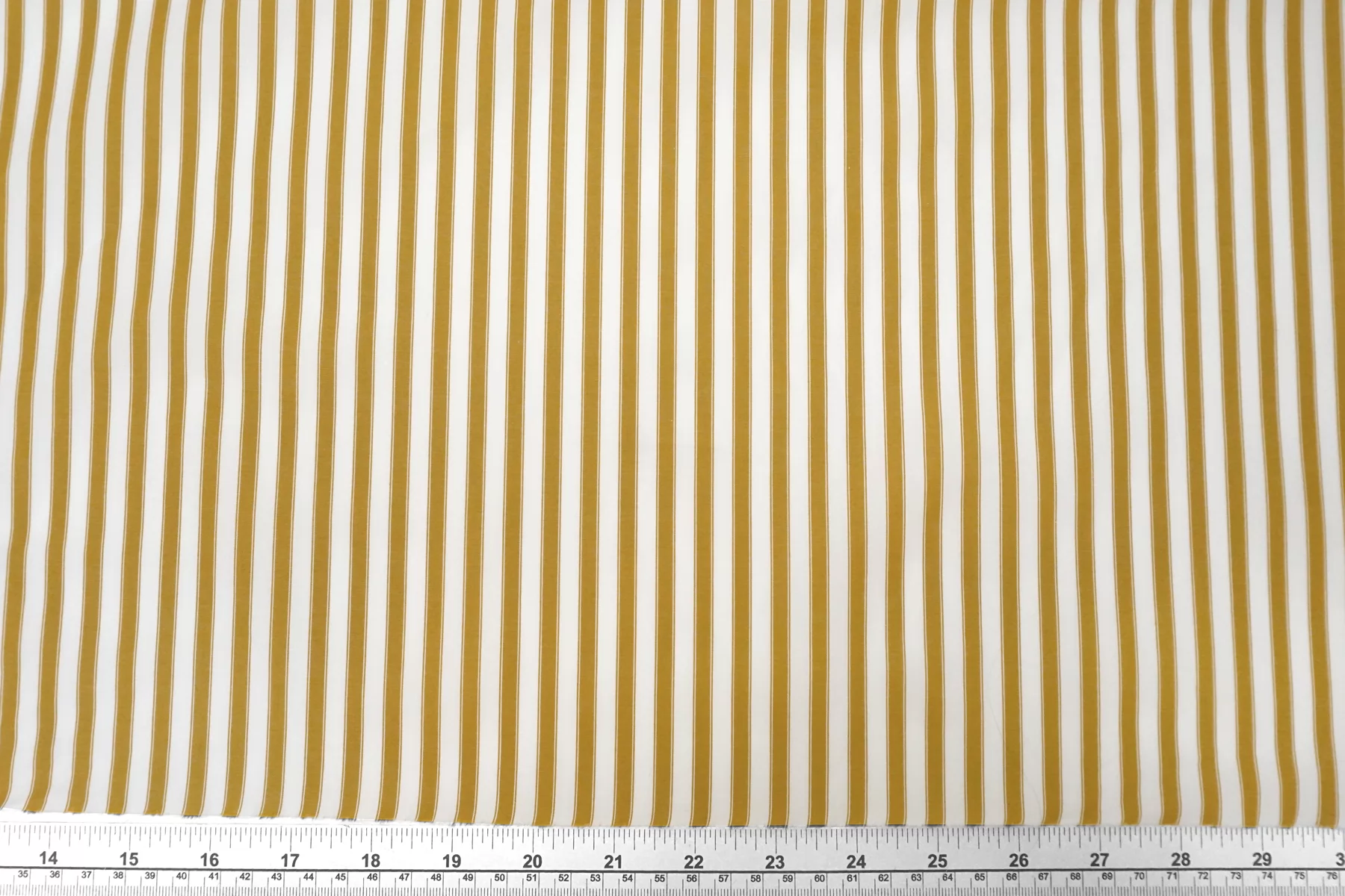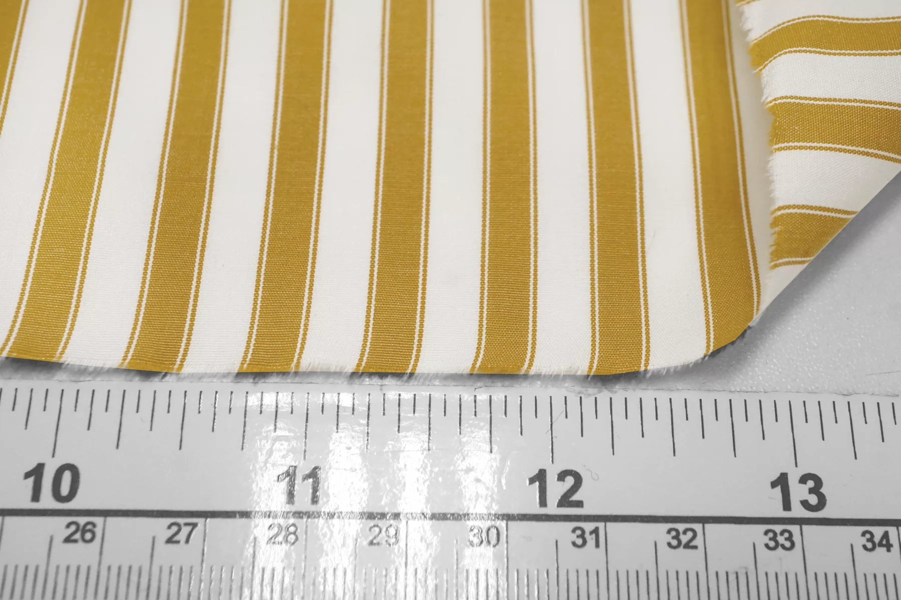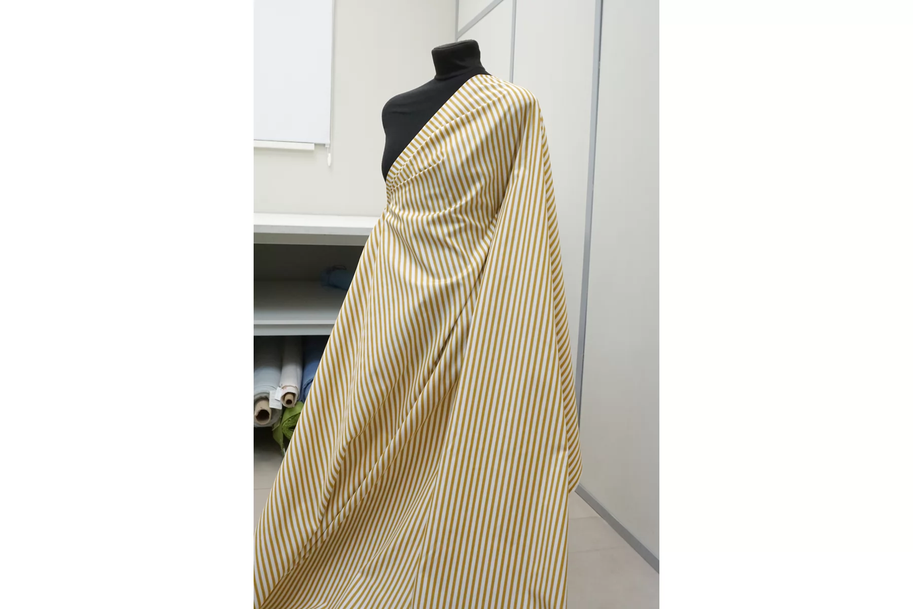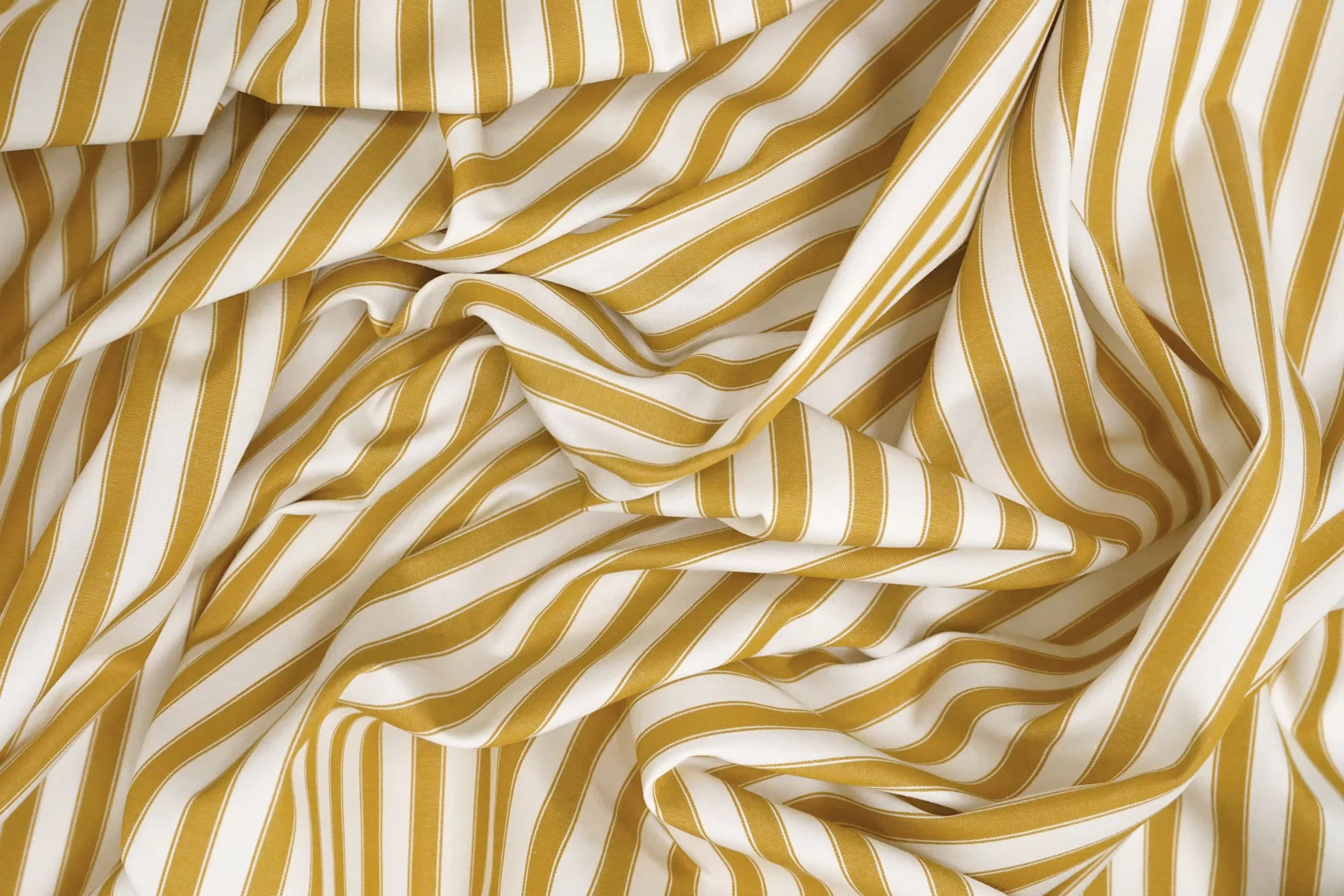 Мерсеризованный рубашечный хлопок в полоску, нити белого и горчичного цвета. Полоска расположена вдоль кромки. Тактильно очень приятный и мягкий, гладкий. Слегка шуршащий. Мнется. Не тянется. Немного просвечивает в один слой. Хорошо драпируется и немного держит форму. Прекрасный вариант на рубашки, платья, юбки и не только.