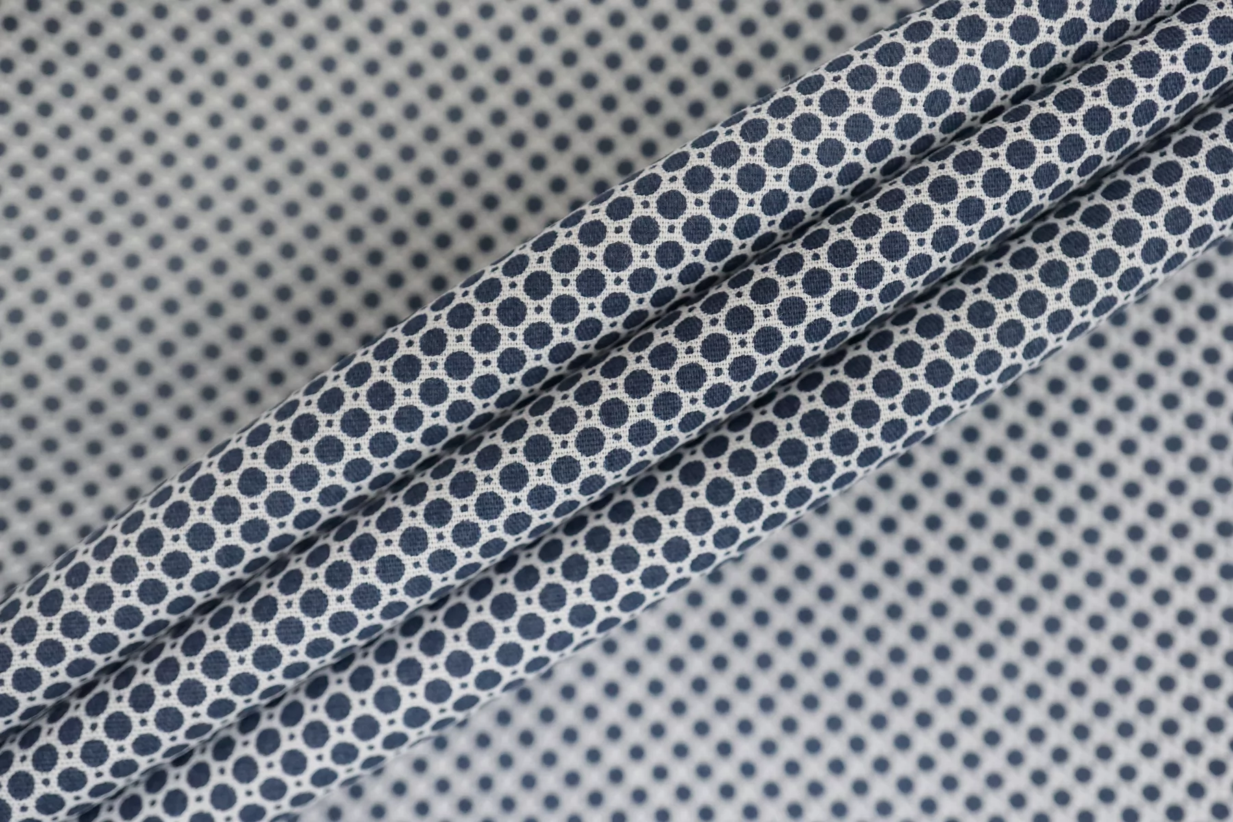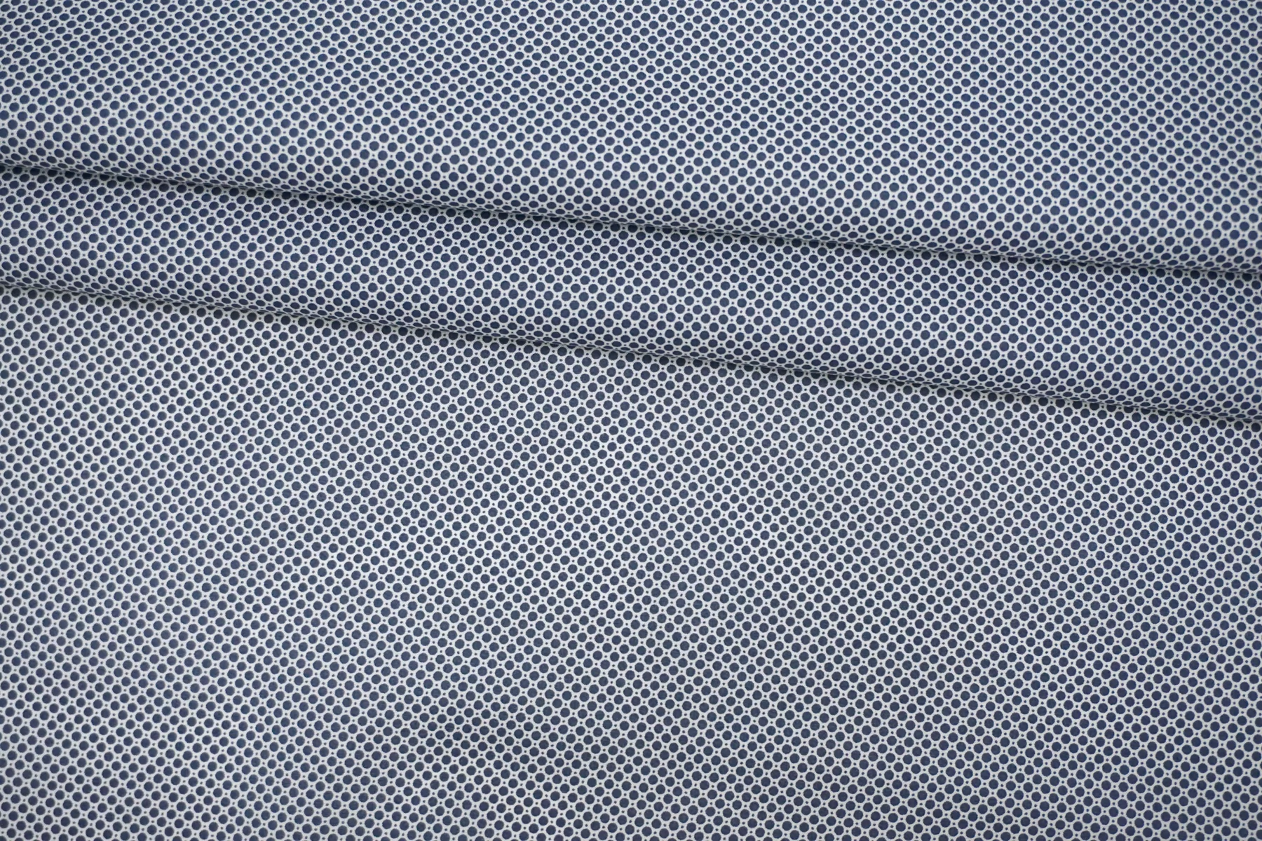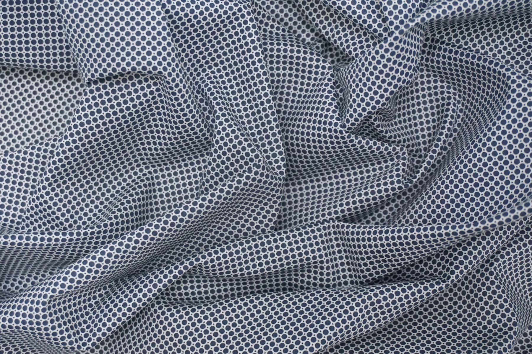 Итальянский рубашечный хлопок белого цвета, с мелким принтом - тёмно-синими кружочками. Материал гладкий, мягкий, тонкий, эластичный. Немного мнется. Немного просвечивает силуэт в один слой. Отлично драпируется и немного держит форму. Прекрасный вариант на рубашки, юбки, платья. Материал дает усадку.