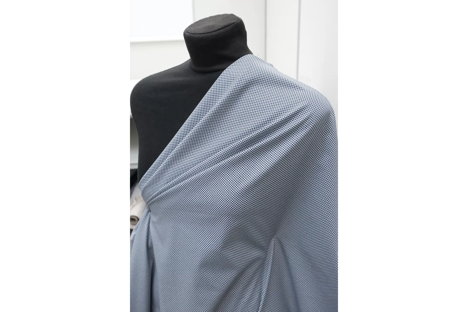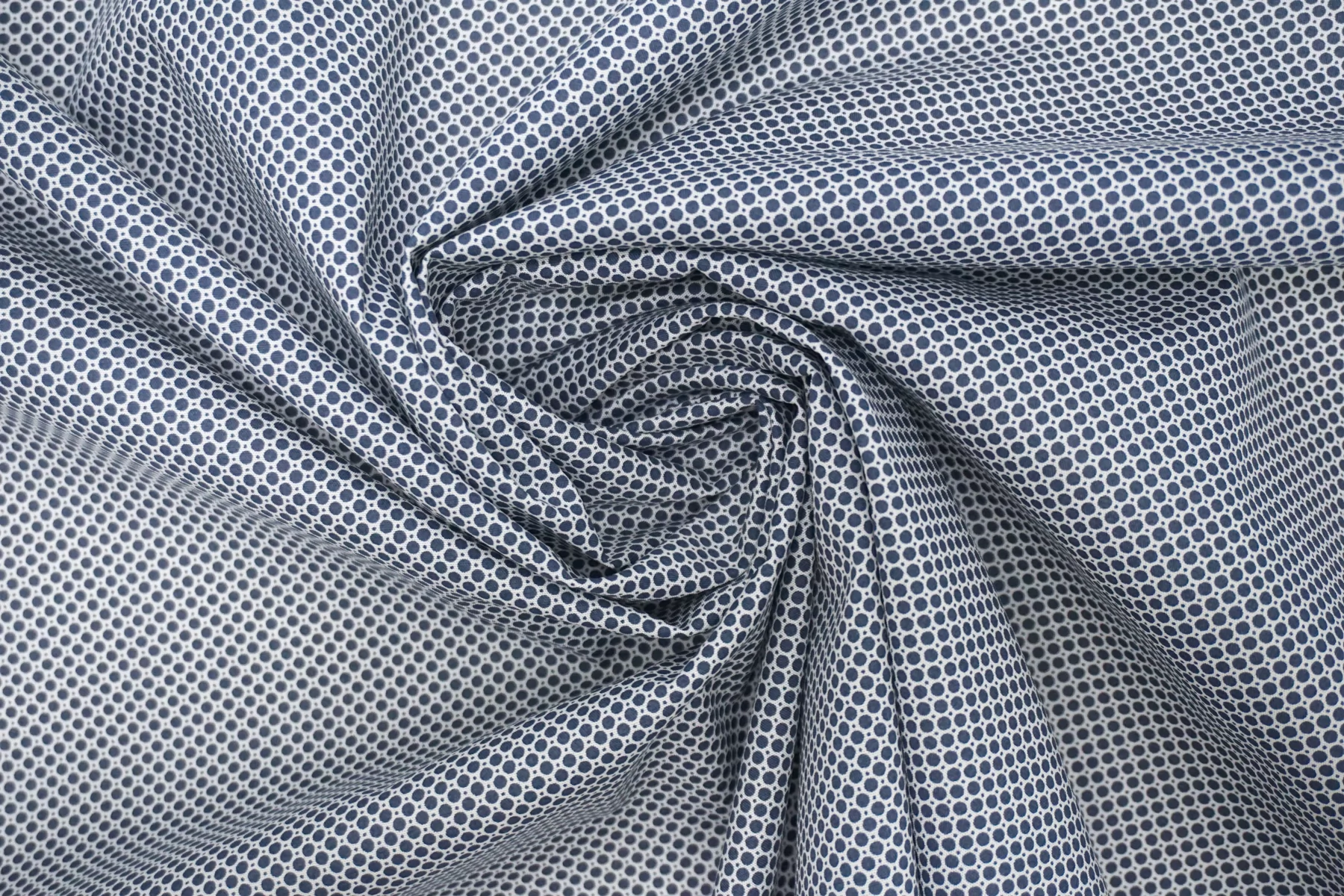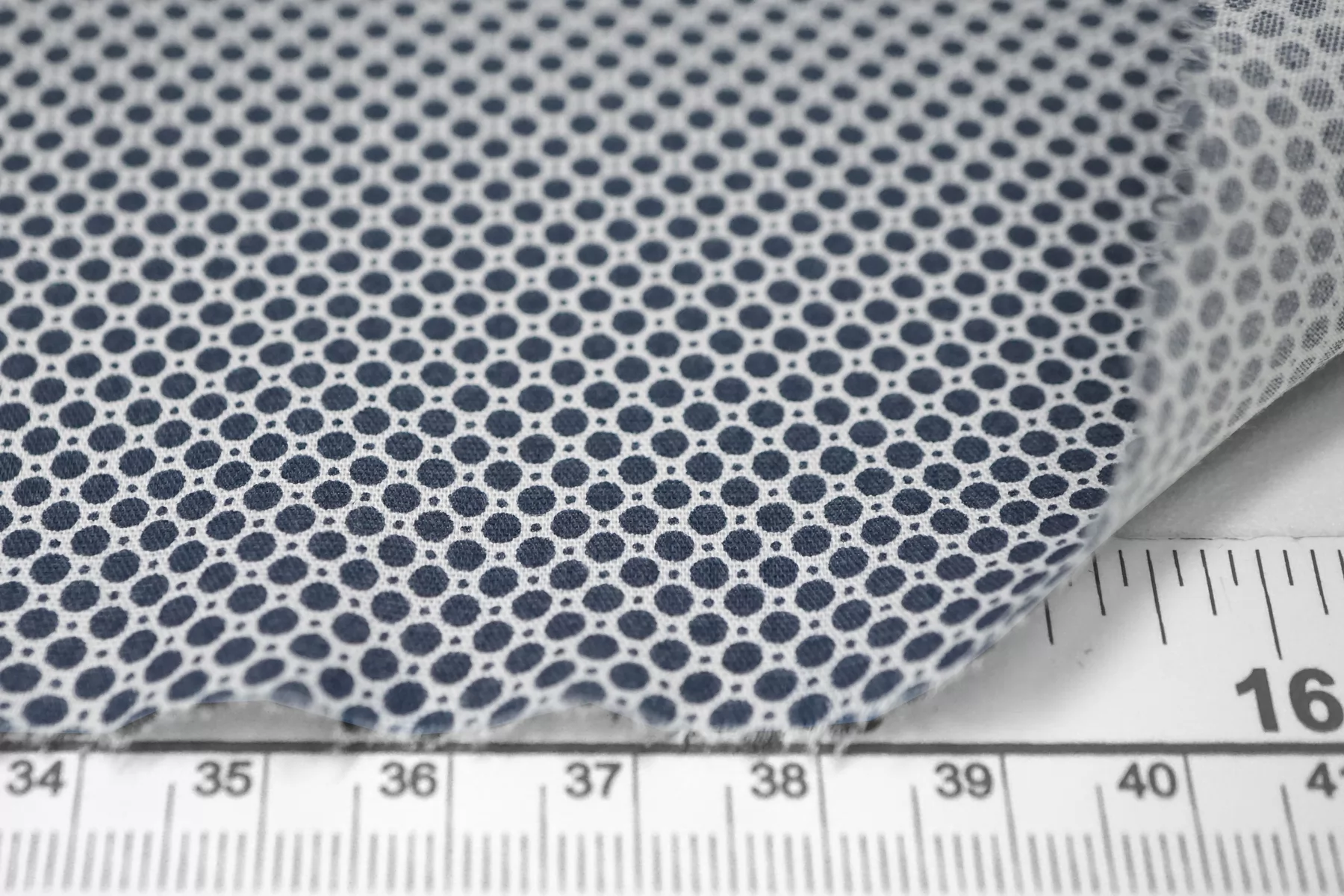 Итальянский рубашечный хлопок белого цвета, с мелким принтом - тёмно-синими кружочками. Материал гладкий, мягкий, тонкий, эластичный. Немного мнется. Немного просвечивает силуэт в один слой. Отлично драпируется и немного держит форму. Прекрасный вариант на рубашки, юбки, платья. Материал дает усадку.