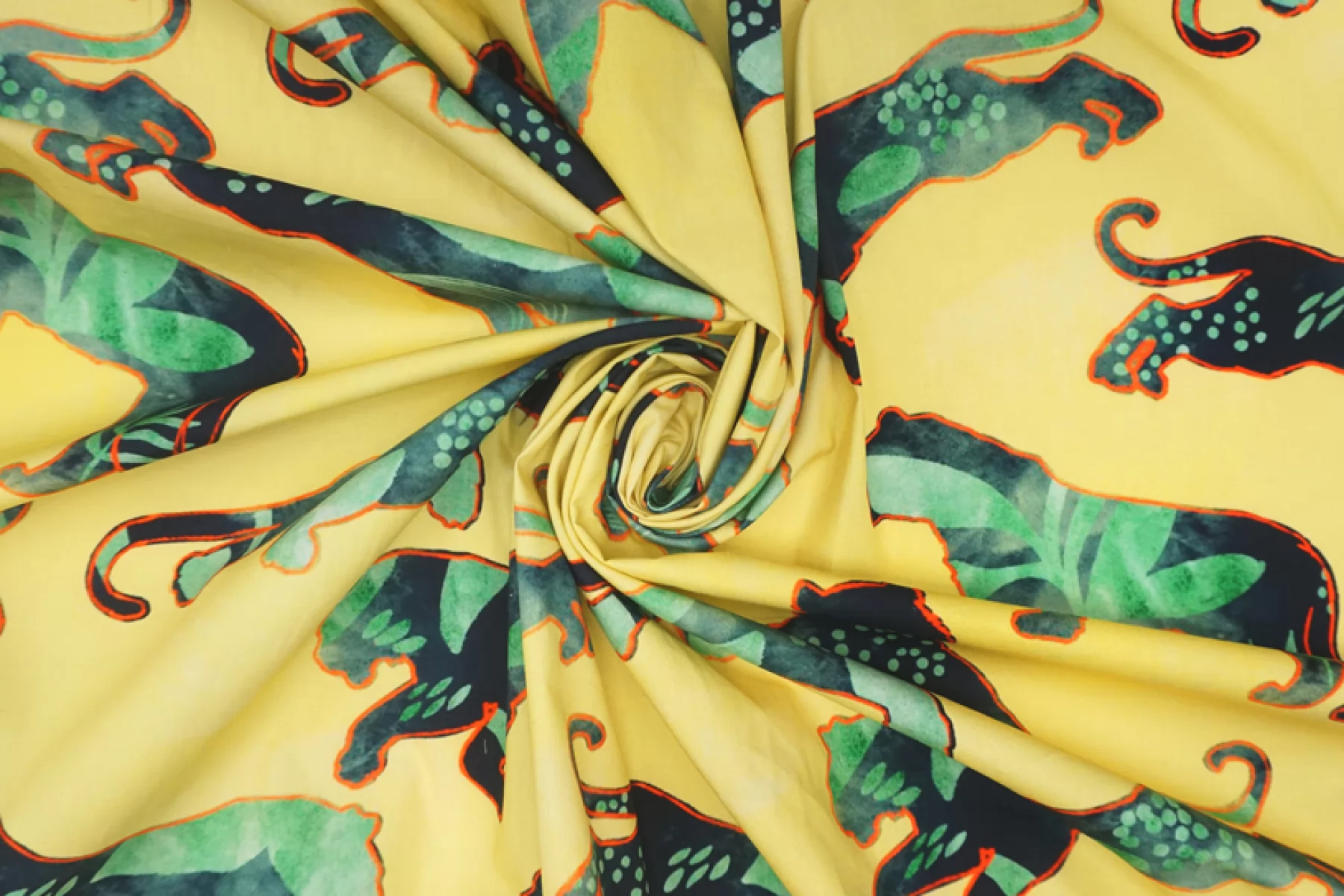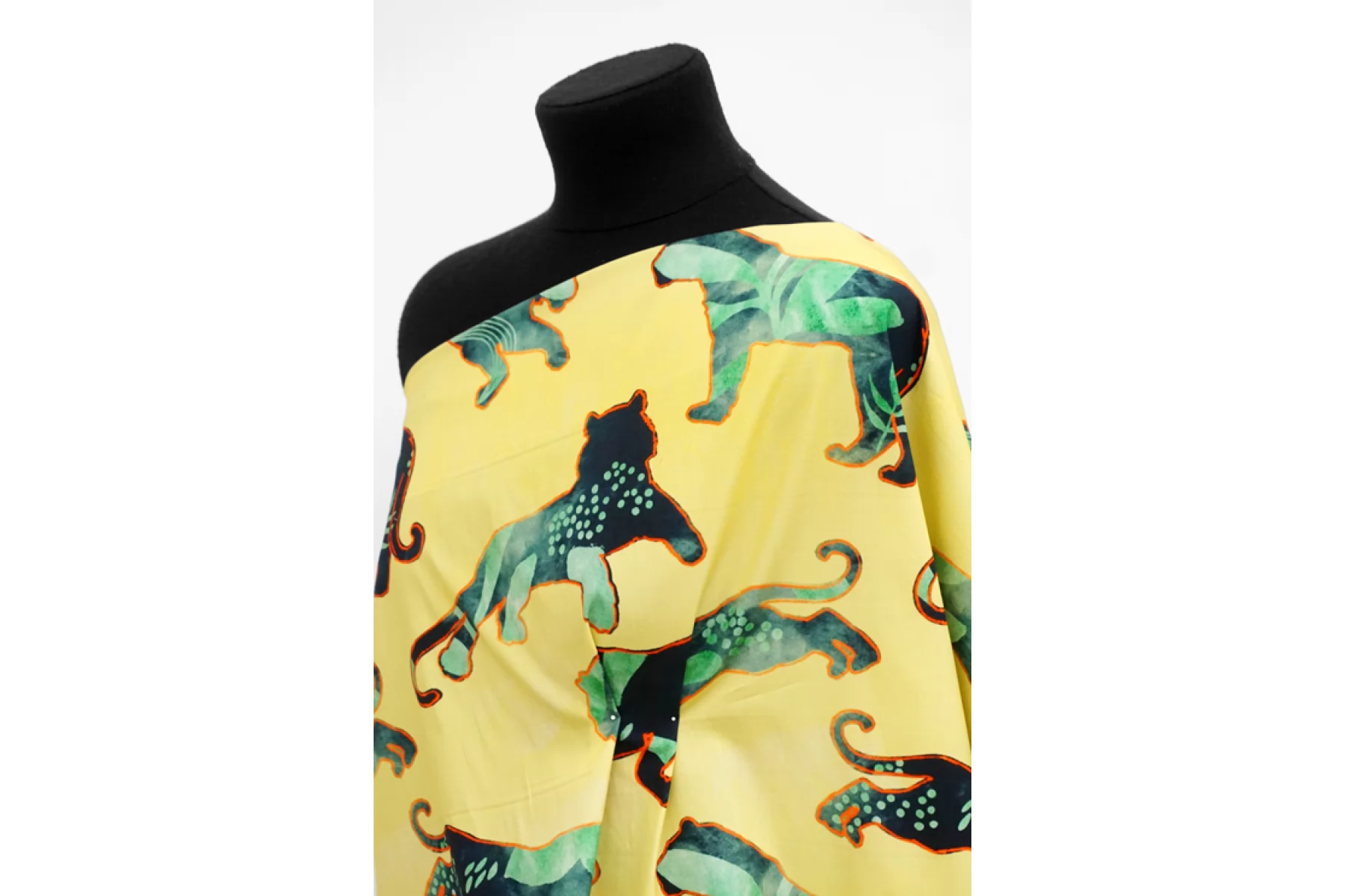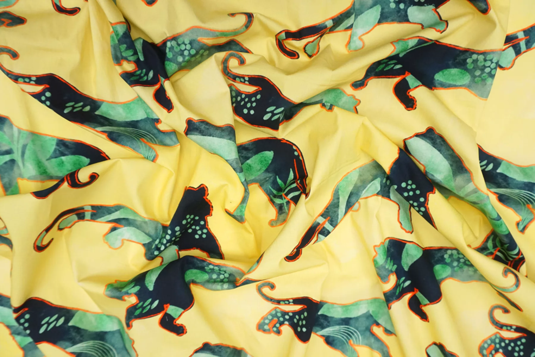 Необычная позиция - рубашечный хлопок с интересным и достаточно крупным принтом на желтом фоне в виде силуэтов хищников с ярким красным контуром, заполненных абстрактным тропическим фоном. Материал похрустывающий, не тянется, немного мнется. Тонкий, но плотный. Очень хорошо держит форму. Слегка заметен контур силуэта, если смотреть прямо на просвет. Отличный вариант на платья и рубашки.